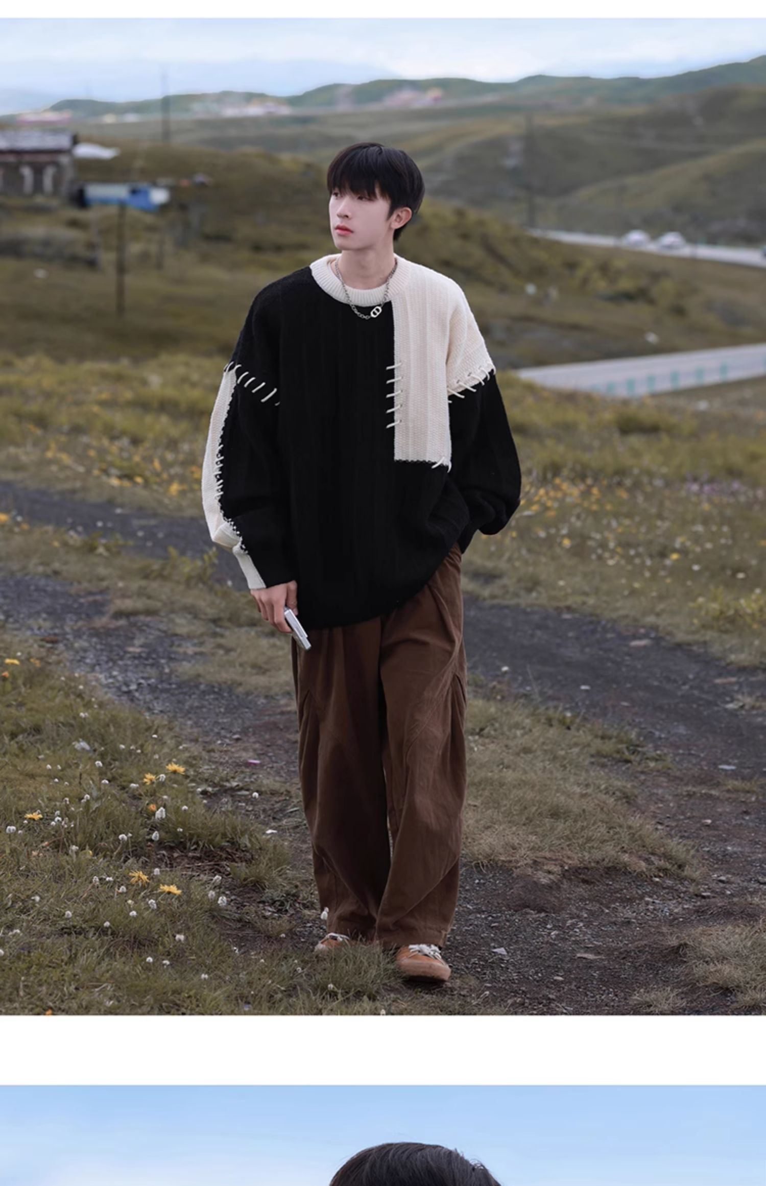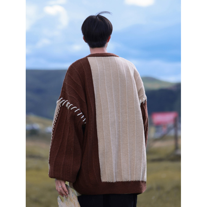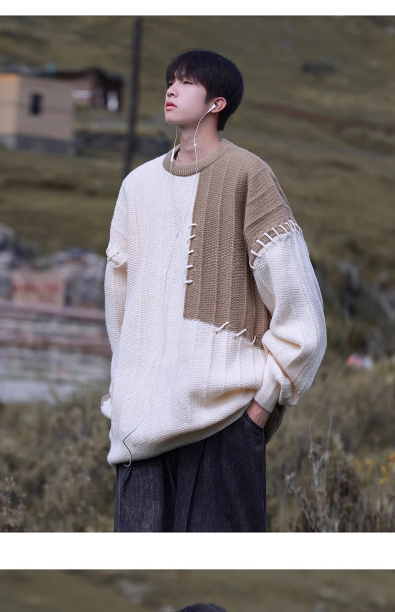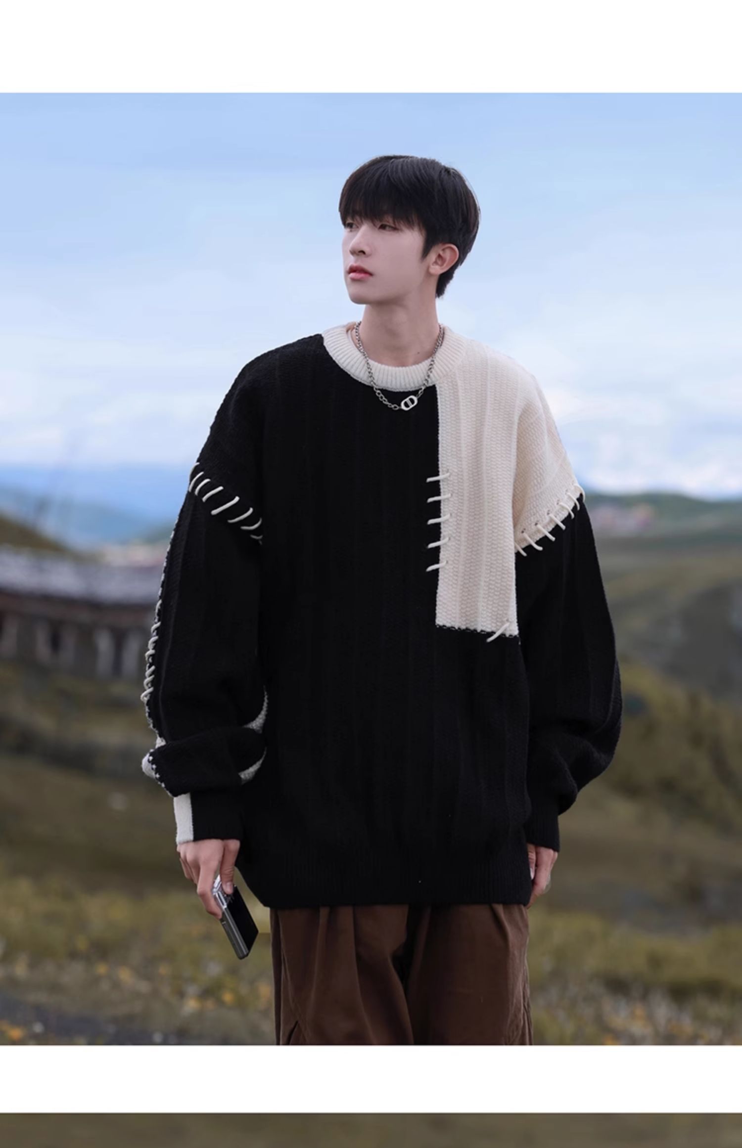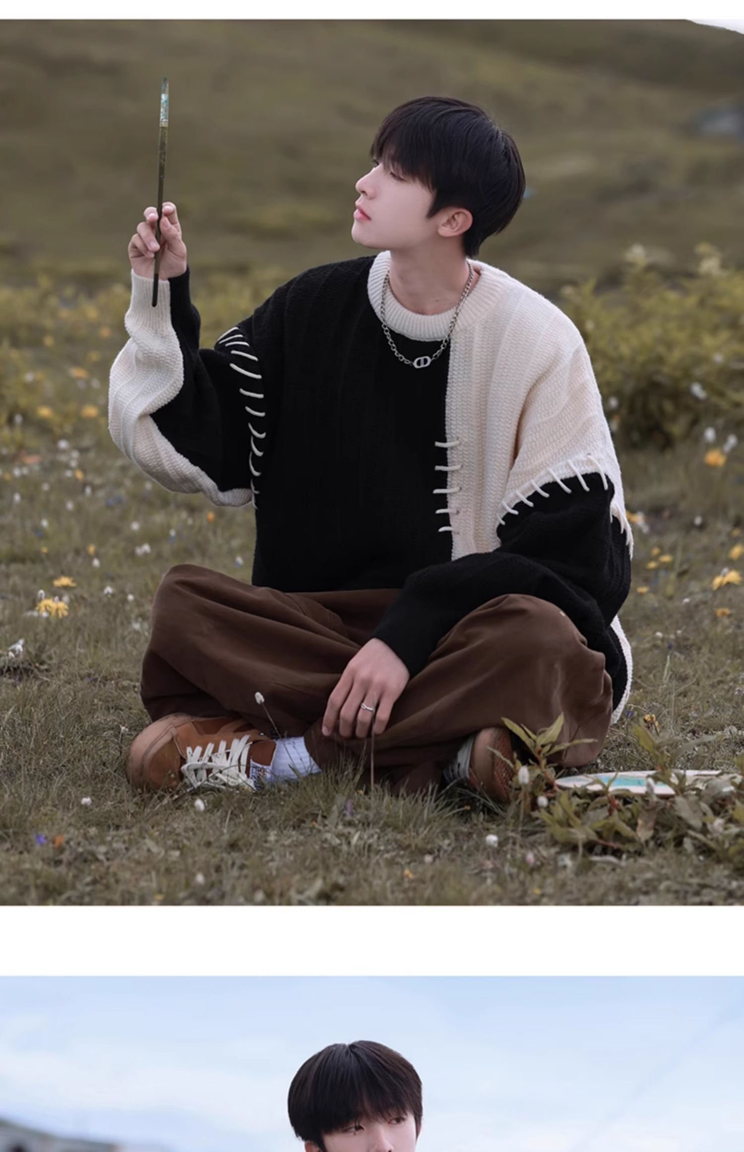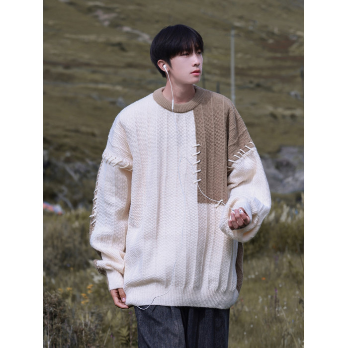 拼接撞色毛衣男生秋冬季潮牌寬松休閒慵懶風設計感小衆套頭針織衫
