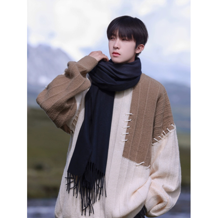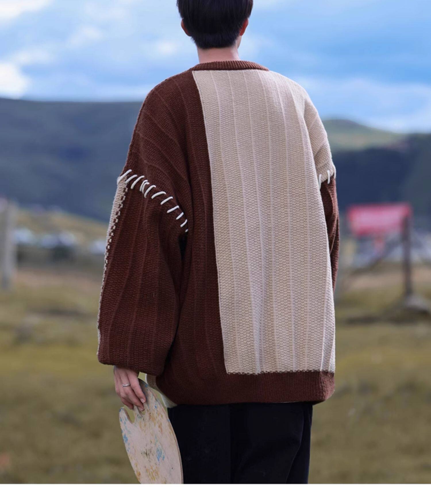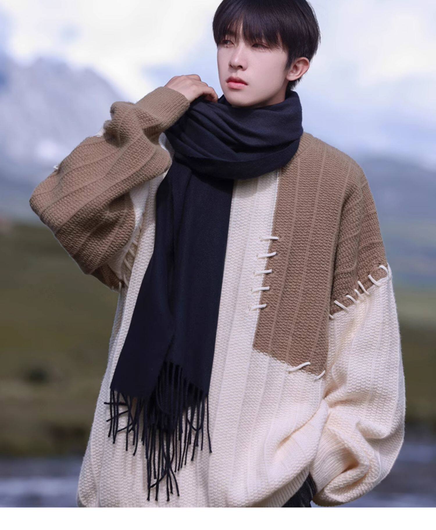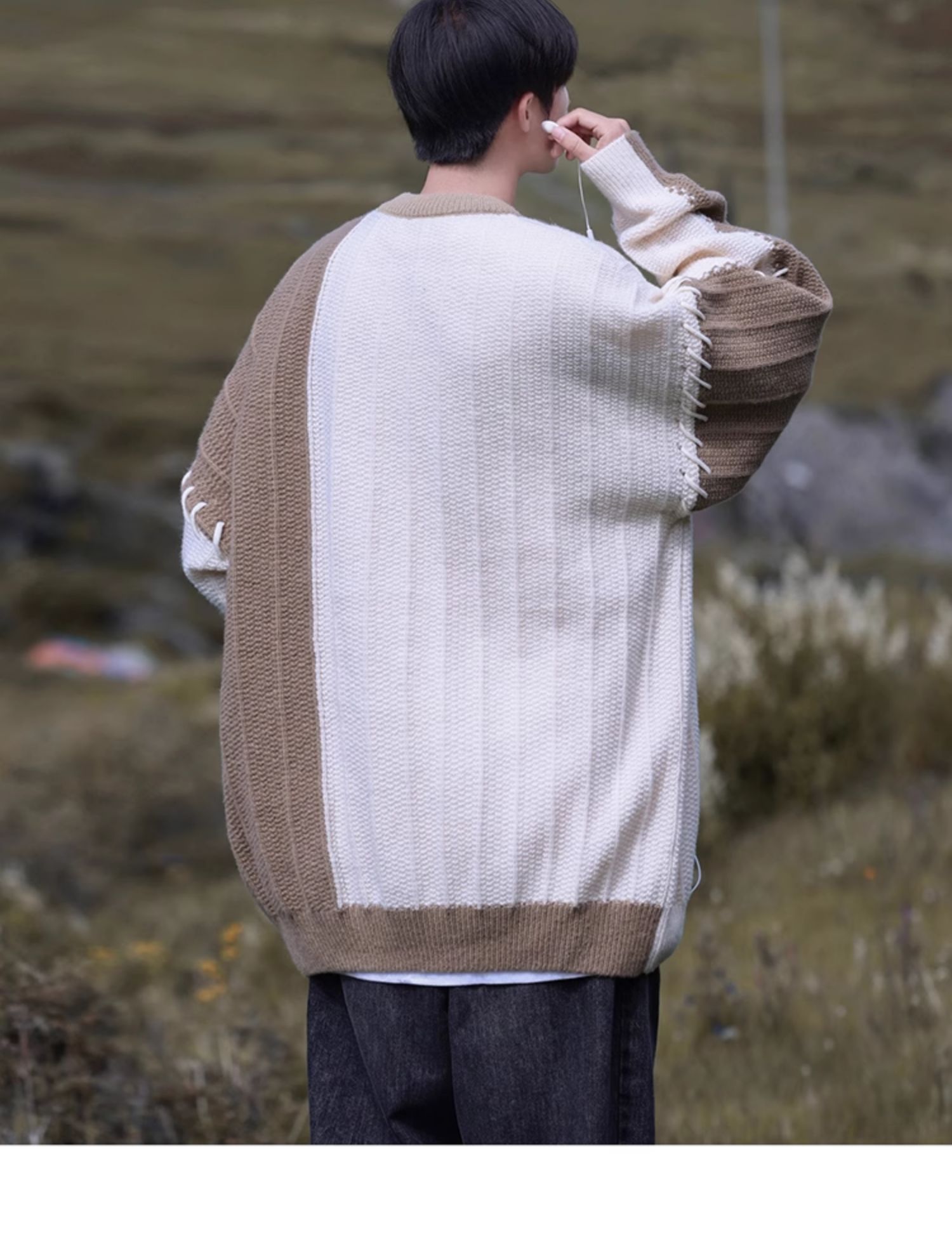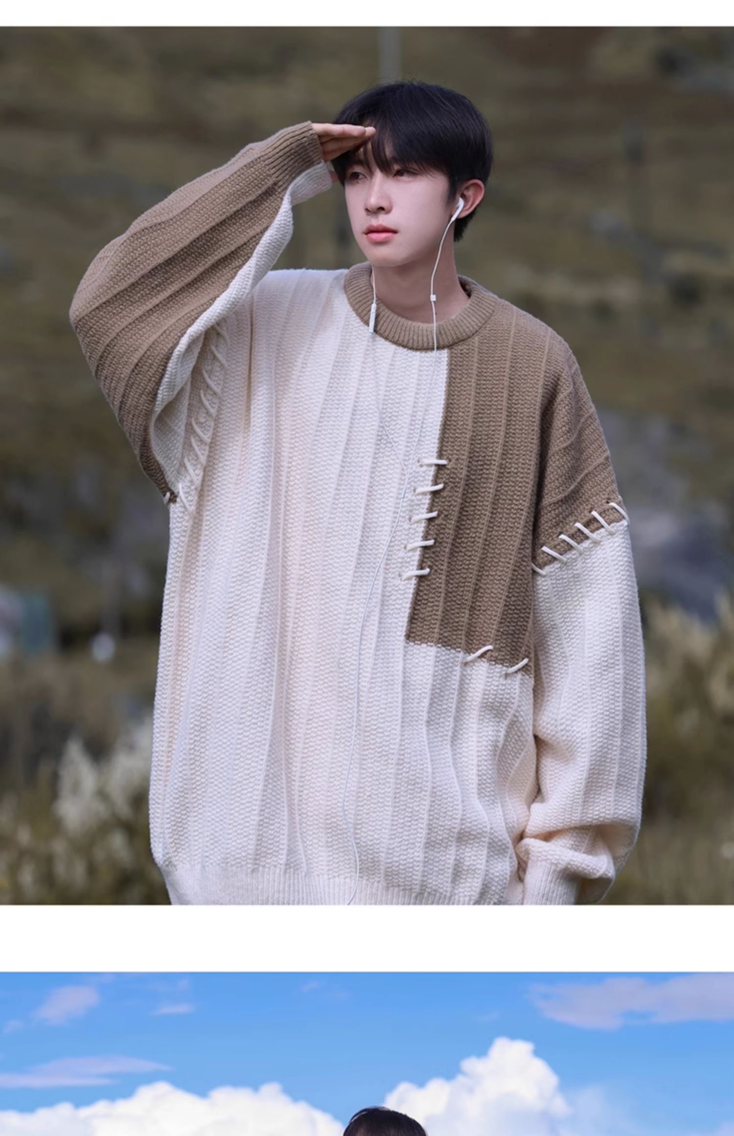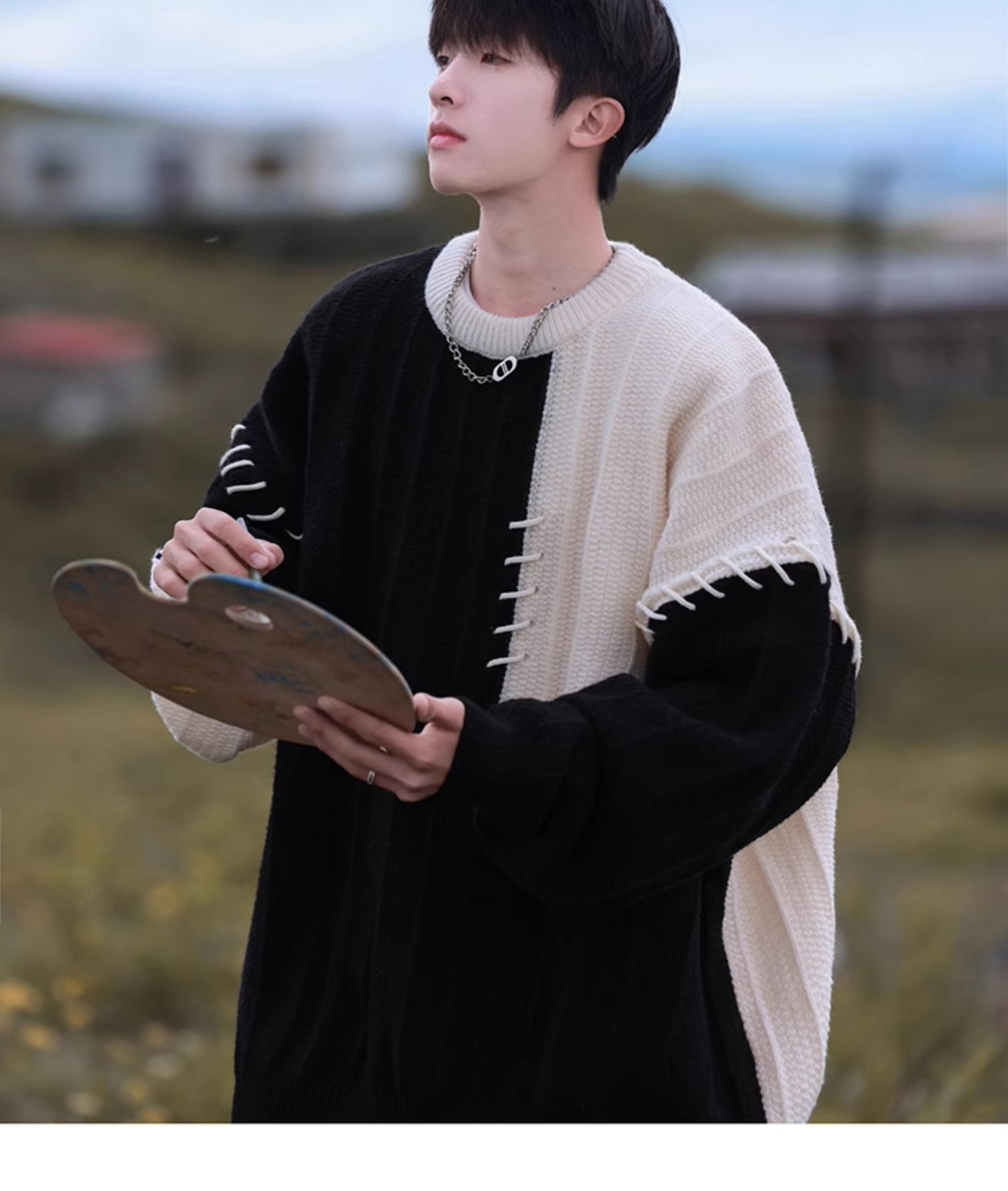 拼接撞色毛衣男生秋冬季潮牌寬松休閒慵懶風設計感小衆套頭針織衫