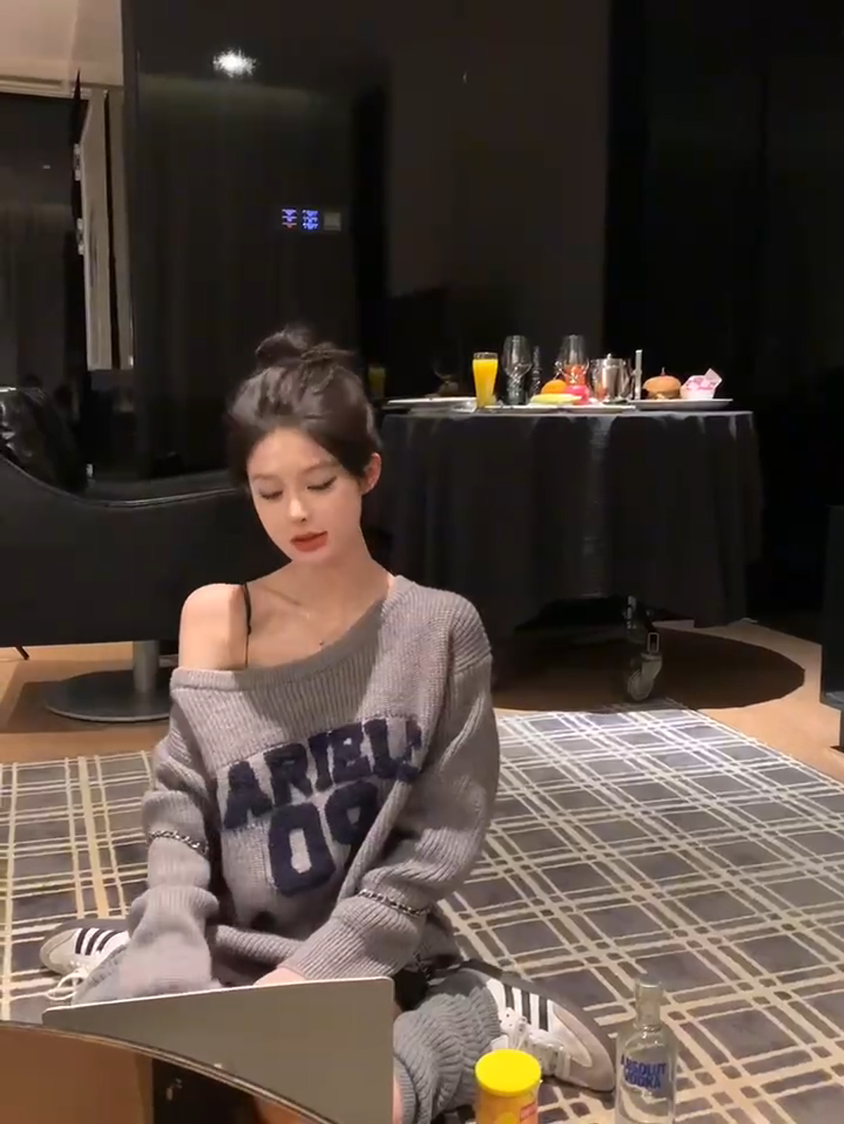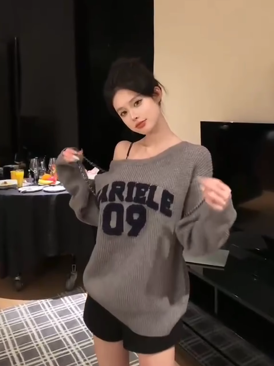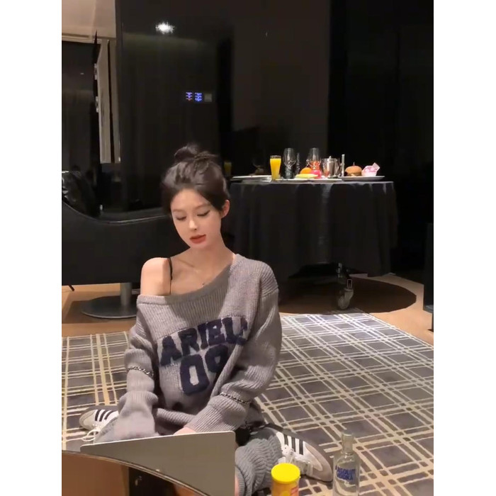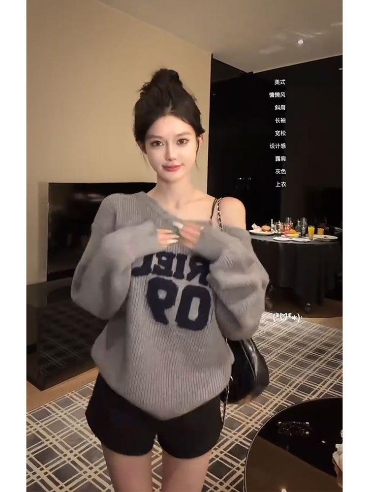美式甜酷風字母斜肩毛衣女秋冬慵懶風寬松純欲百搭復古針織衫上衣