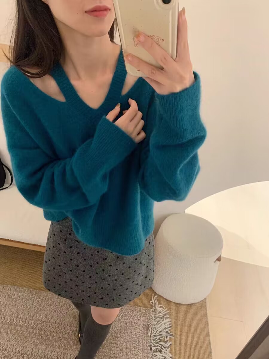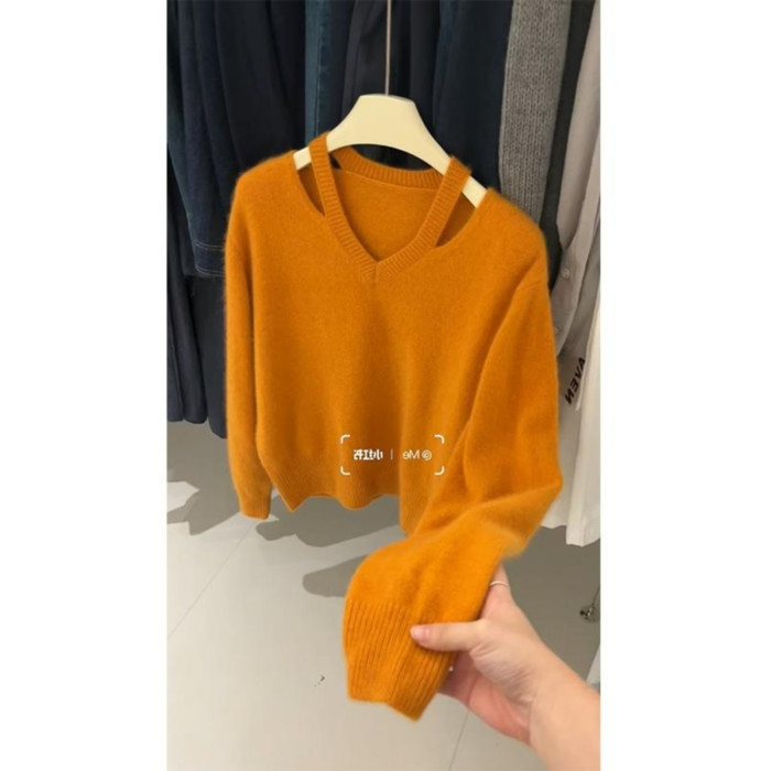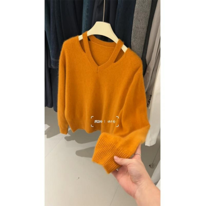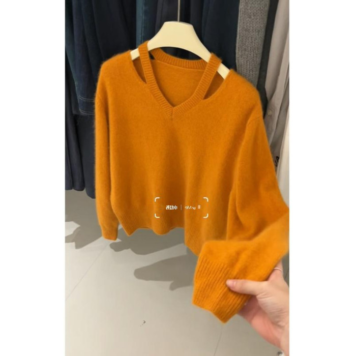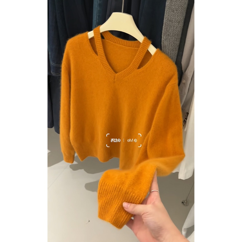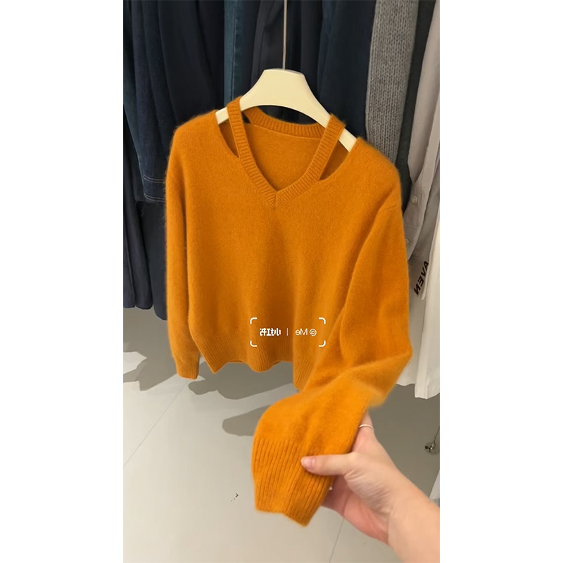 軟糯橘色毛衣女秋冬設計感露肩時尚溫柔風掛脖氣質套頭針織衫上衣