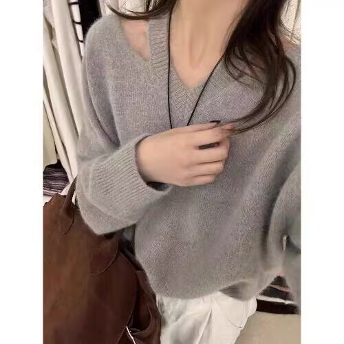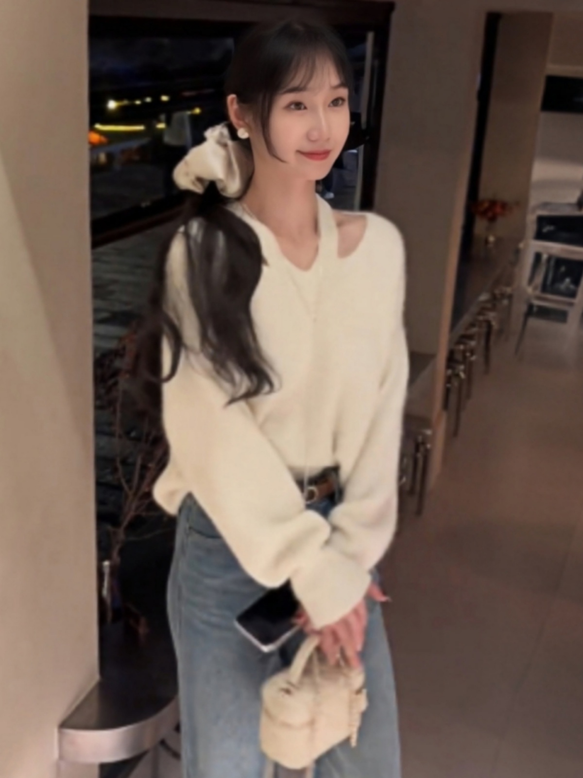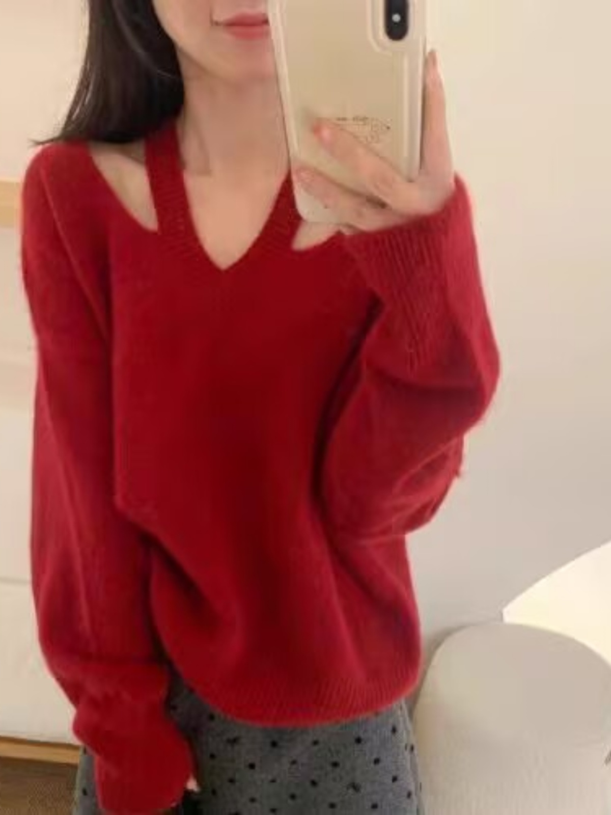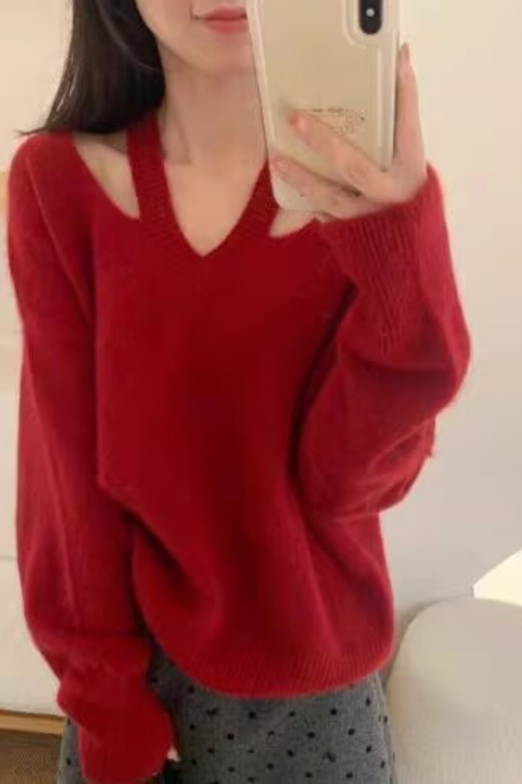 軟糯橘色毛衣女秋冬設計感露肩時尚溫柔風掛脖氣質套頭針織衫上衣