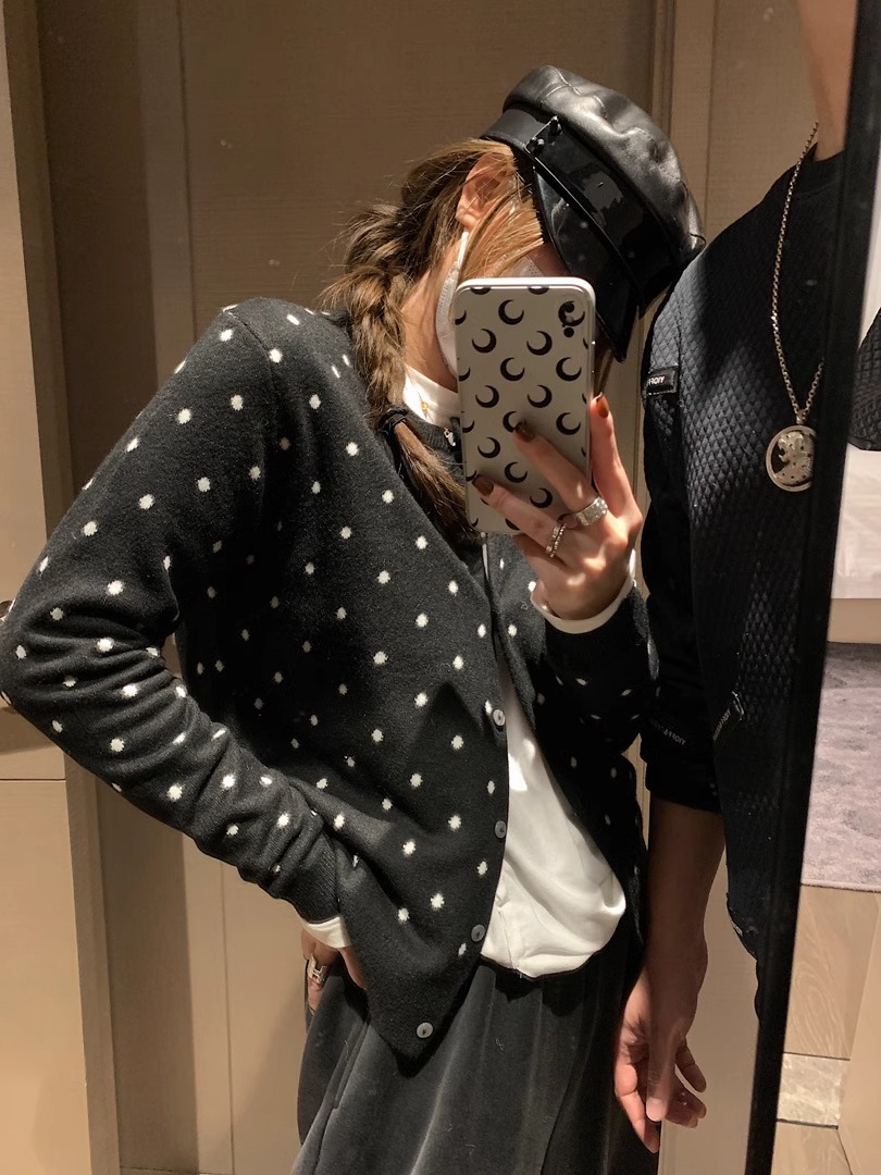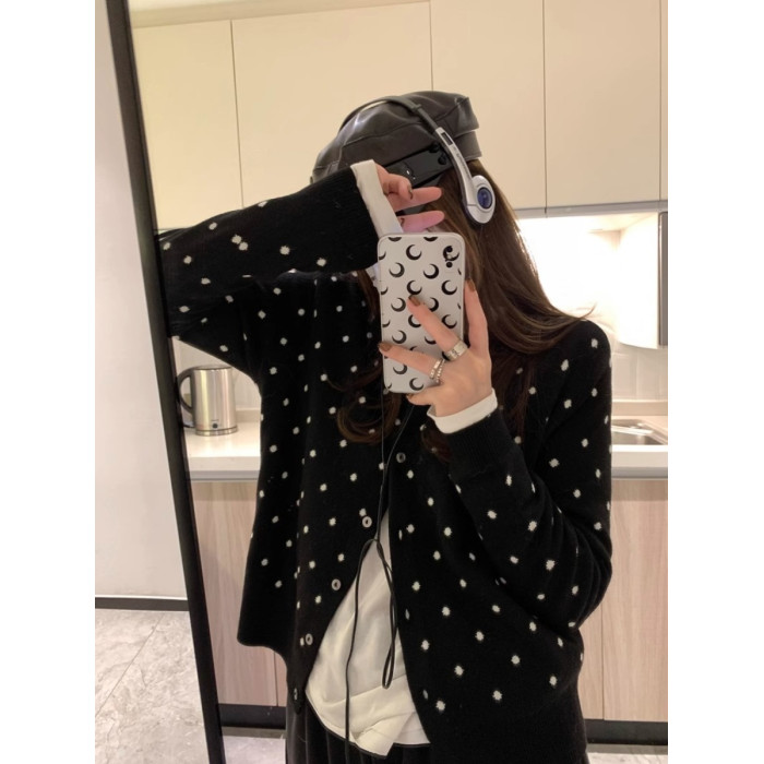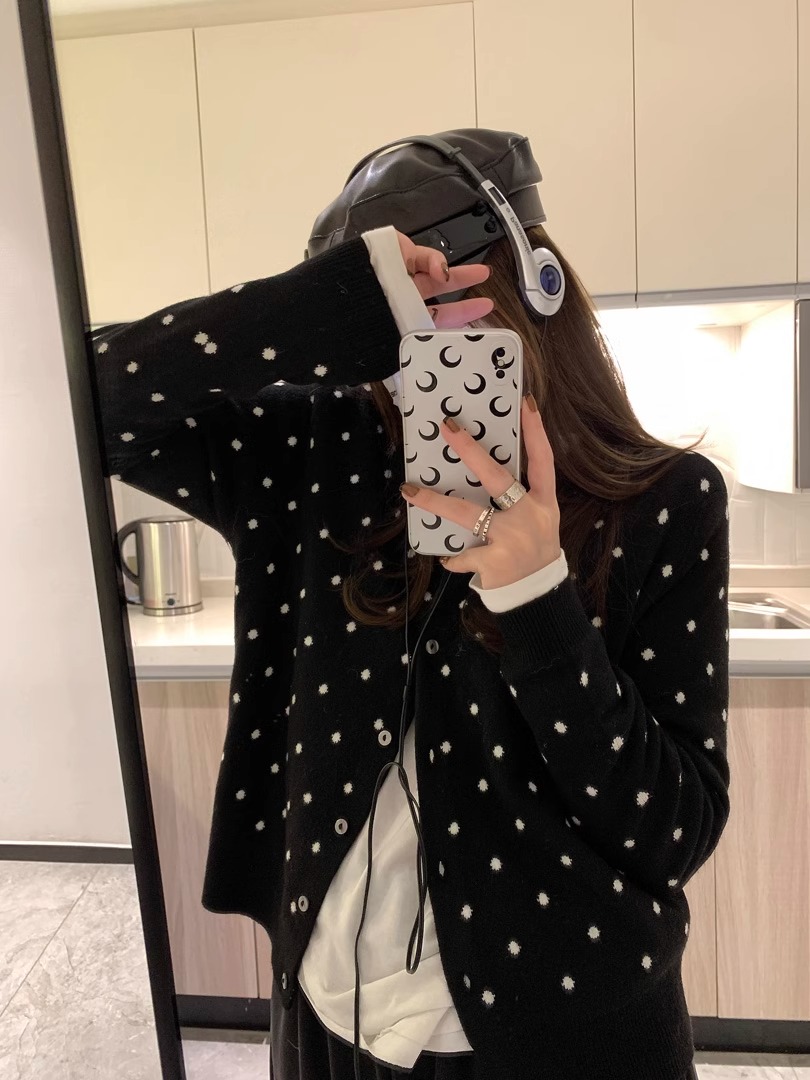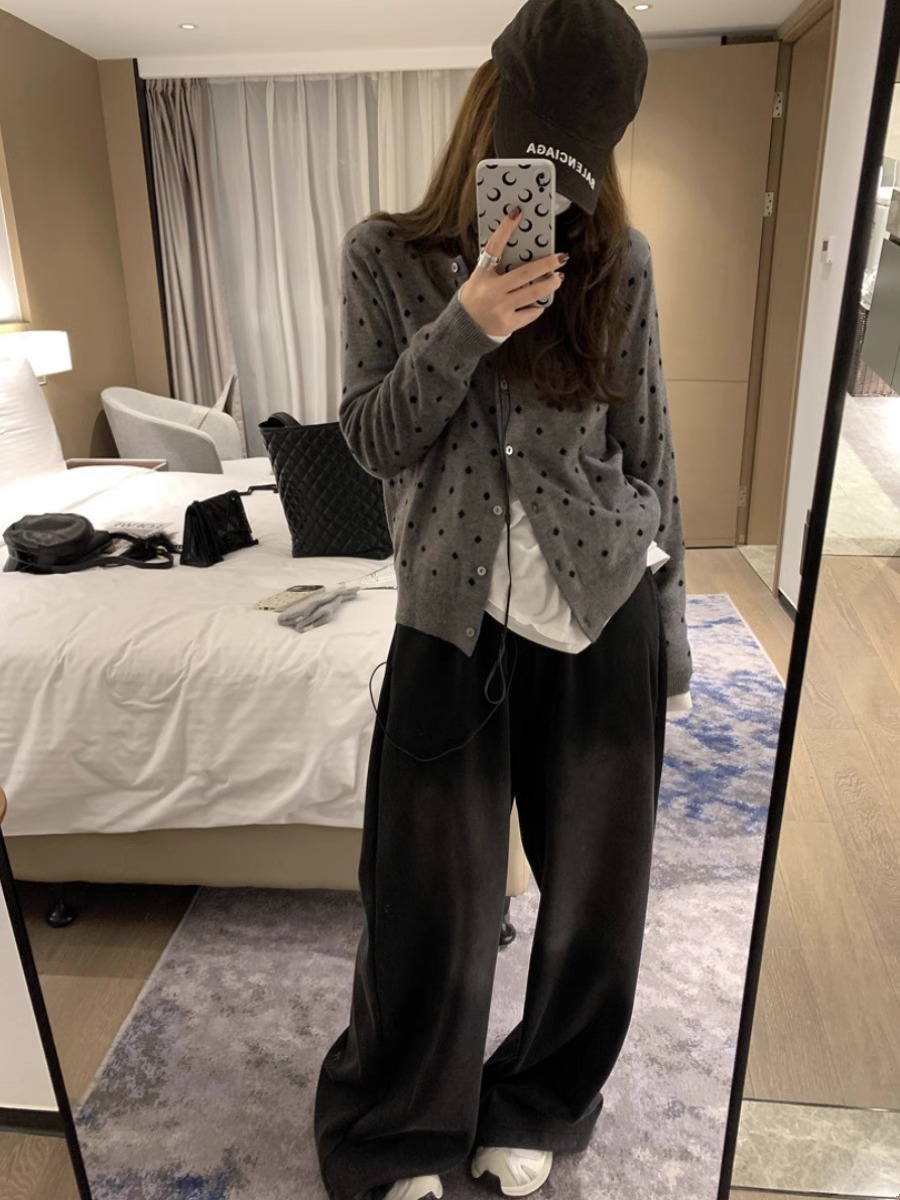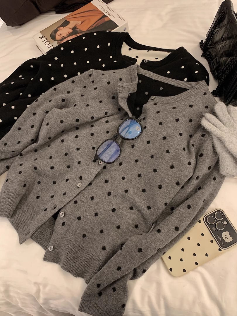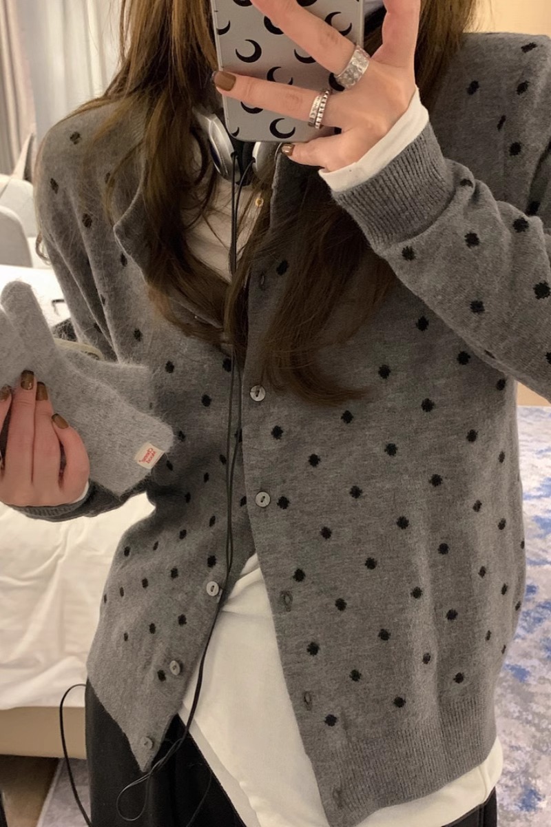 灰色波點圓領針織開衫女秋冬2024新款曡穿設計感百搭顯瘦長袖上衣