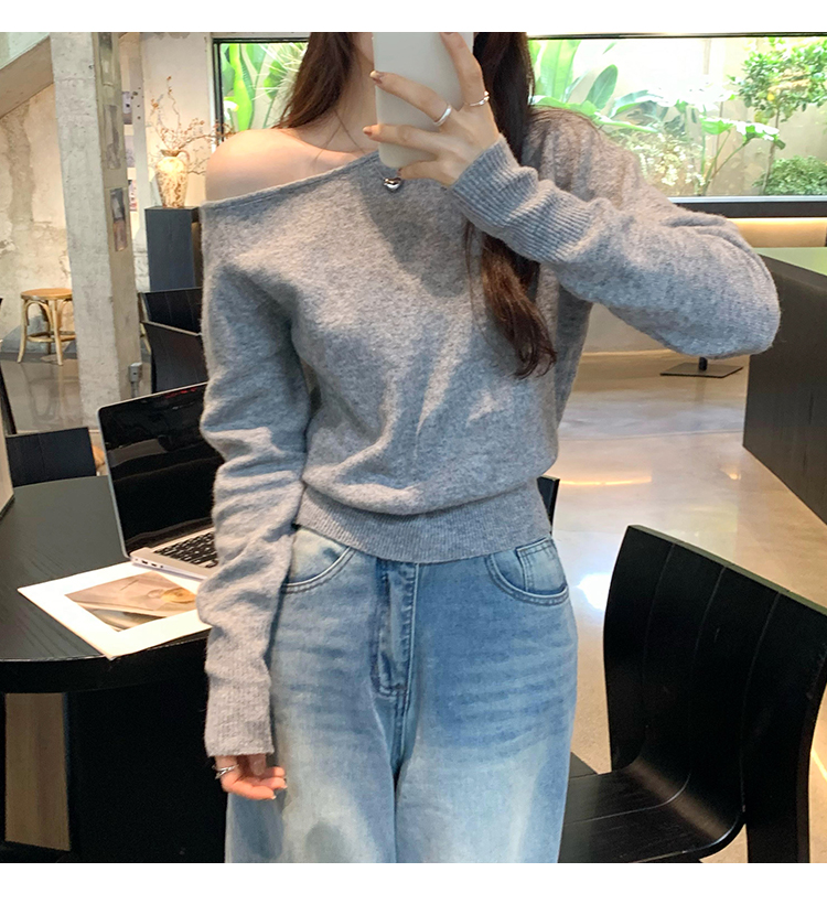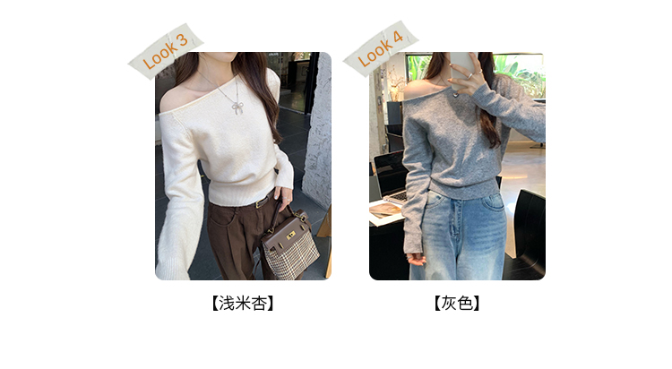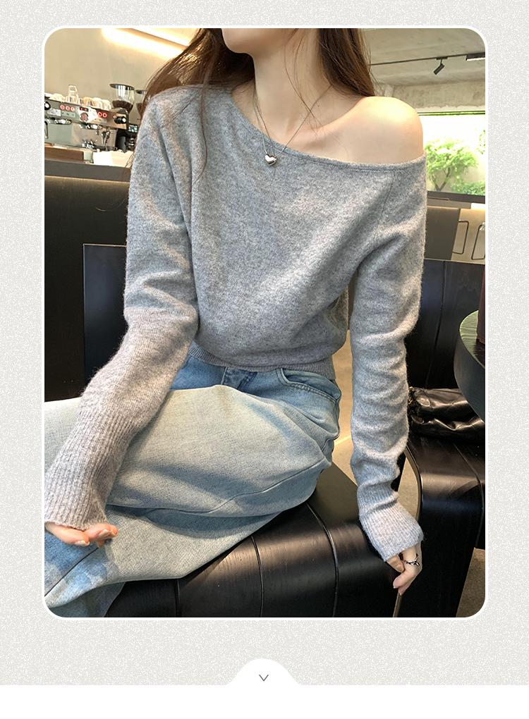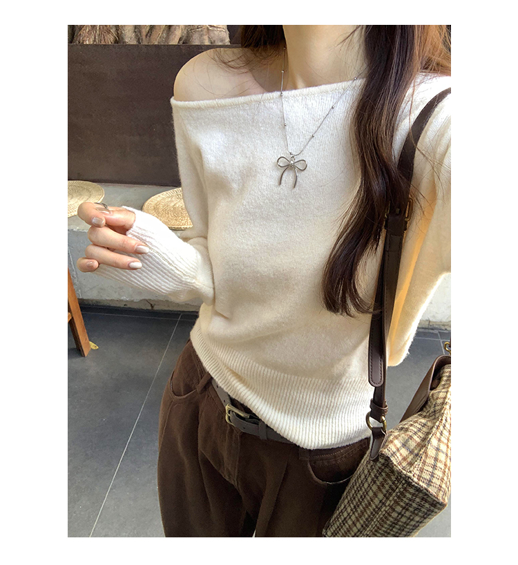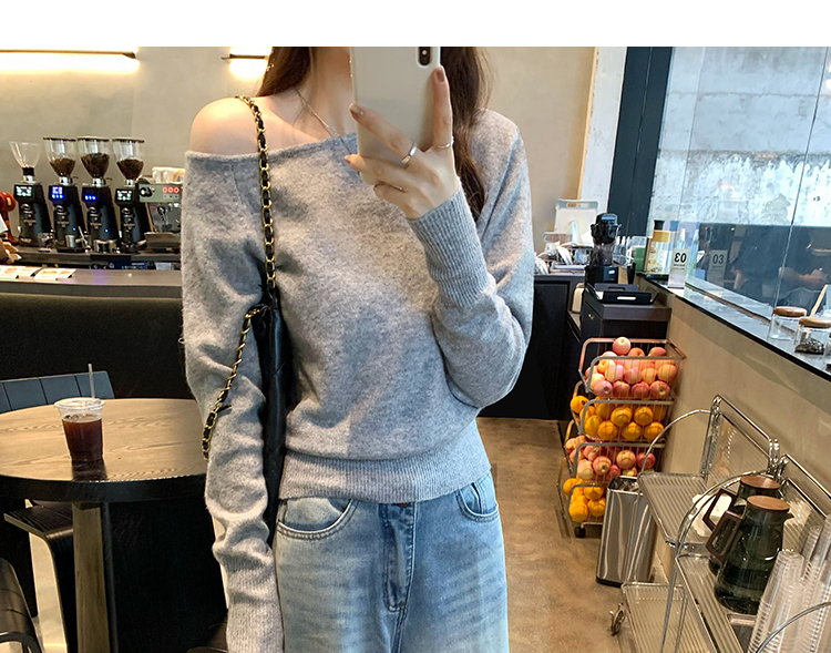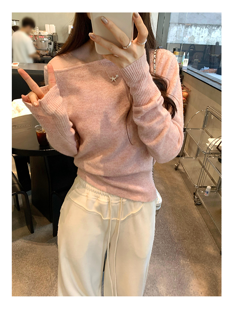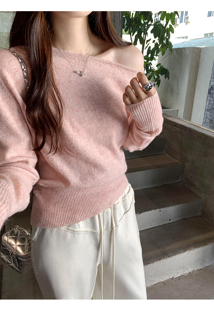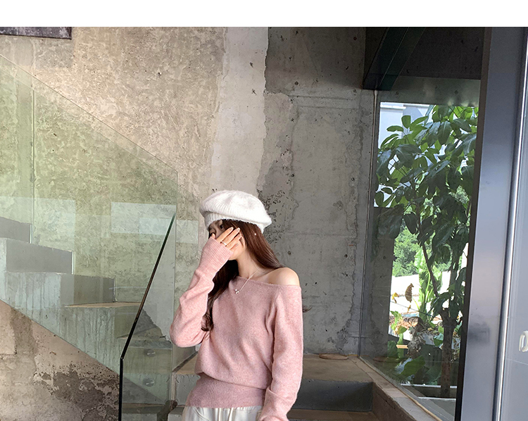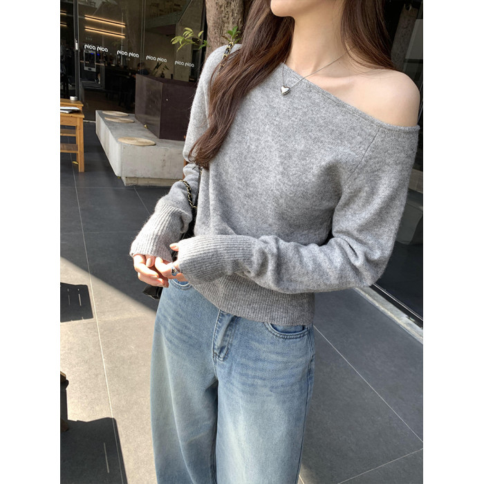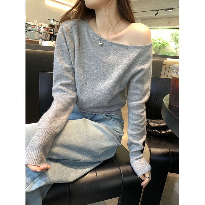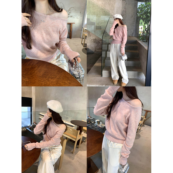 高級感粉色一字肩斜肩灰色針織打底衫毛衣女冬新款長袖露肩小上衣