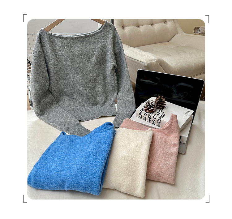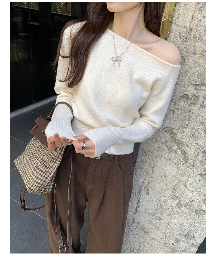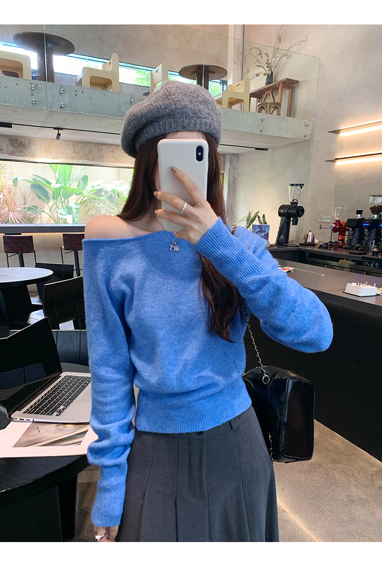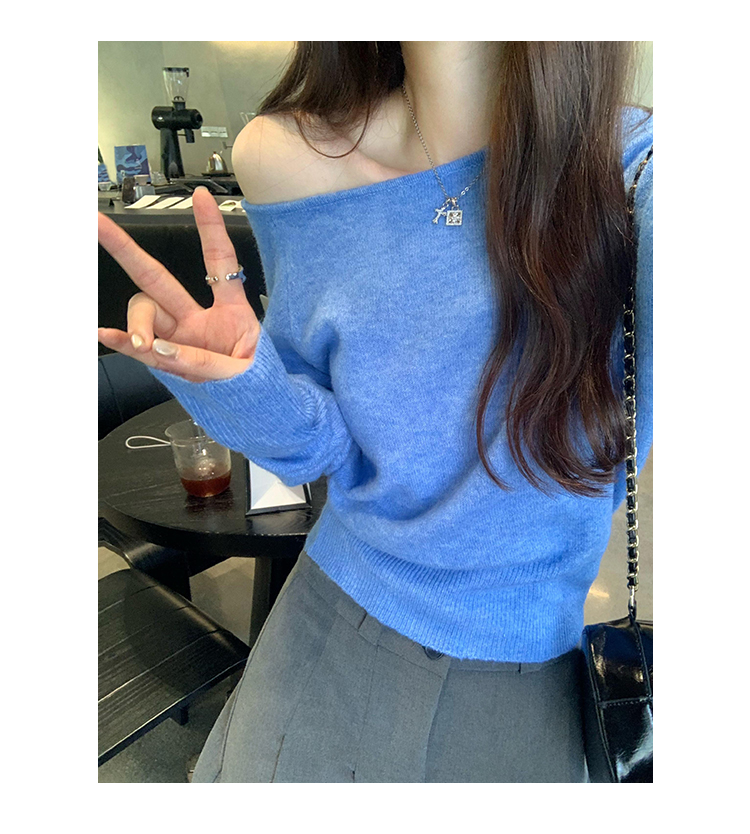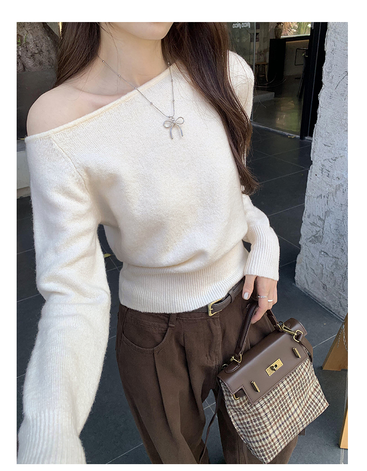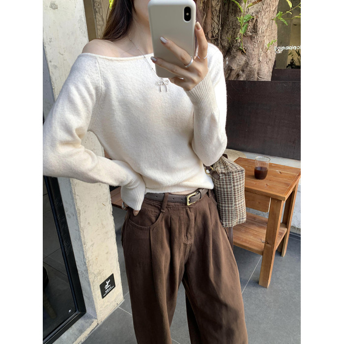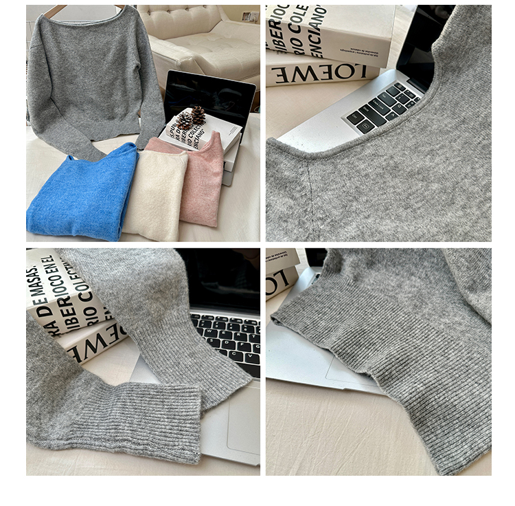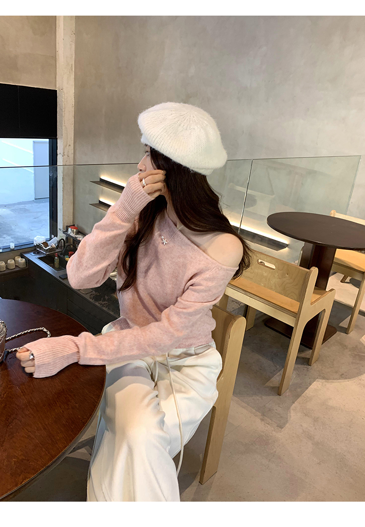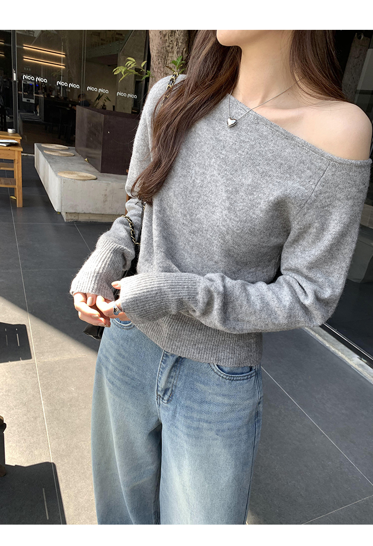 高級感粉色一字肩斜肩灰色針織打底衫毛衣女冬新款長袖露肩小上衣