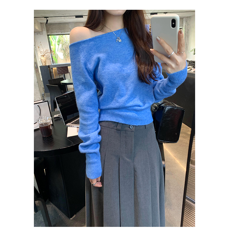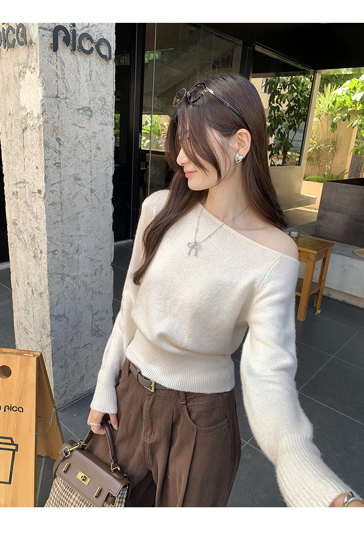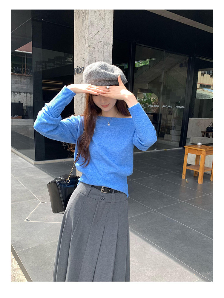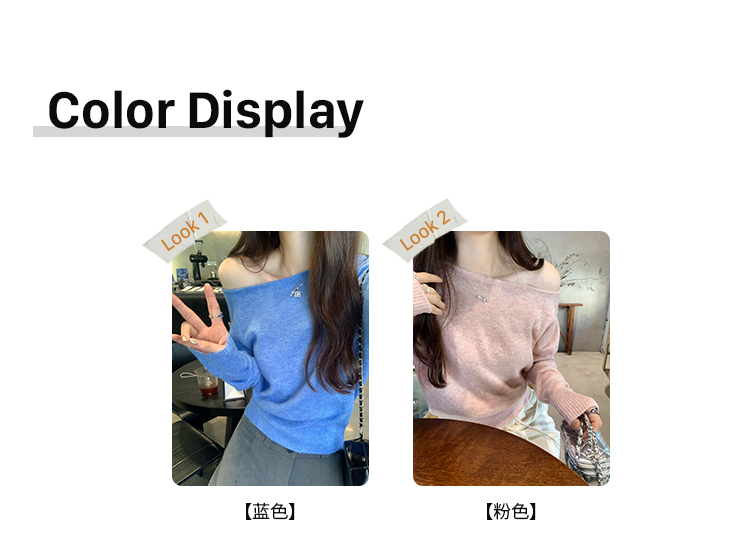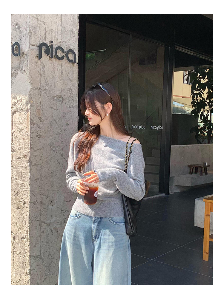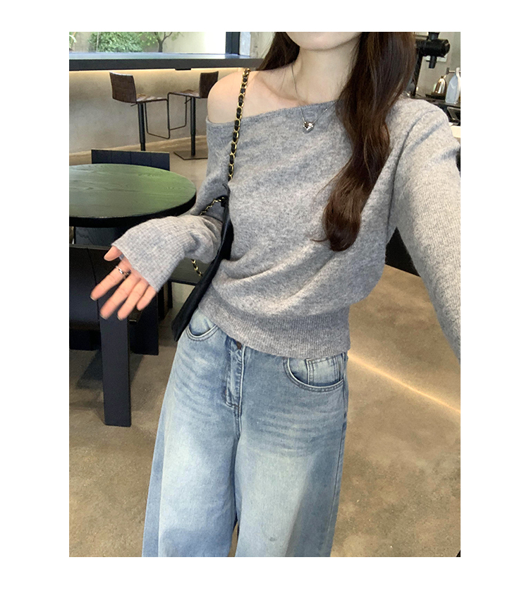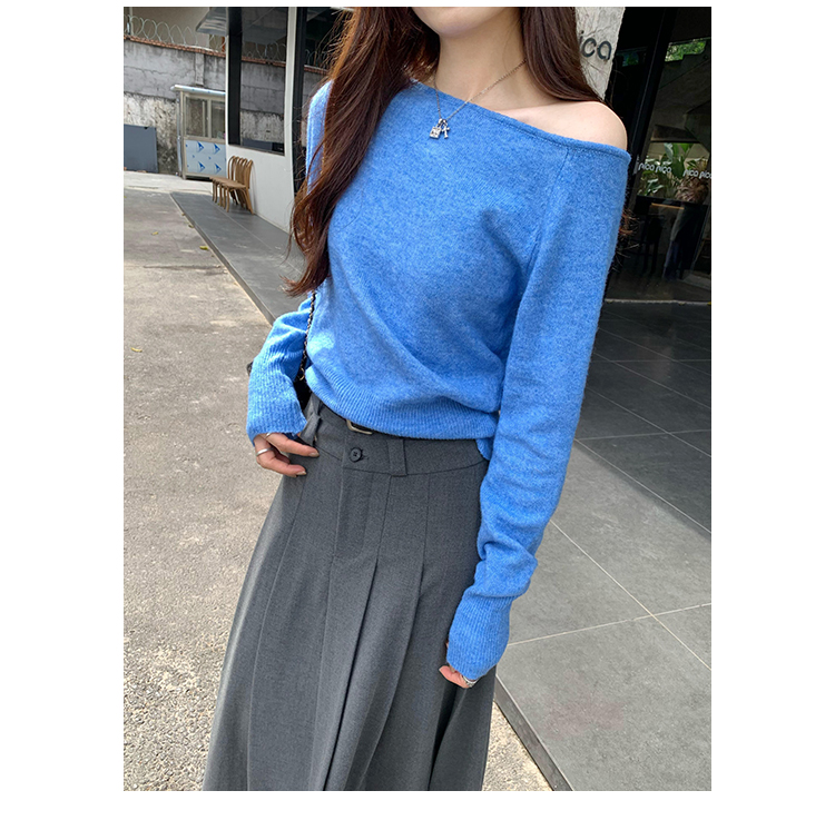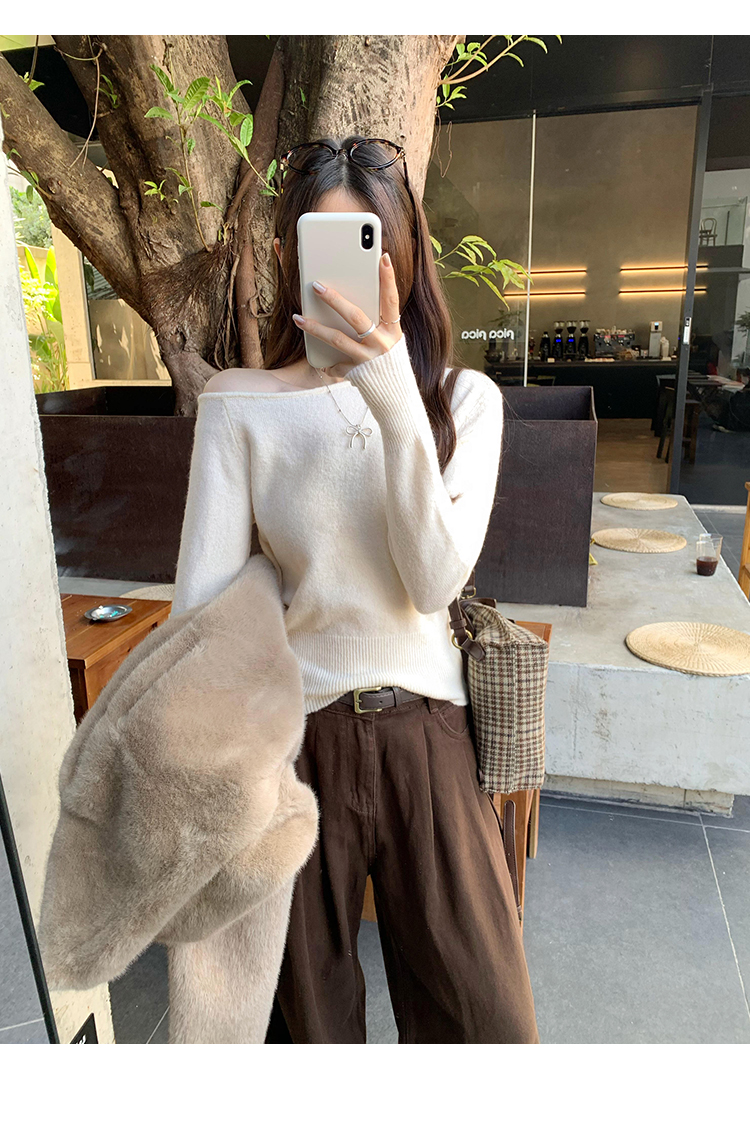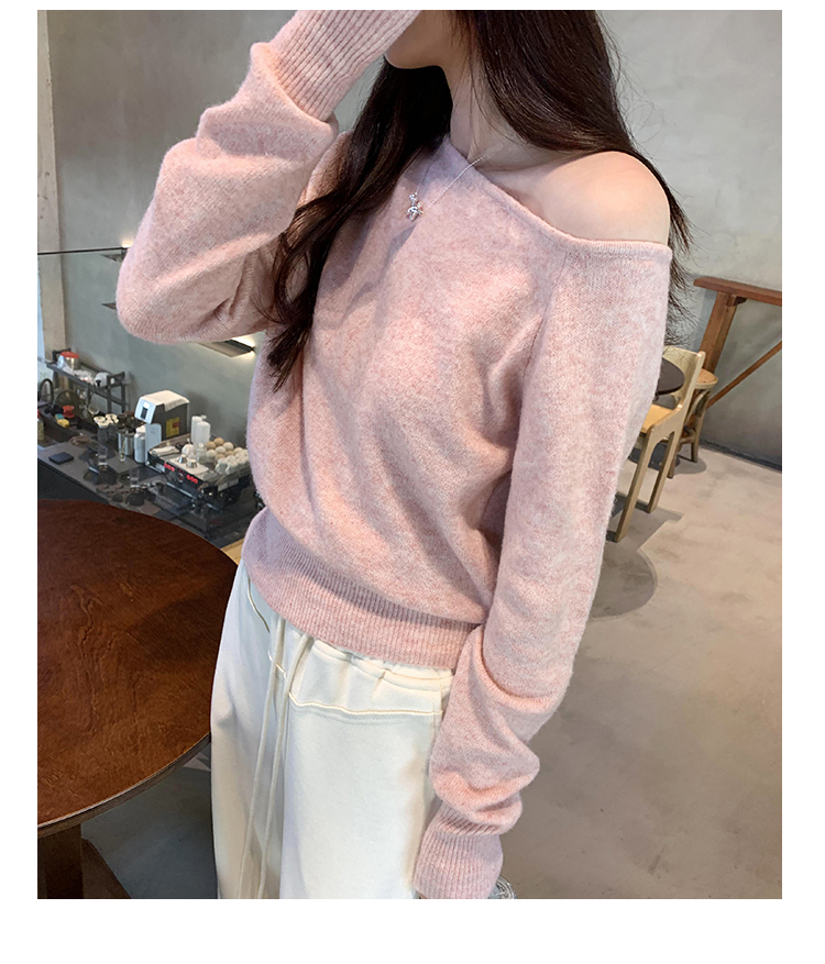 高級感粉色一字肩斜肩灰色針織打底衫毛衣女冬新款長袖露肩小上衣
