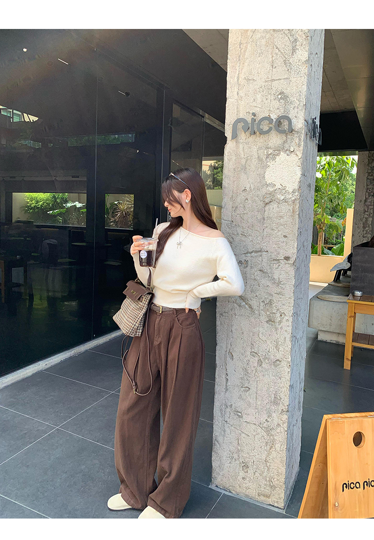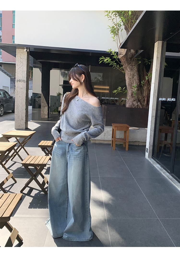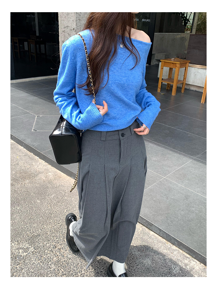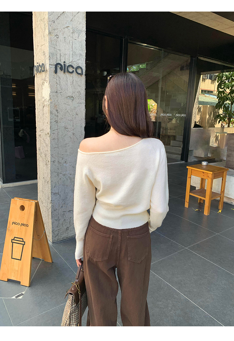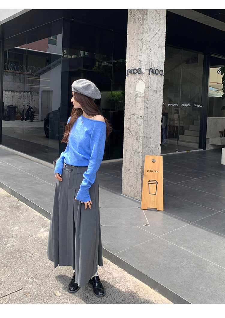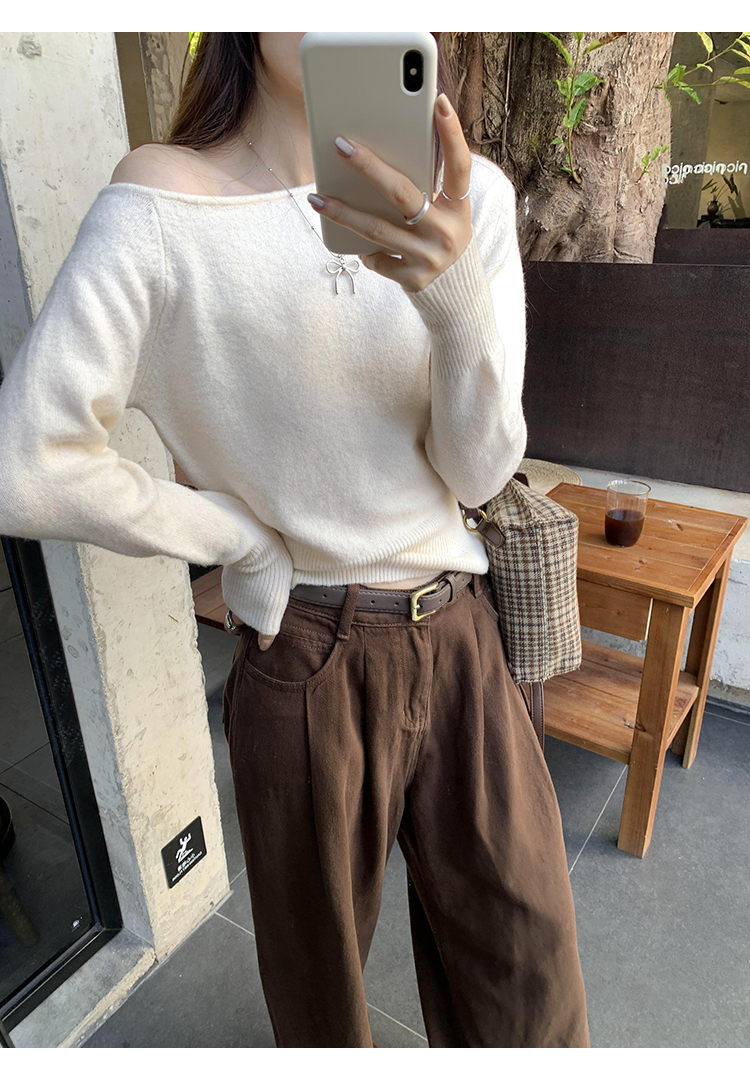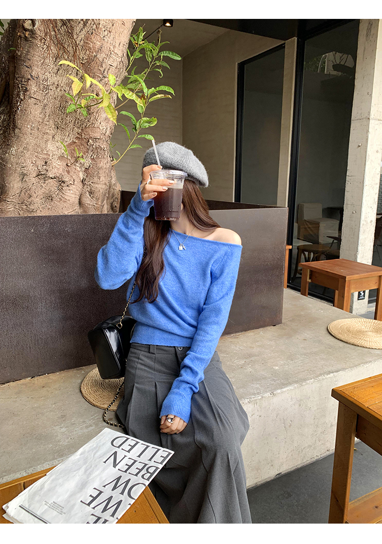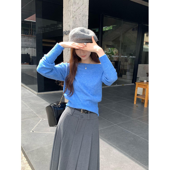 高級感粉色一字肩斜肩灰色針織打底衫毛衣女冬新款長袖露肩小上衣