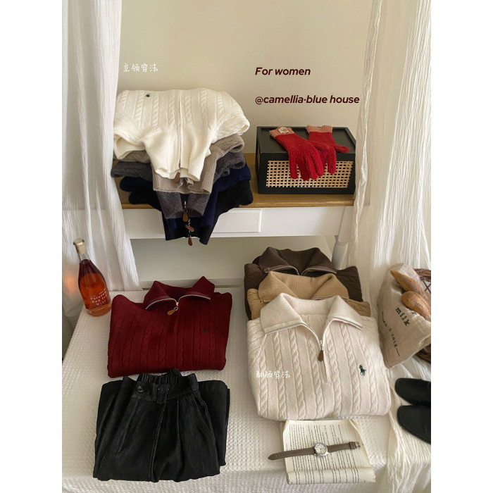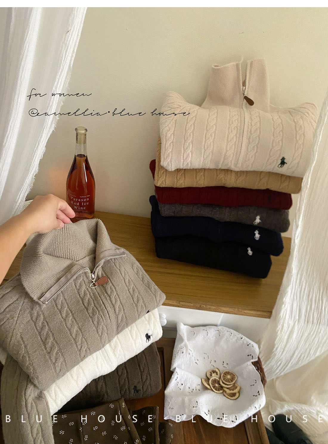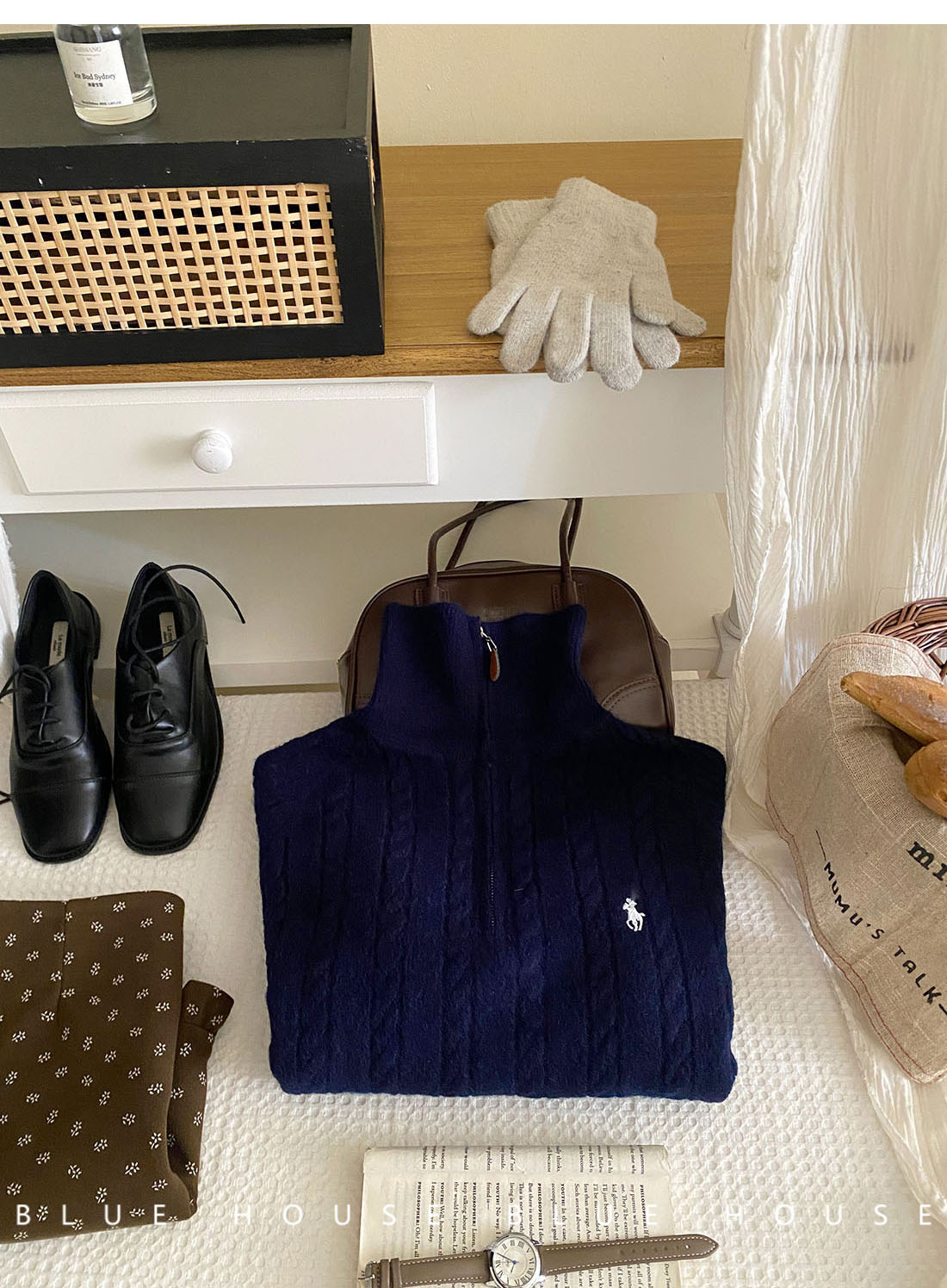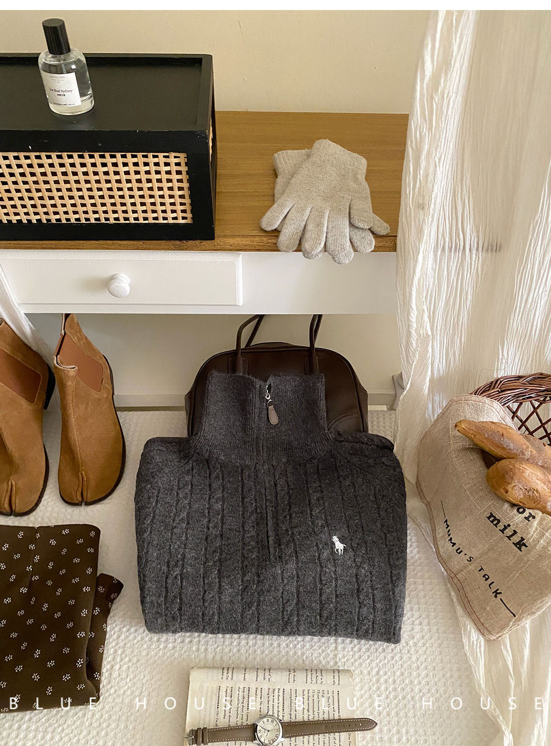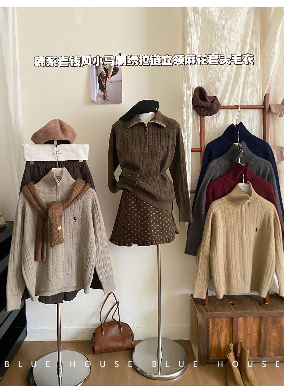 韓系復古麻花半拉鍊立領毛衣女秋冬小刺綉休閒百搭套頭針織衫上衣