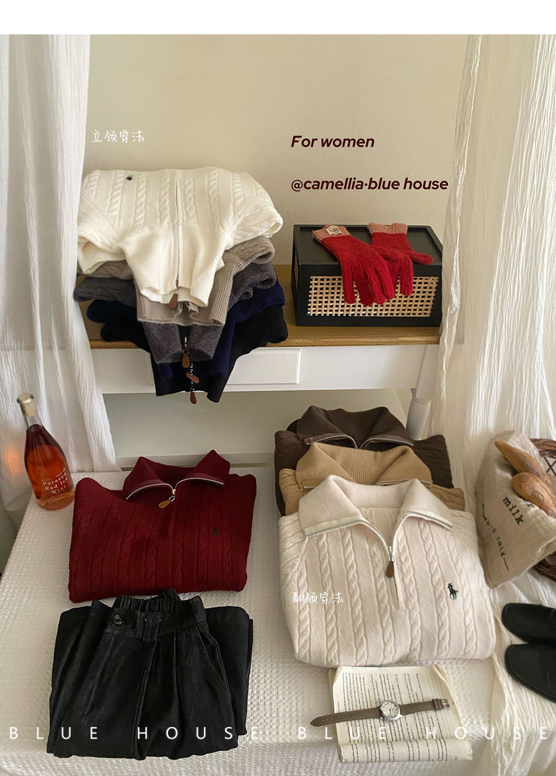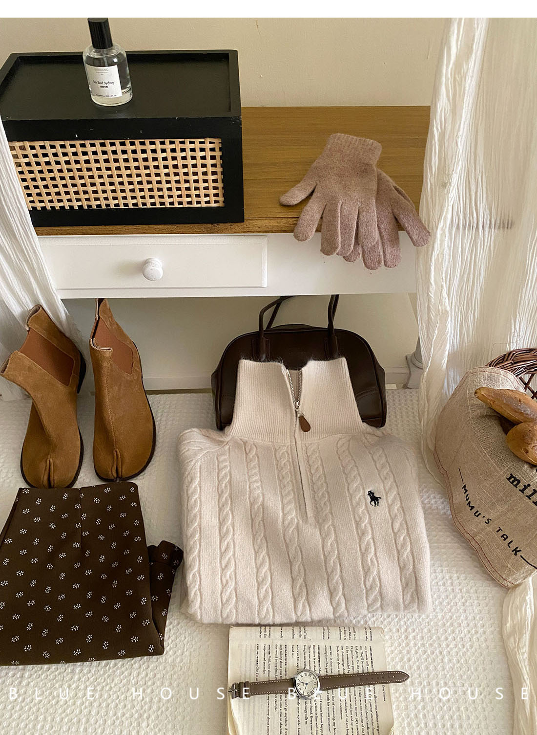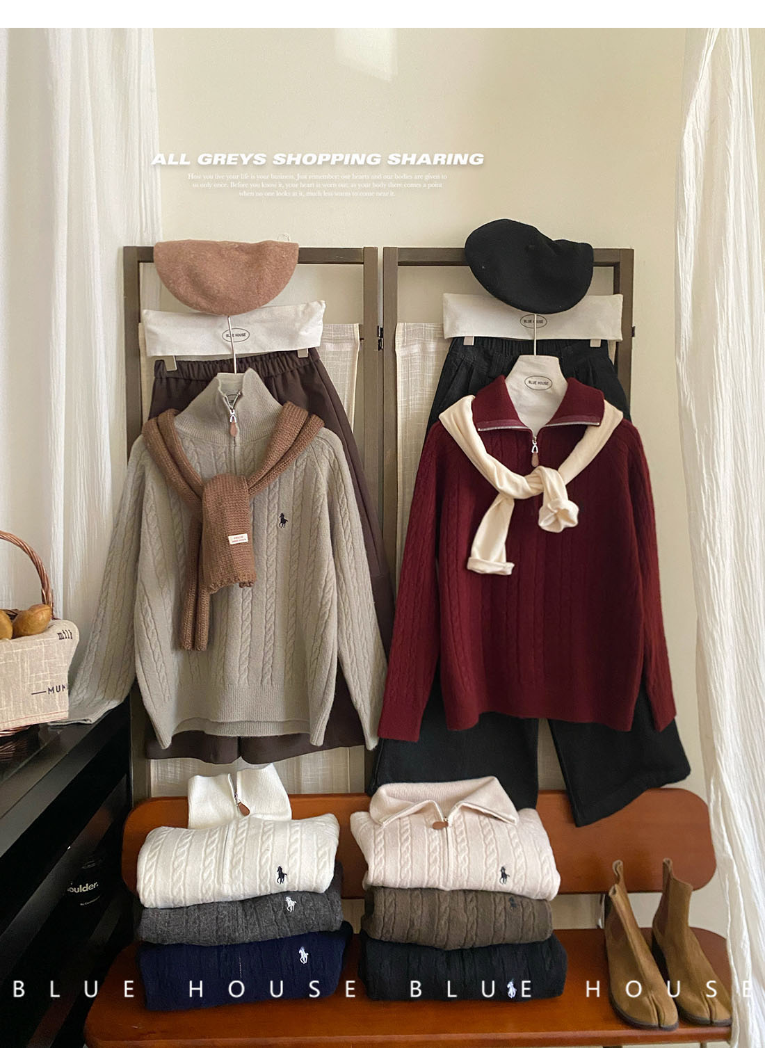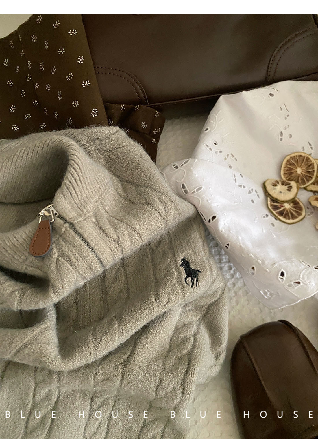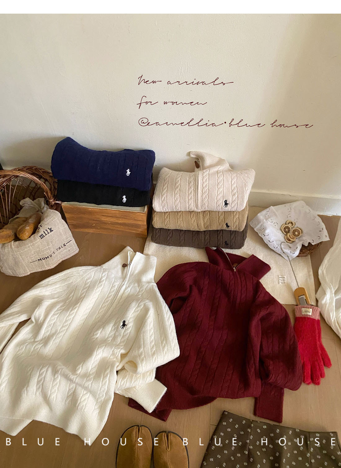 韓系復古麻花半拉鍊立領毛衣女秋冬小刺綉休閒百搭套頭針織衫上衣