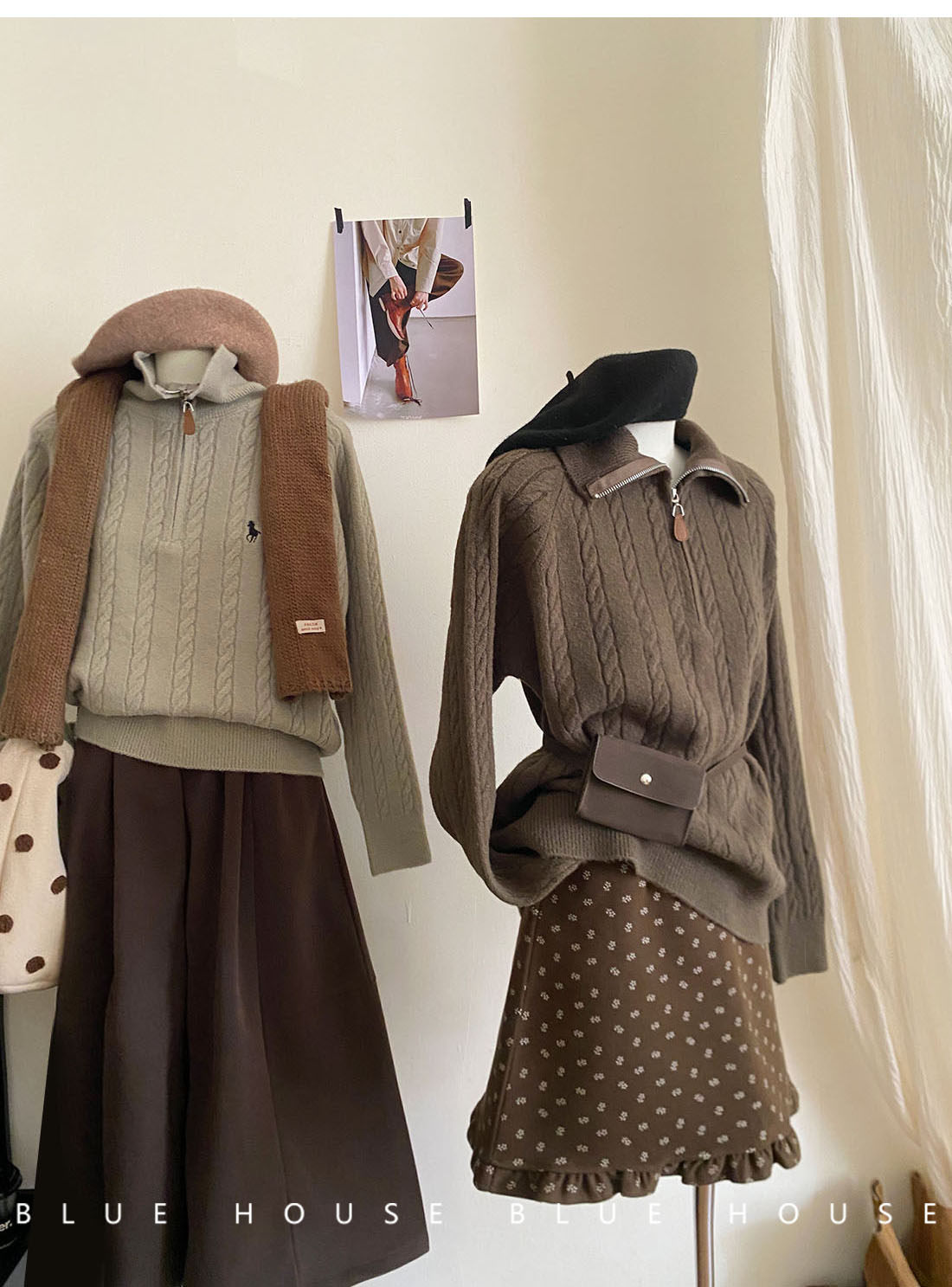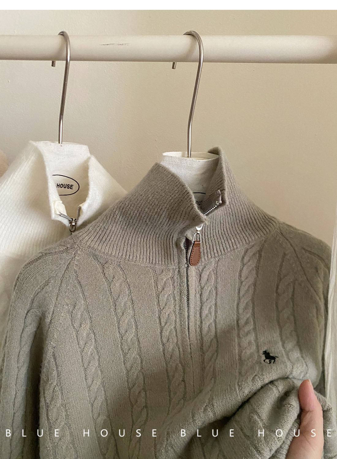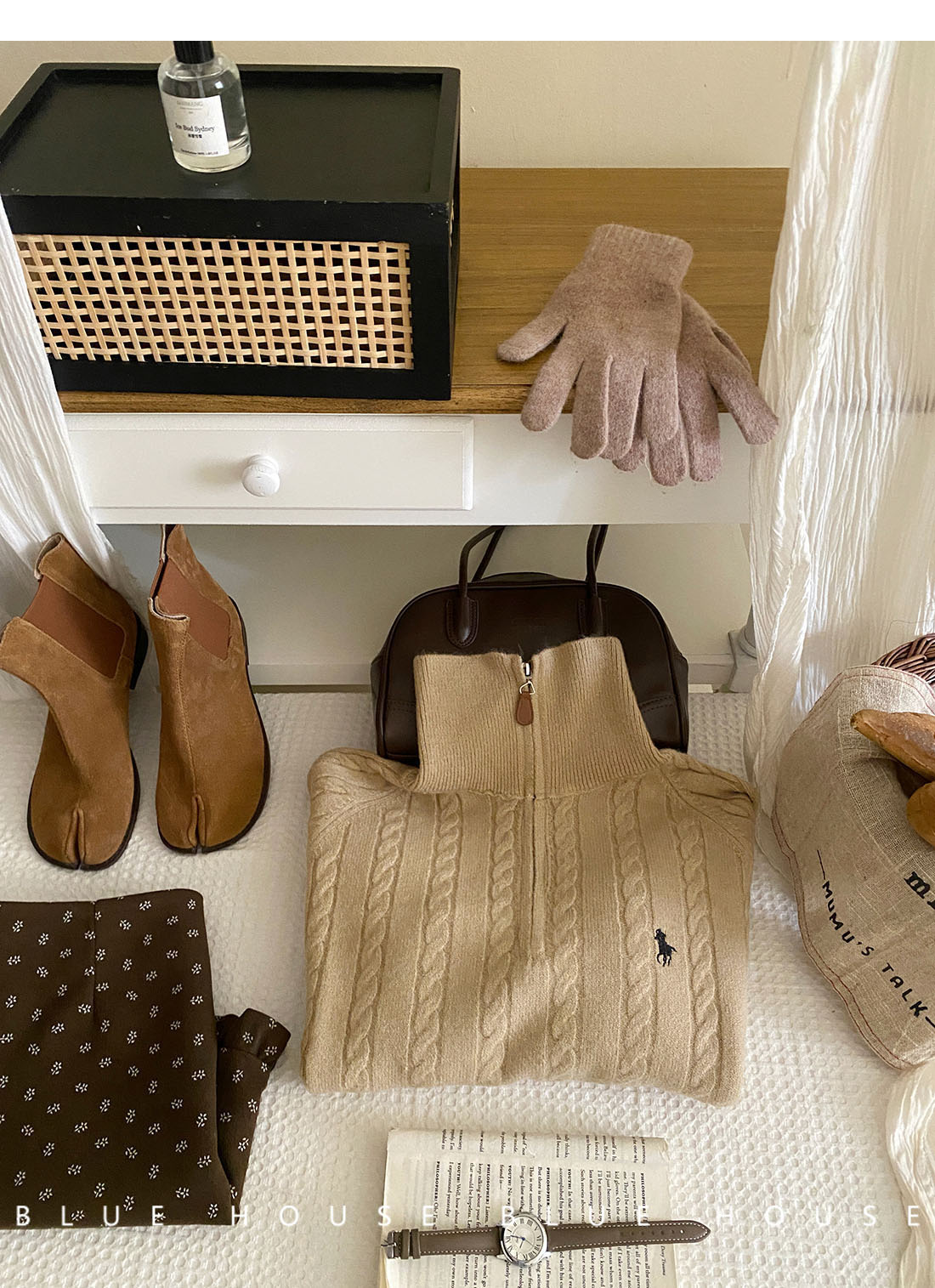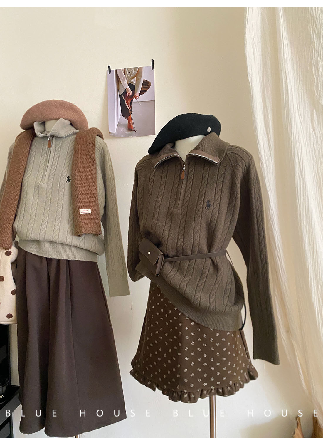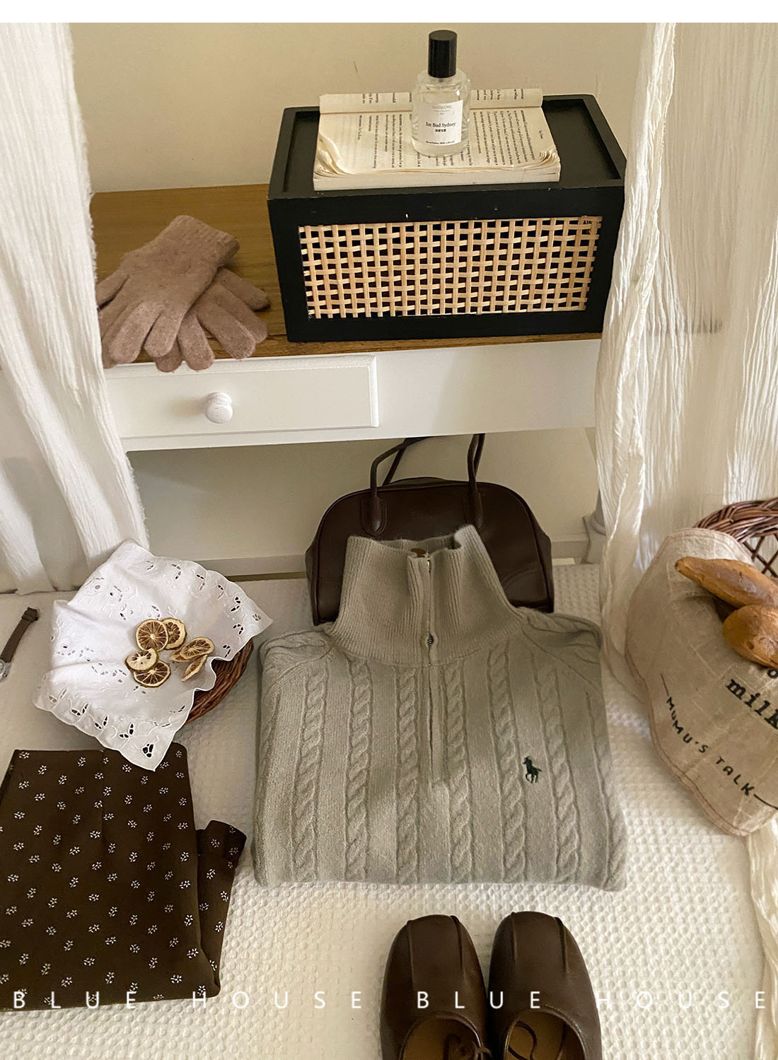 韓系復古麻花半拉鍊立領毛衣女秋冬小刺綉休閒百搭套頭針織衫上衣