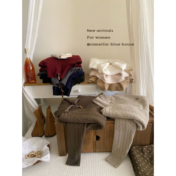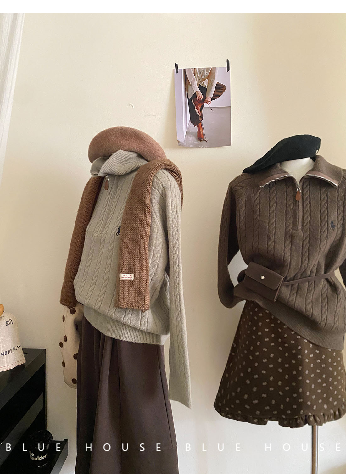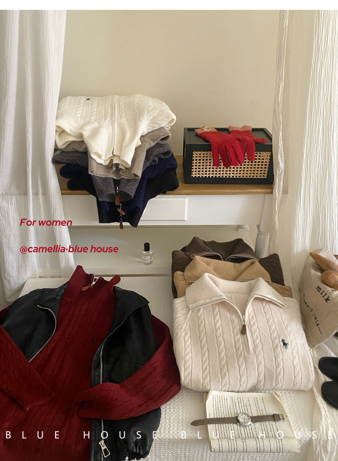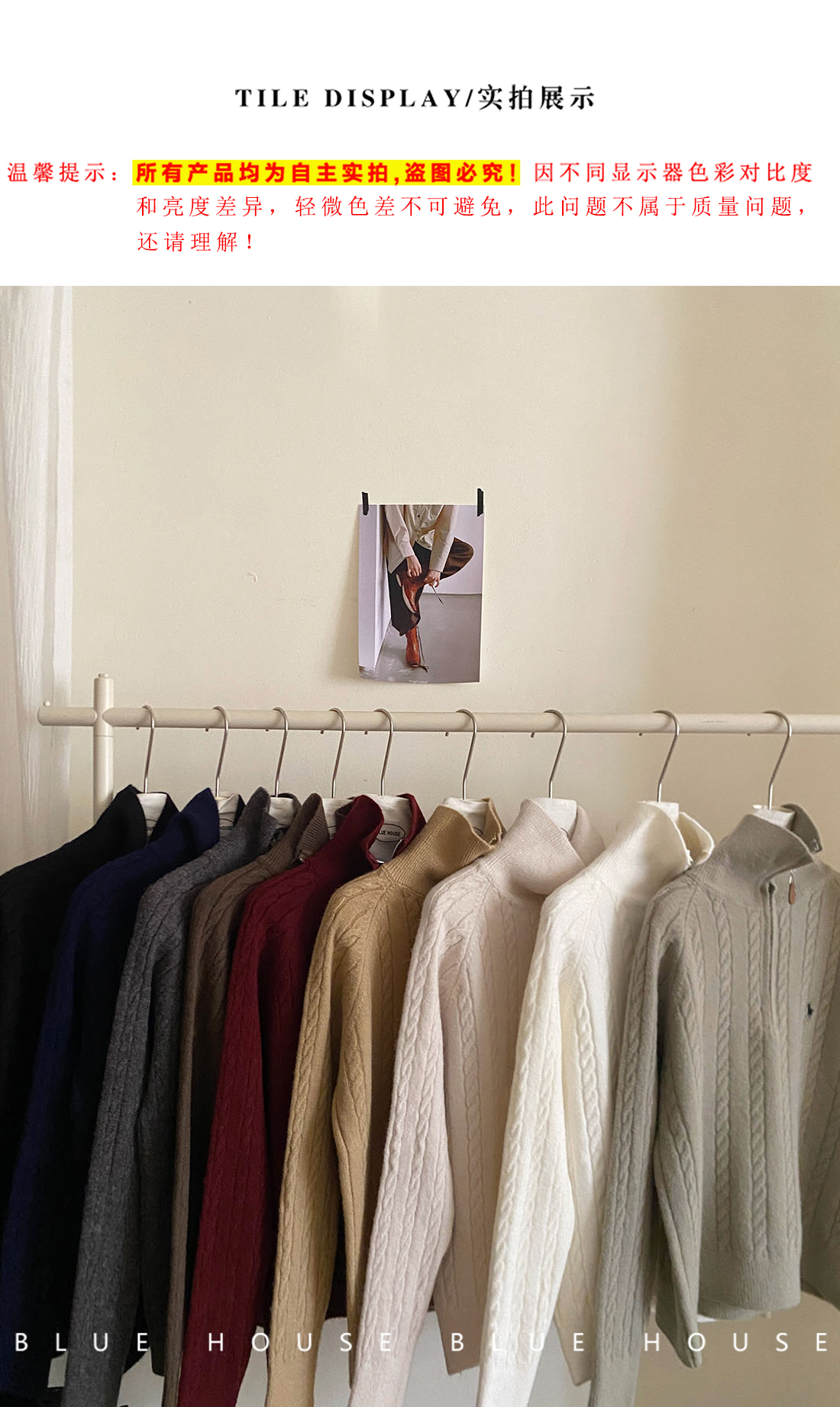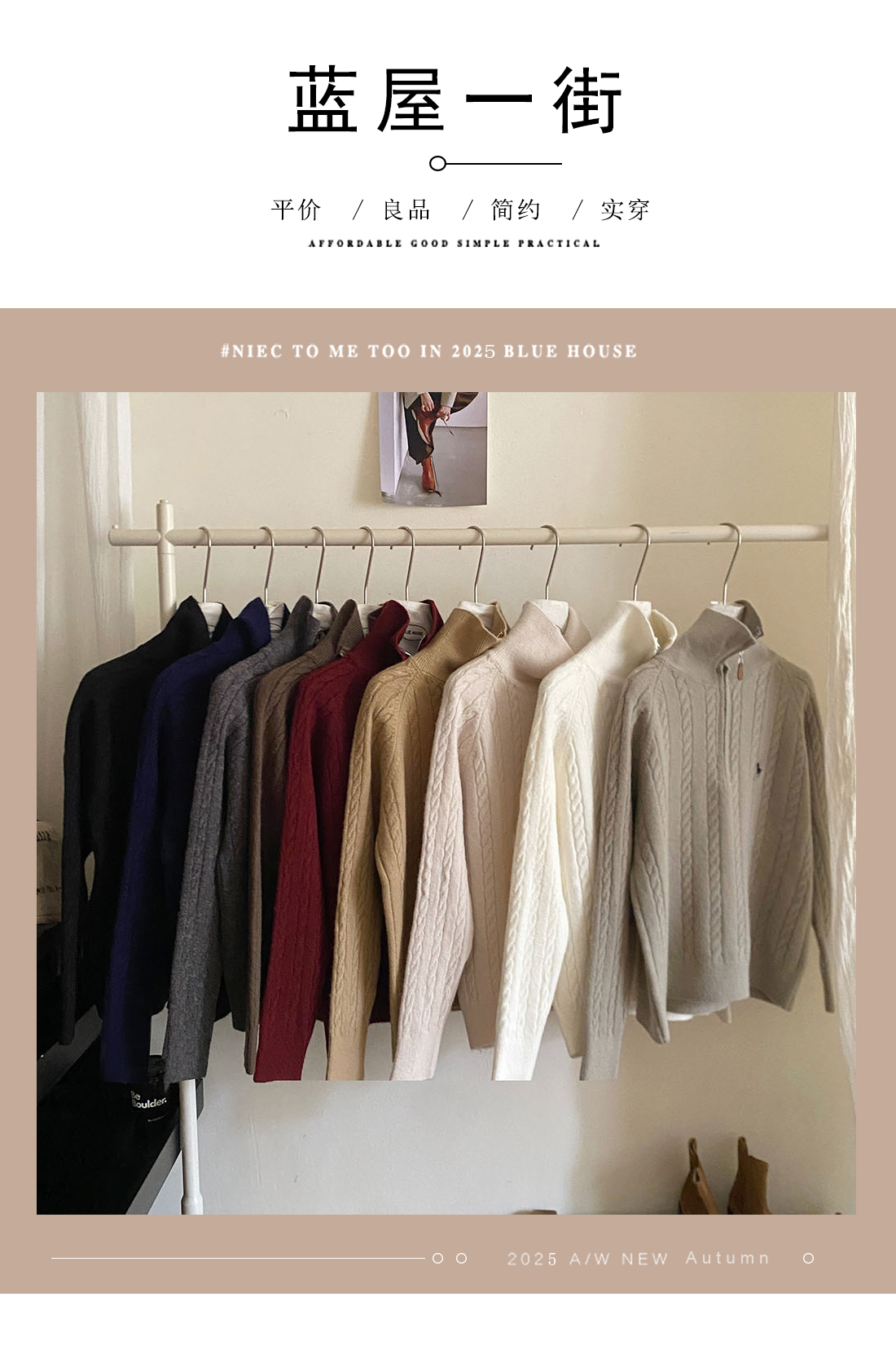韓系復古麻花半拉鍊立領毛衣女秋冬小刺綉休閒百搭套頭針織衫上衣