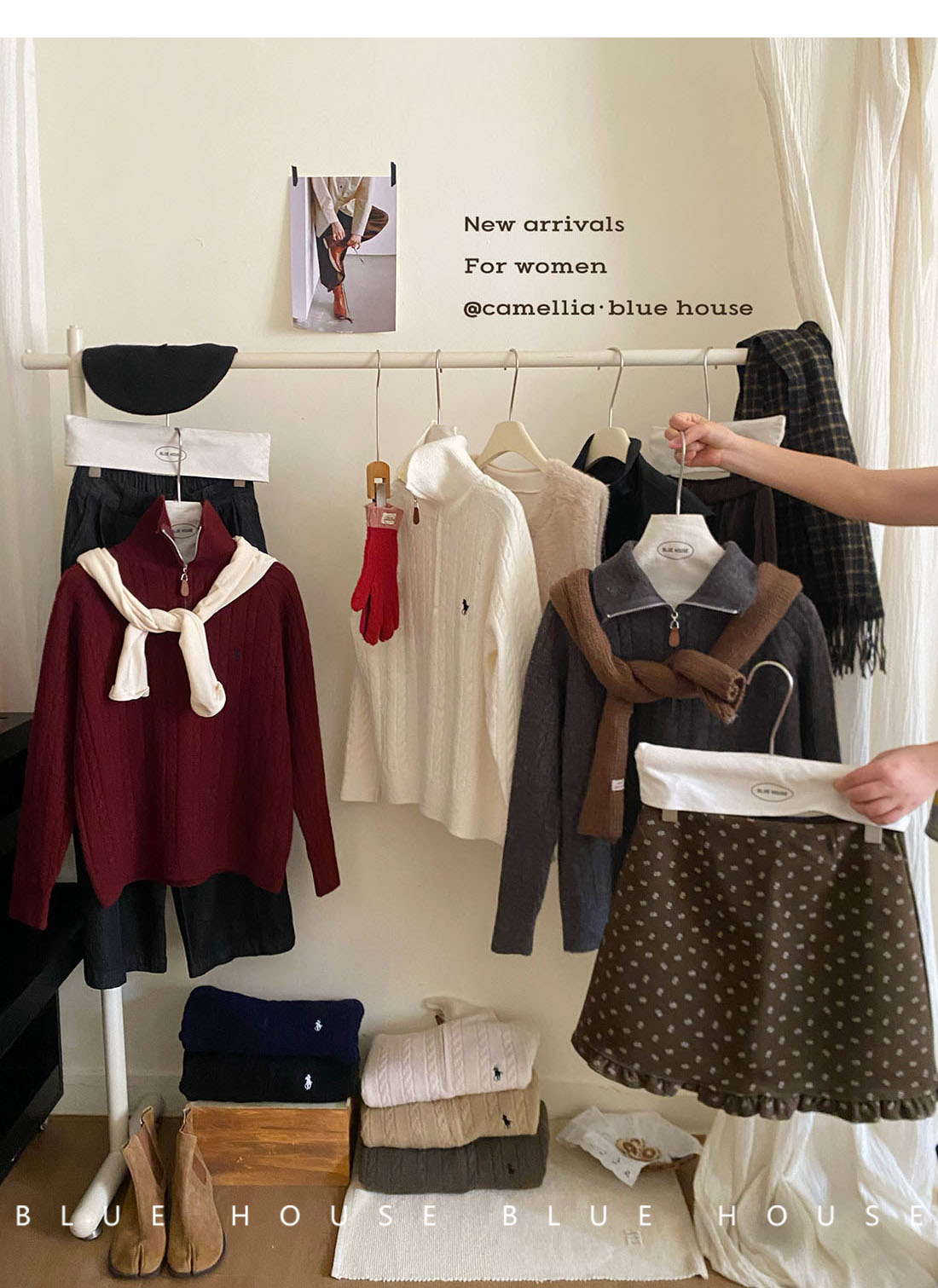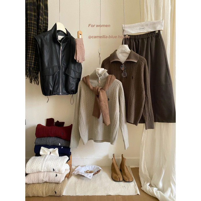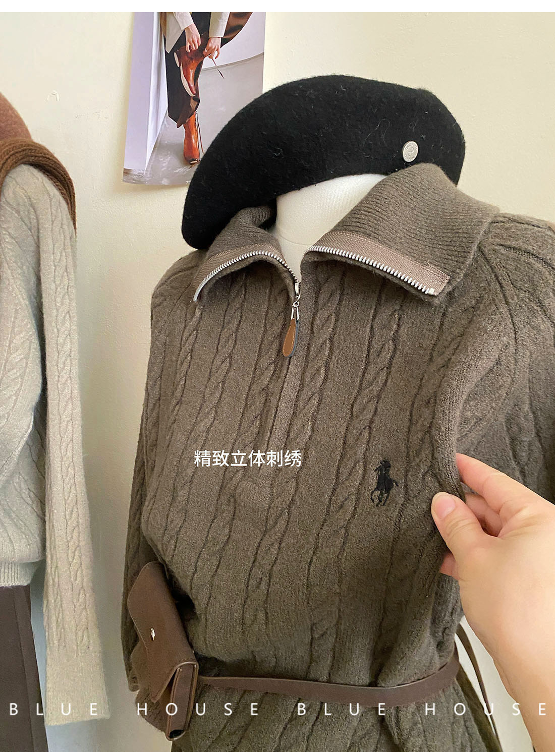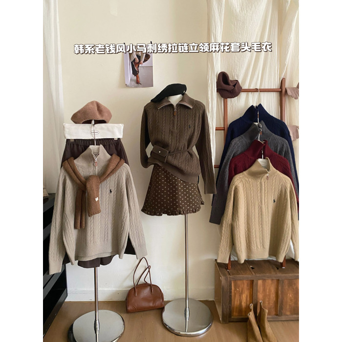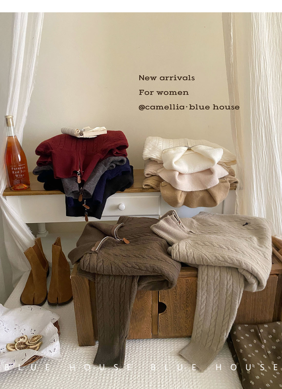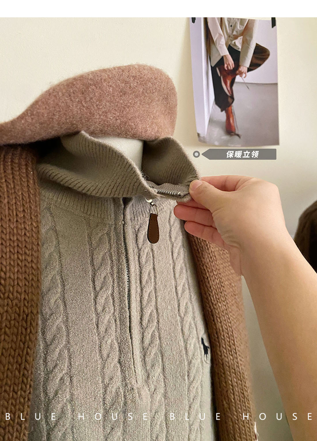 韓系復古麻花半拉鍊立領毛衣女秋冬小刺綉休閒百搭套頭針織衫上衣
