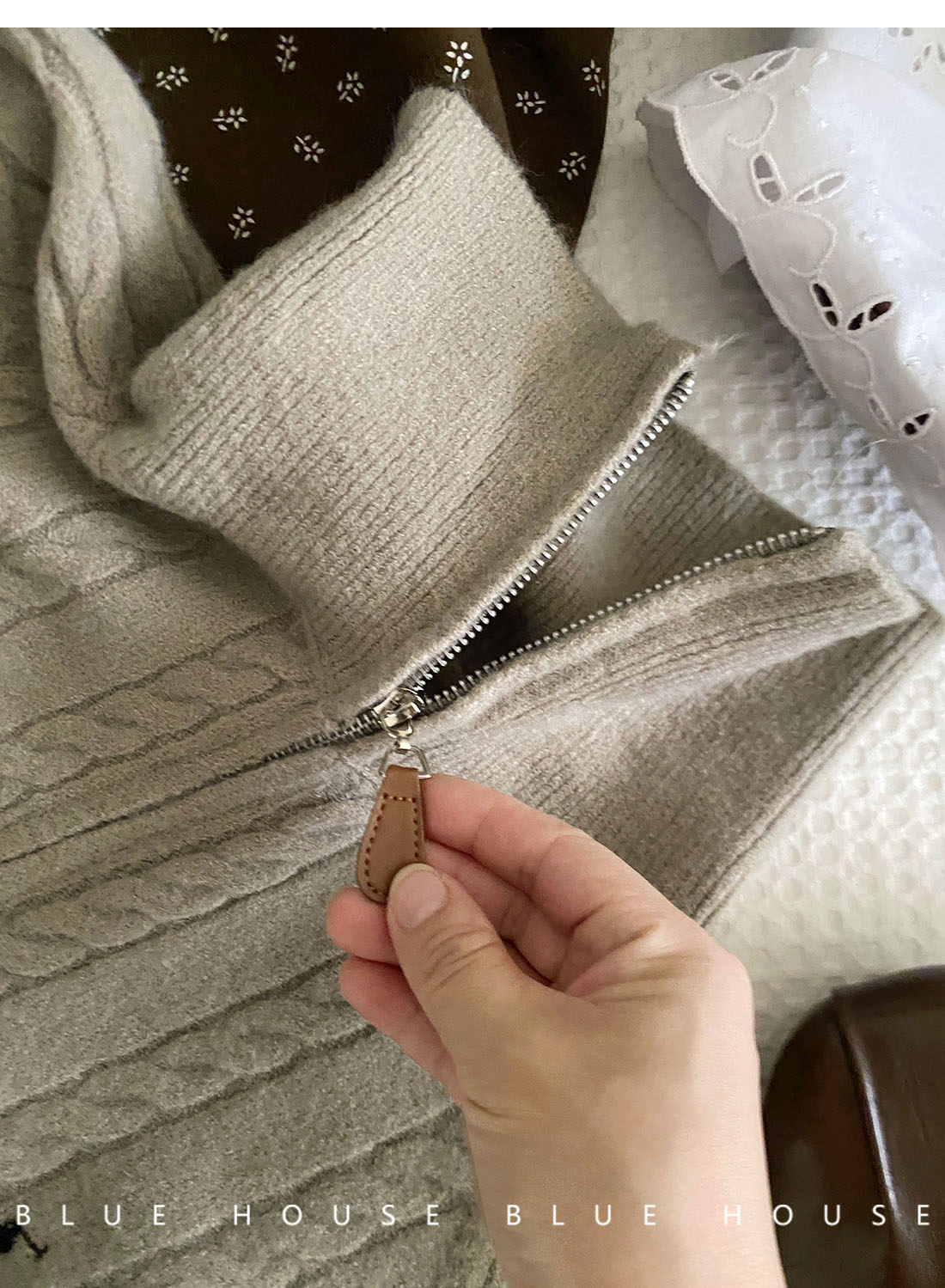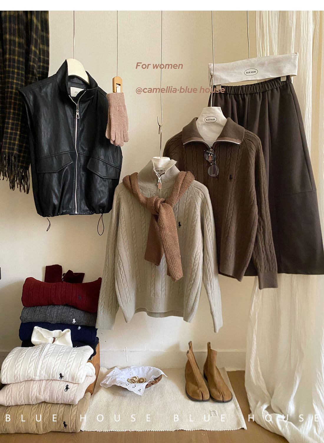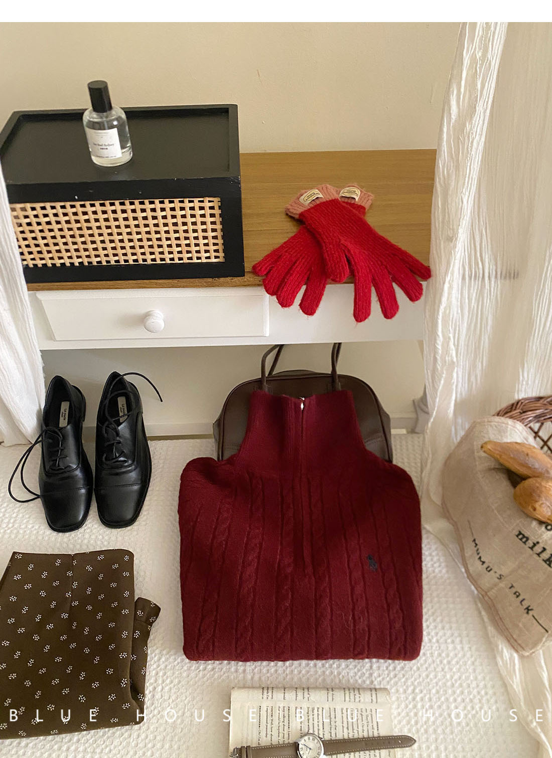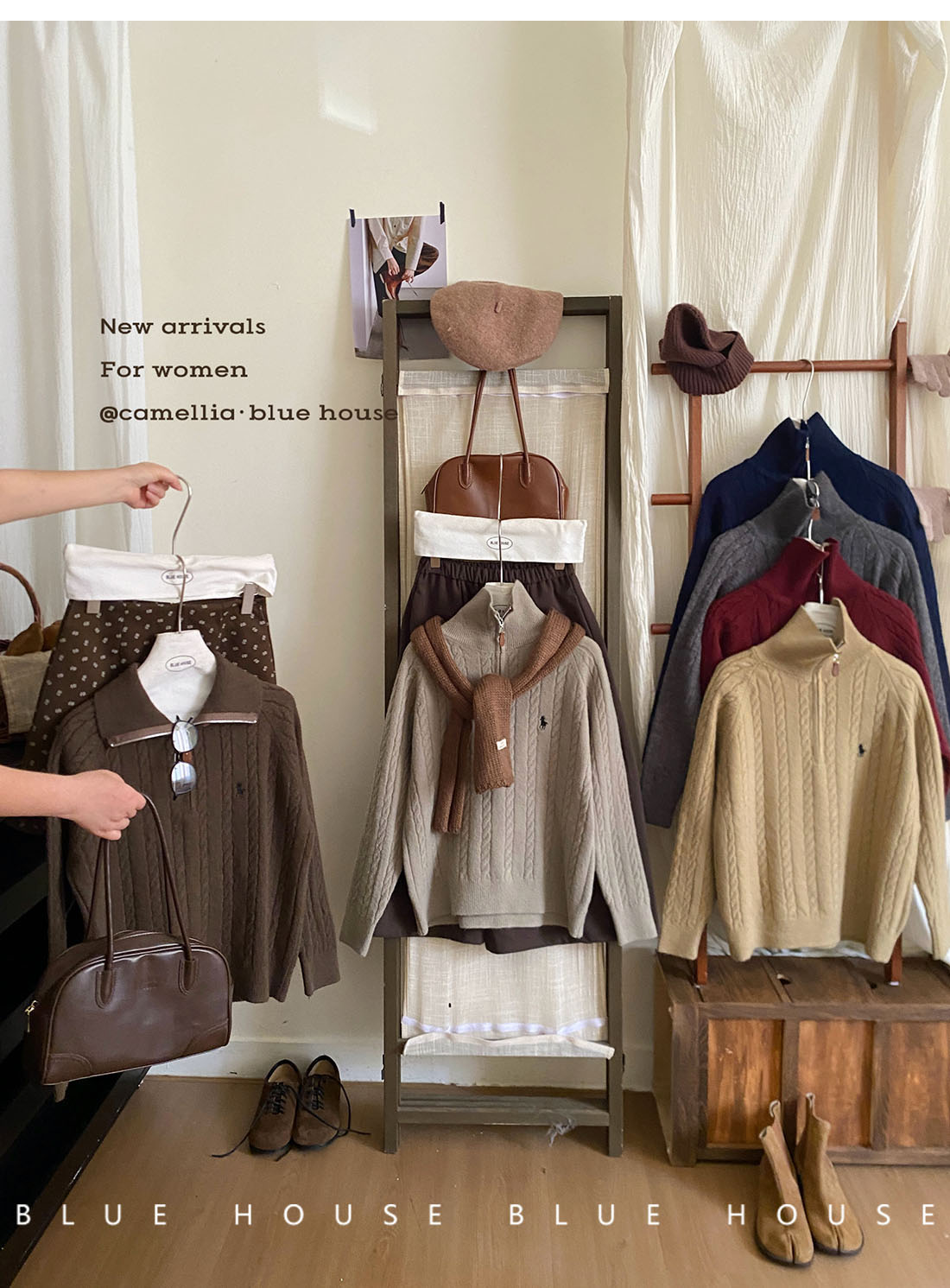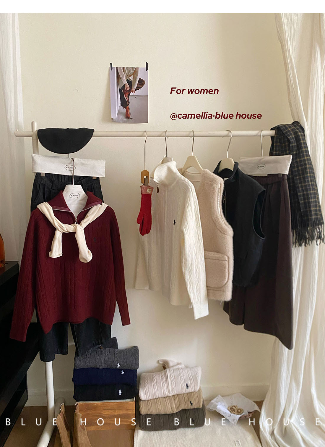 韓系復古麻花半拉鍊立領毛衣女秋冬小刺綉休閒百搭套頭針織衫上衣