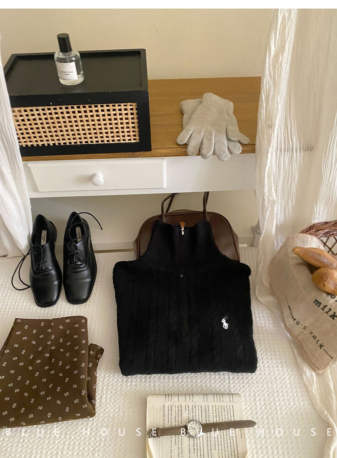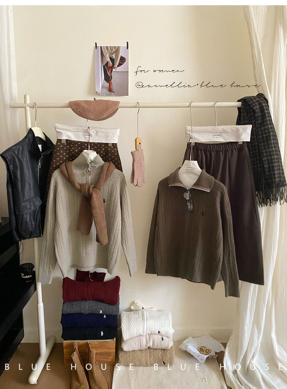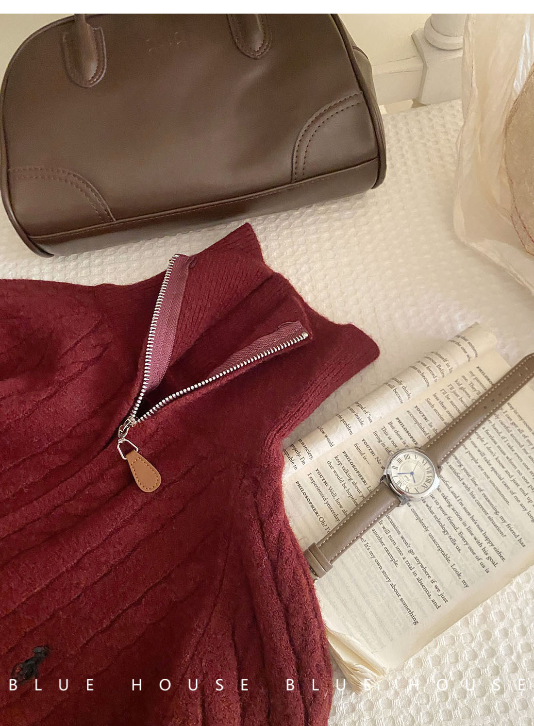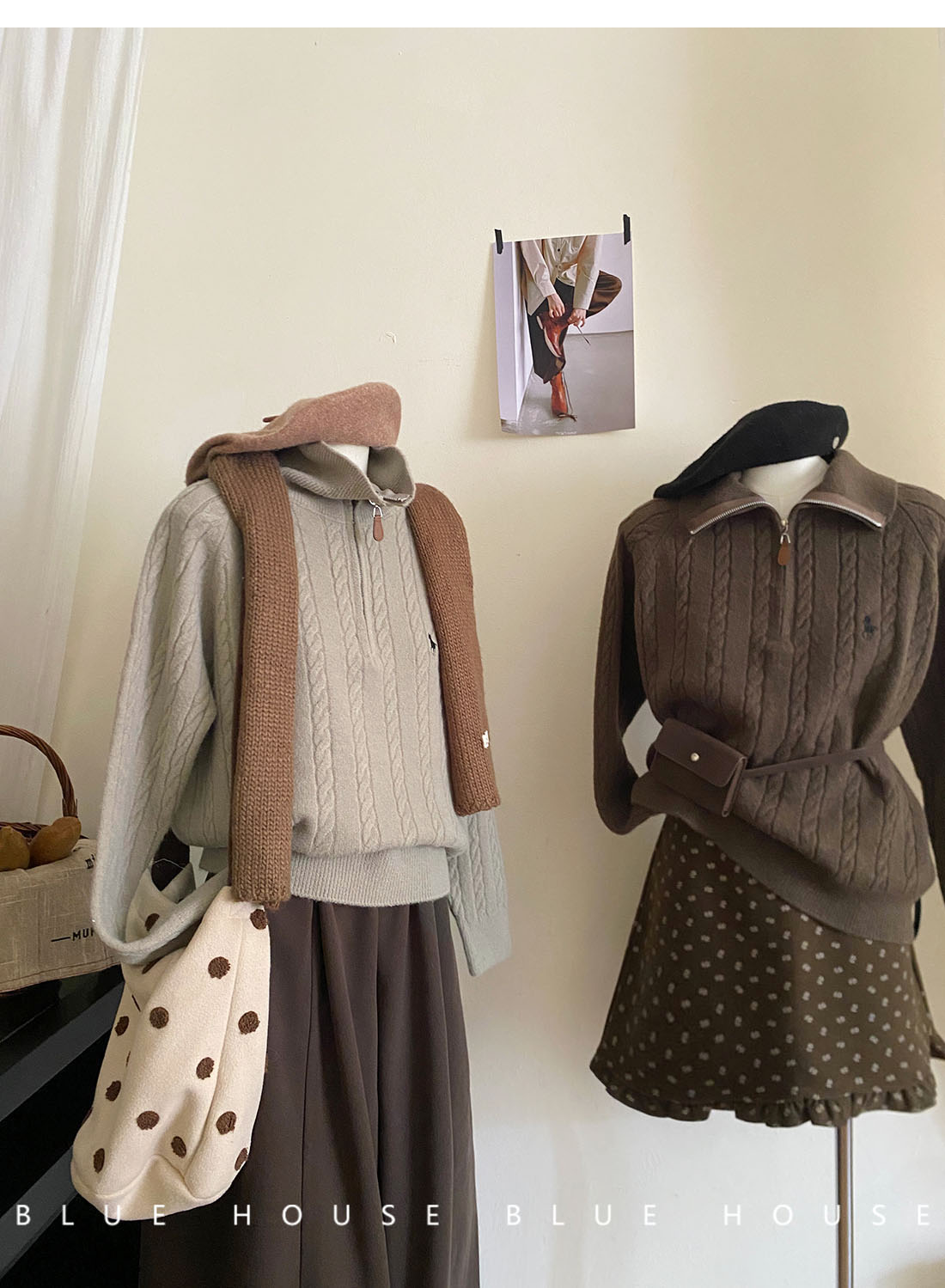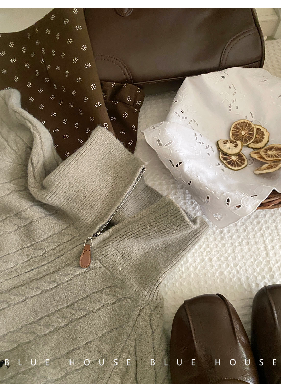 韓系復古麻花半拉鍊立領毛衣女秋冬小刺綉休閒百搭套頭針織衫上衣
