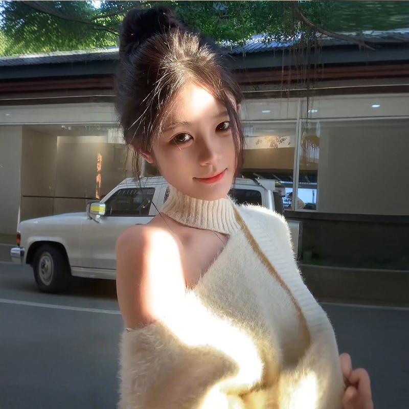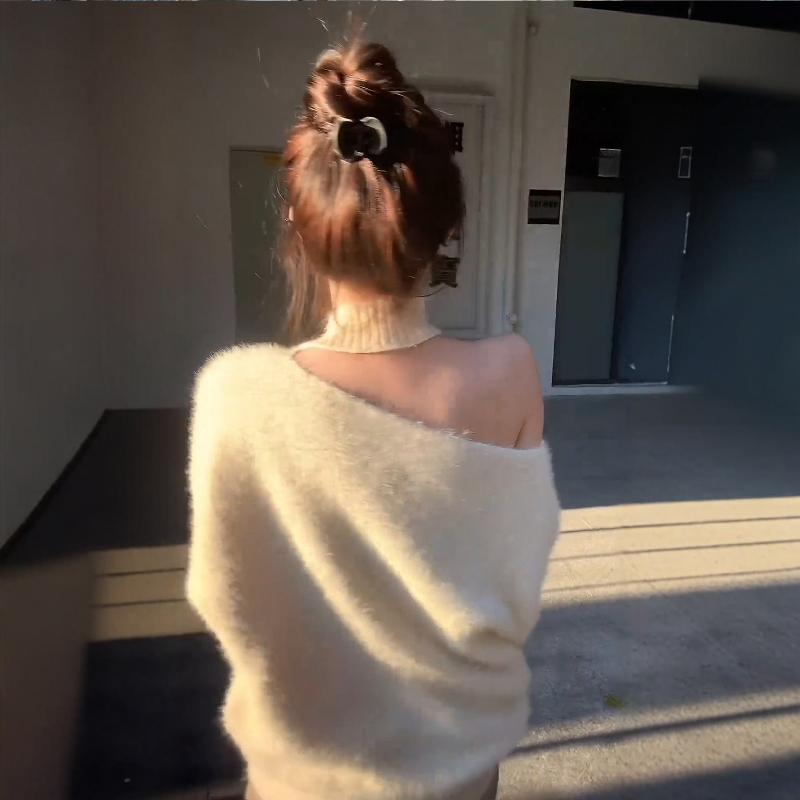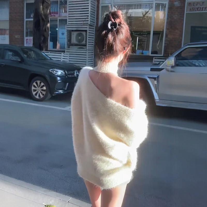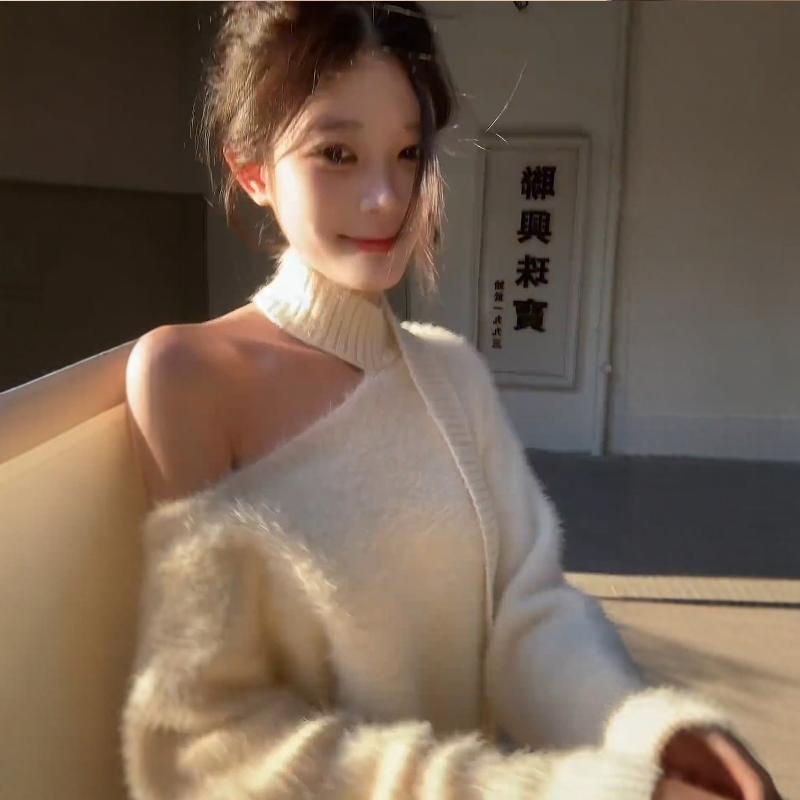 韓系氛圍感露肩套頭毛衣女冬季新款設計感飄帶顯瘦水貂絨白色上衣