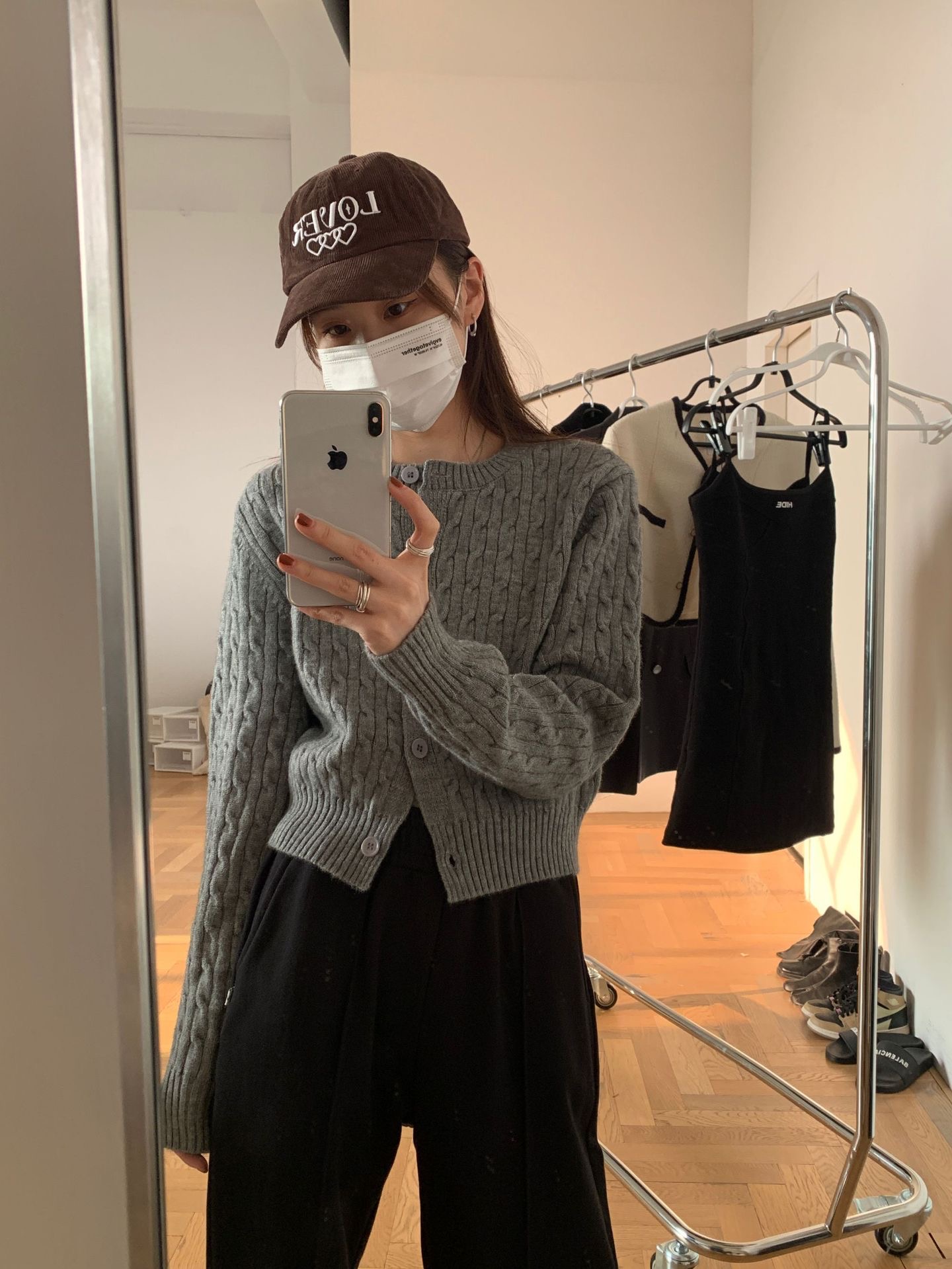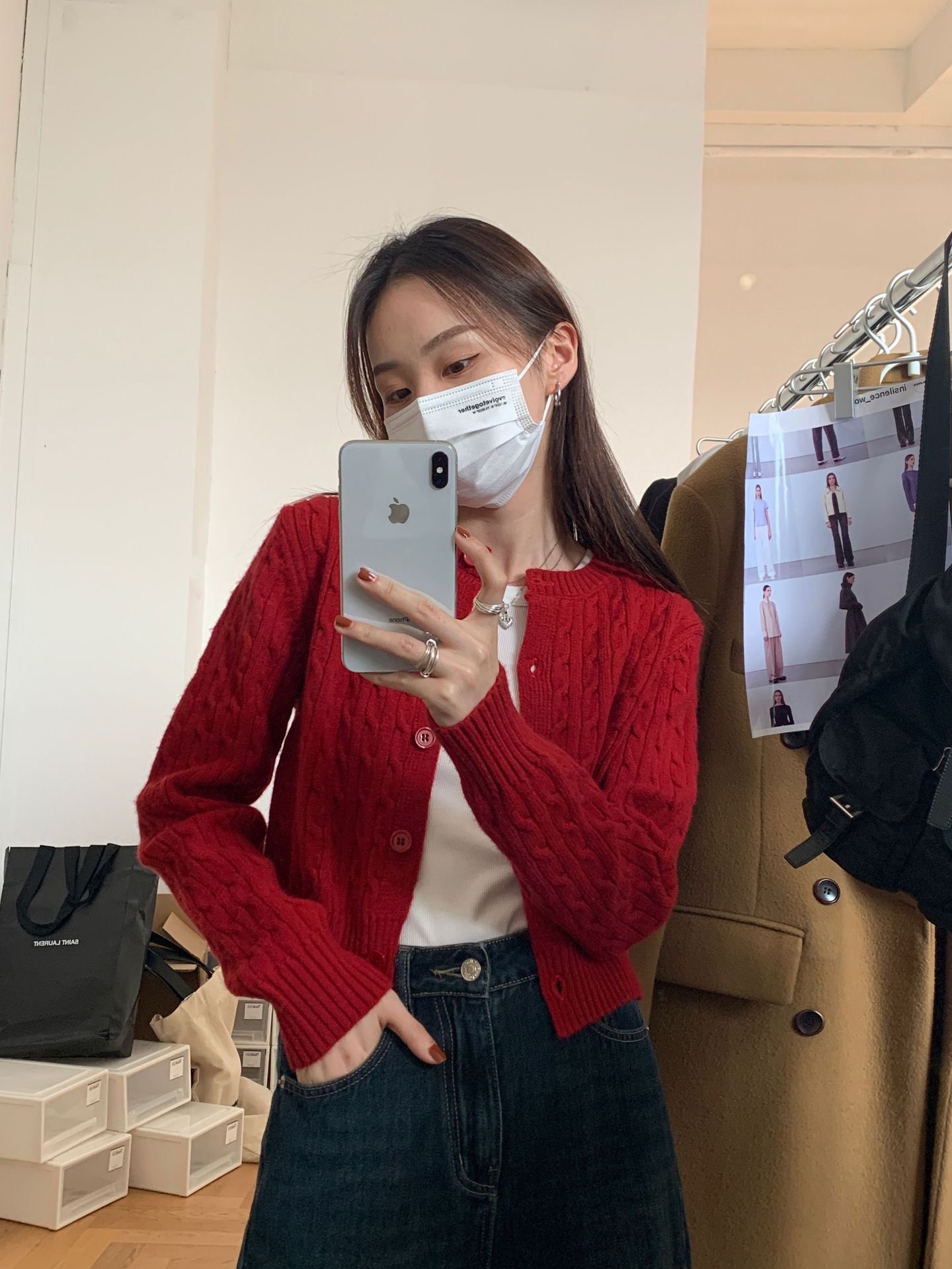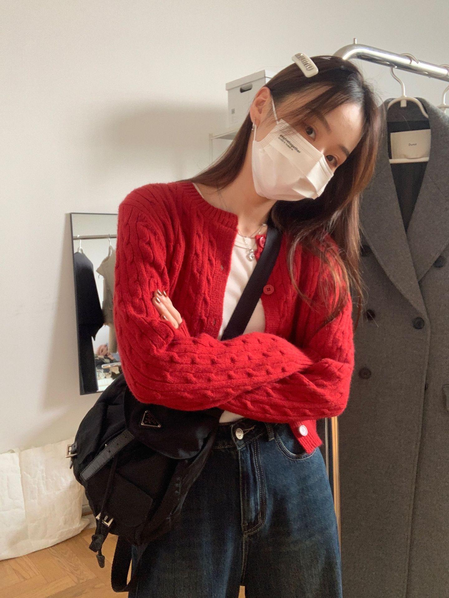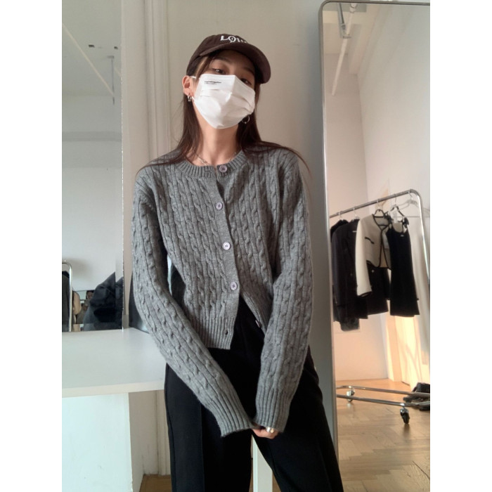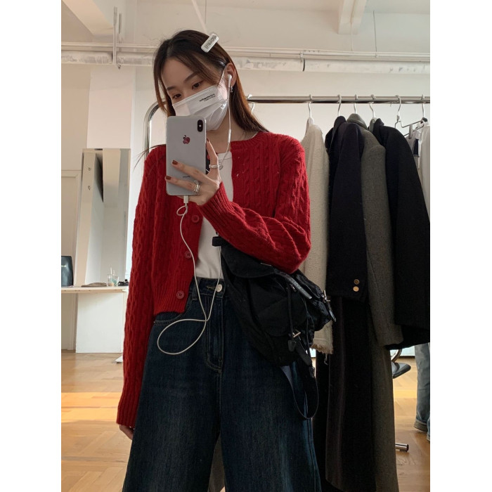 麻花開衫毛衣女外套秋冬內搭學院風灰色紅色針織衫小個子短款上衣