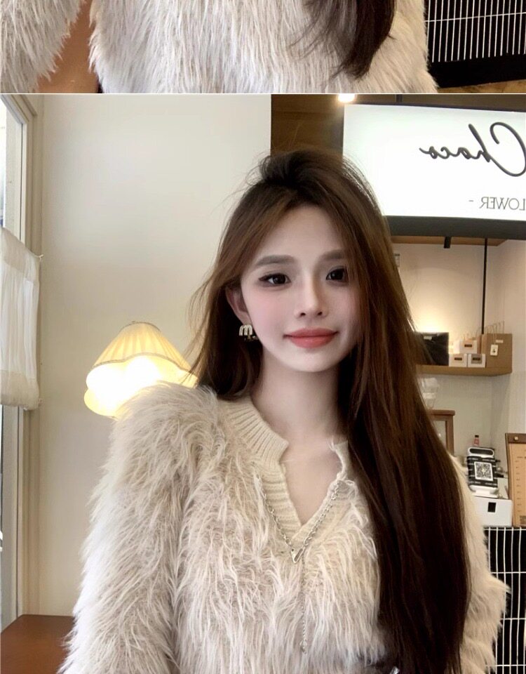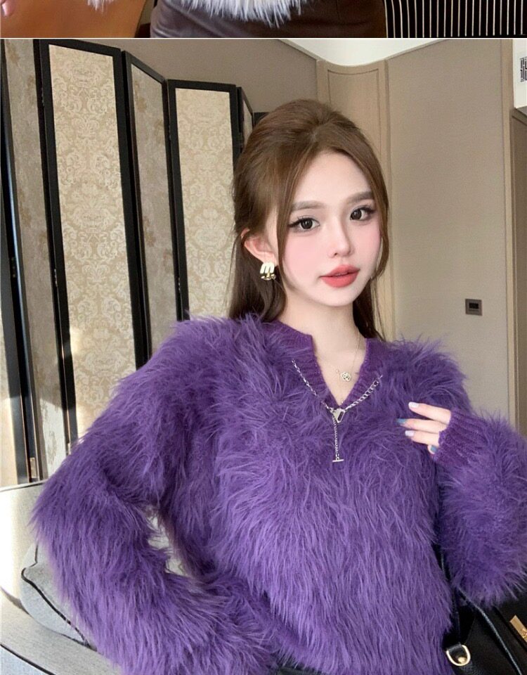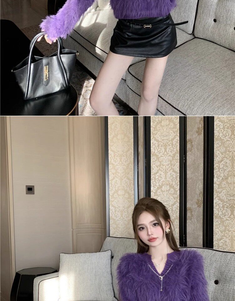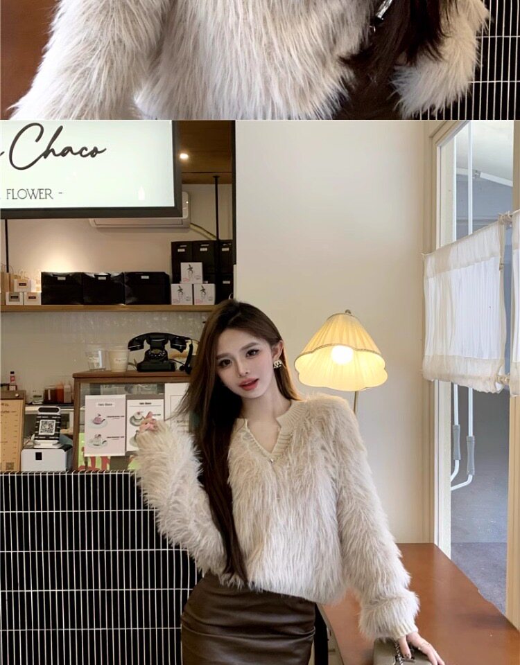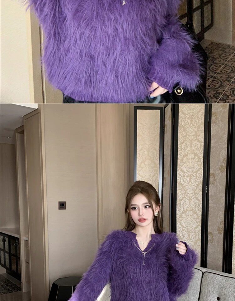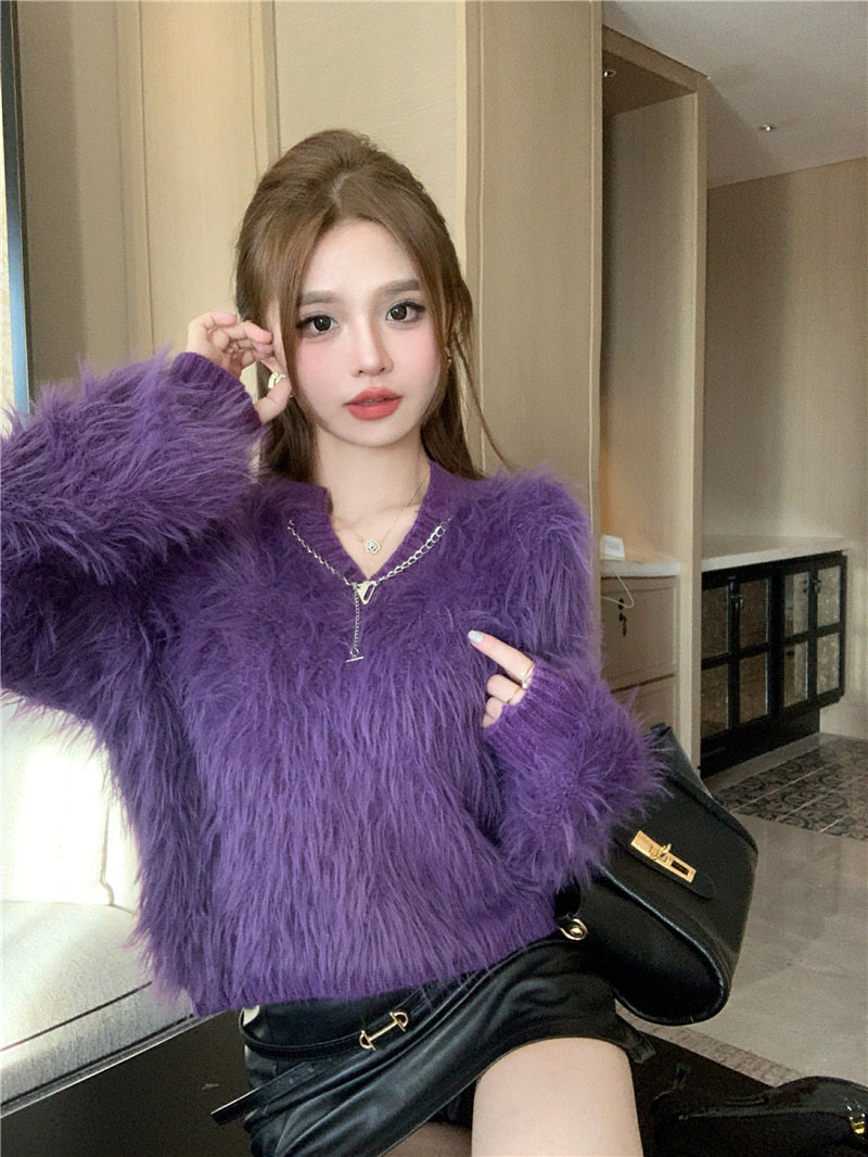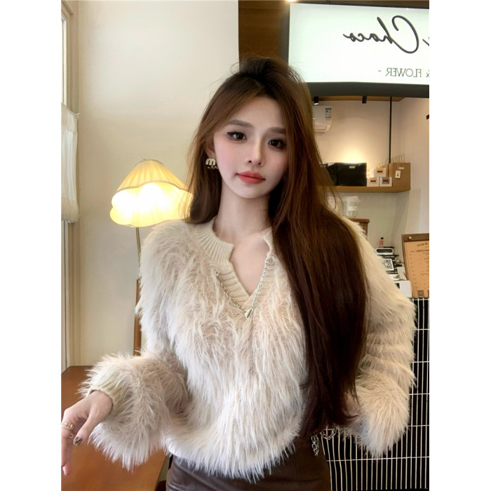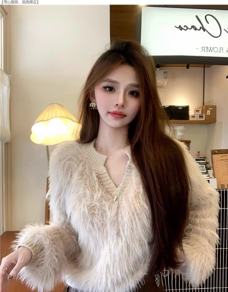 慵懶風復古毛衣女秋冬加厚設計感小衆V領短款水貂毛針織溫柔上衣