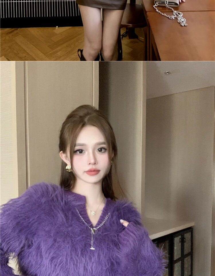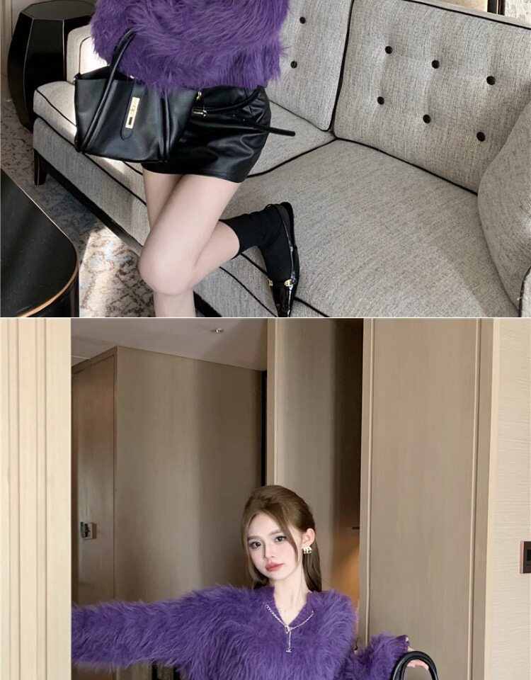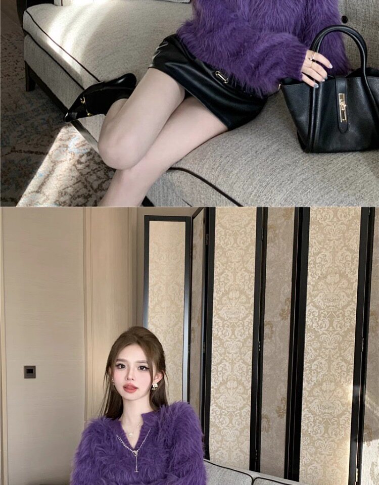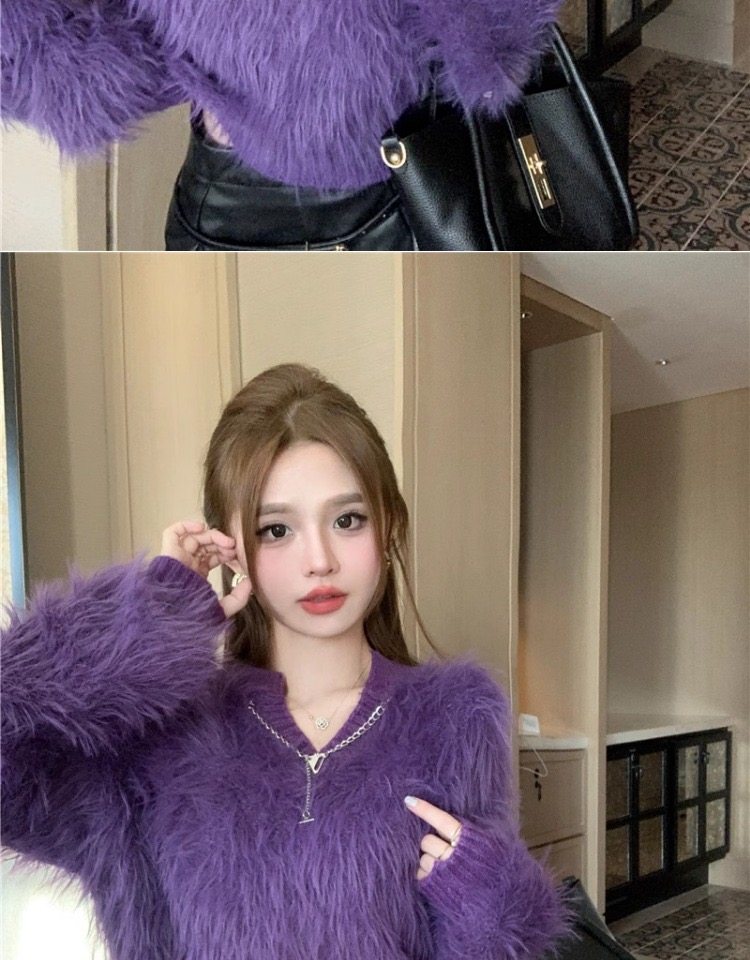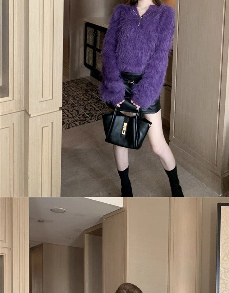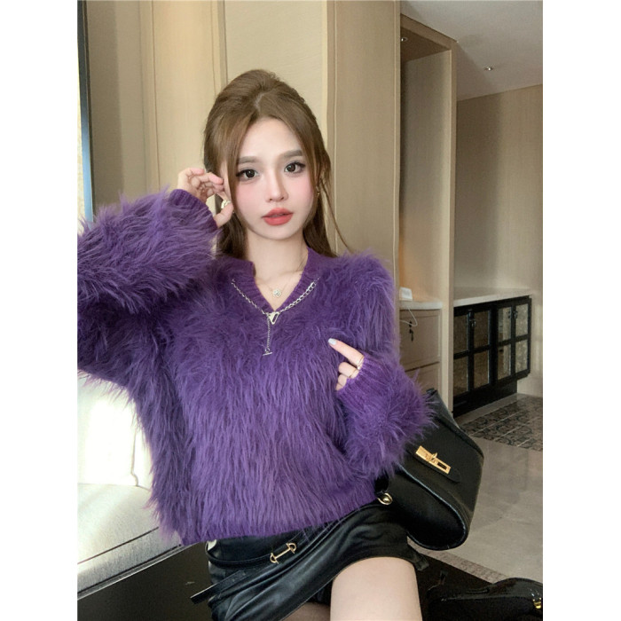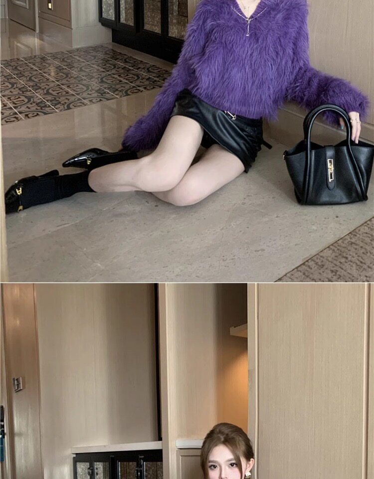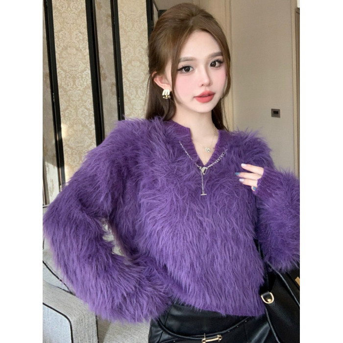 慵懶風復古毛衣女秋冬加厚設計感小衆V領短款水貂毛針織溫柔上衣