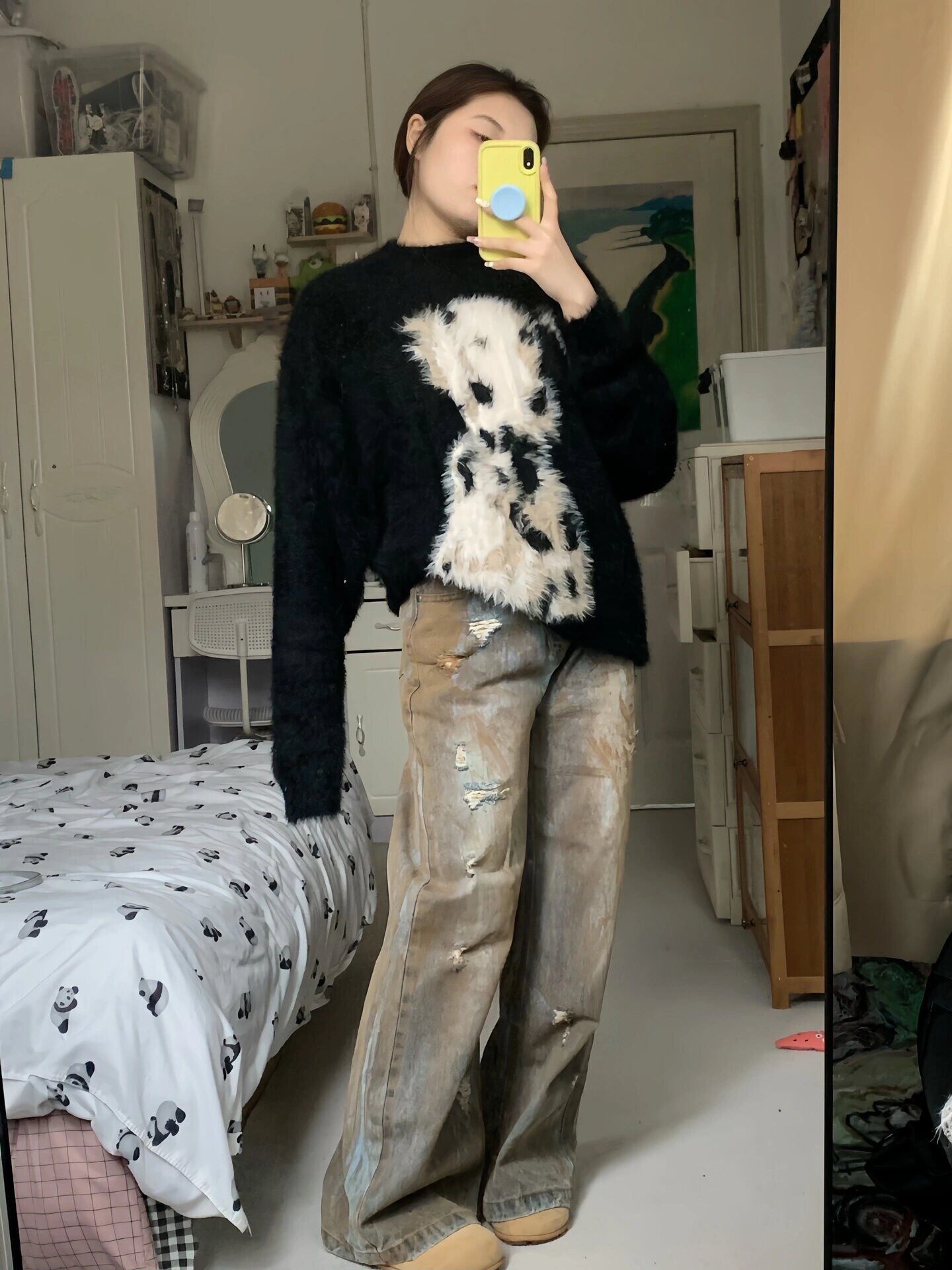 黑色圓領軟糯毛衣女設計感小衆秋冬款寬松慵懶風加厚馬海毛針織衫