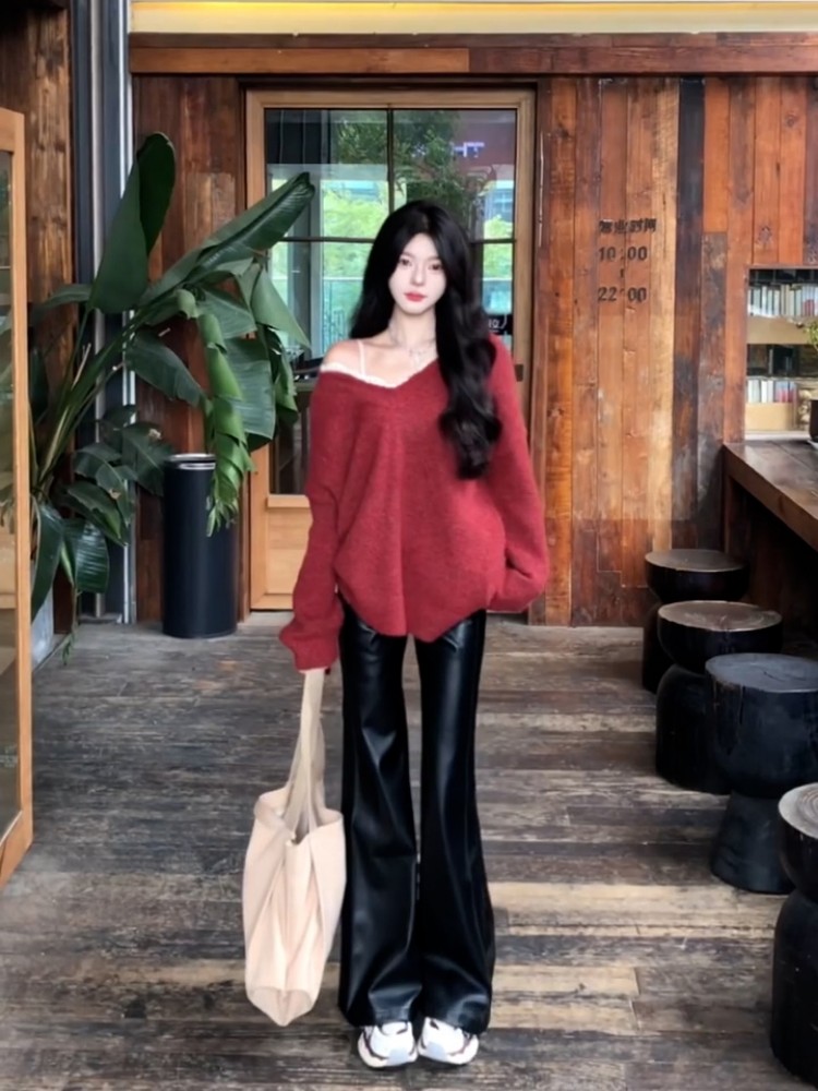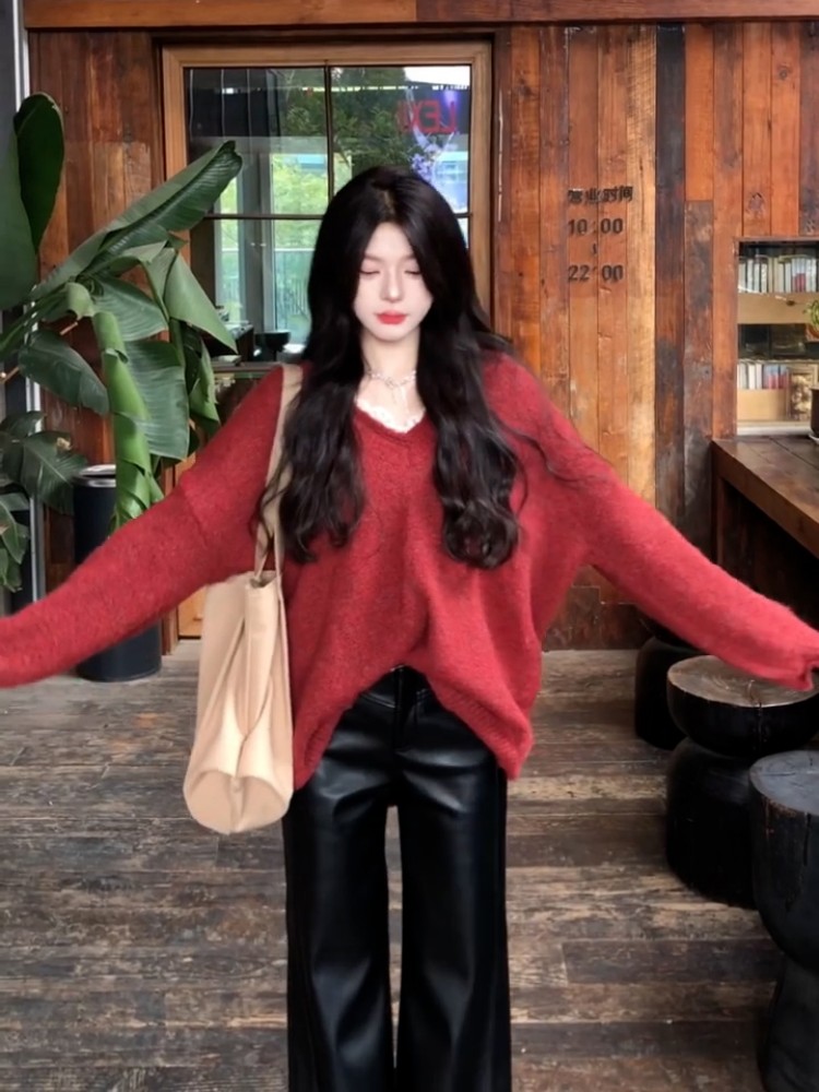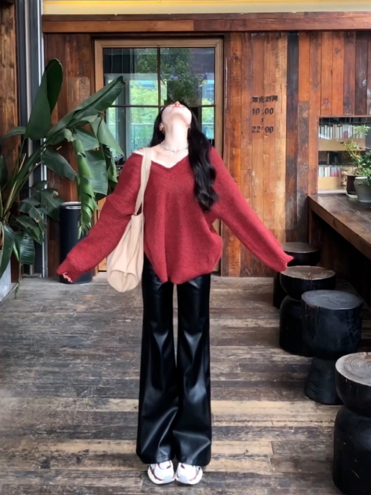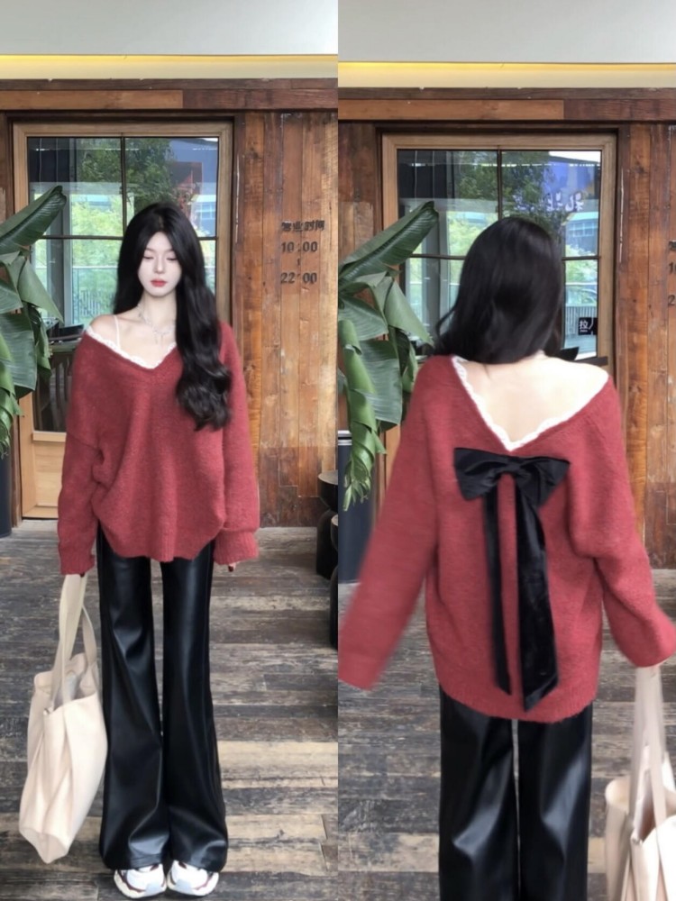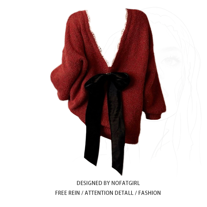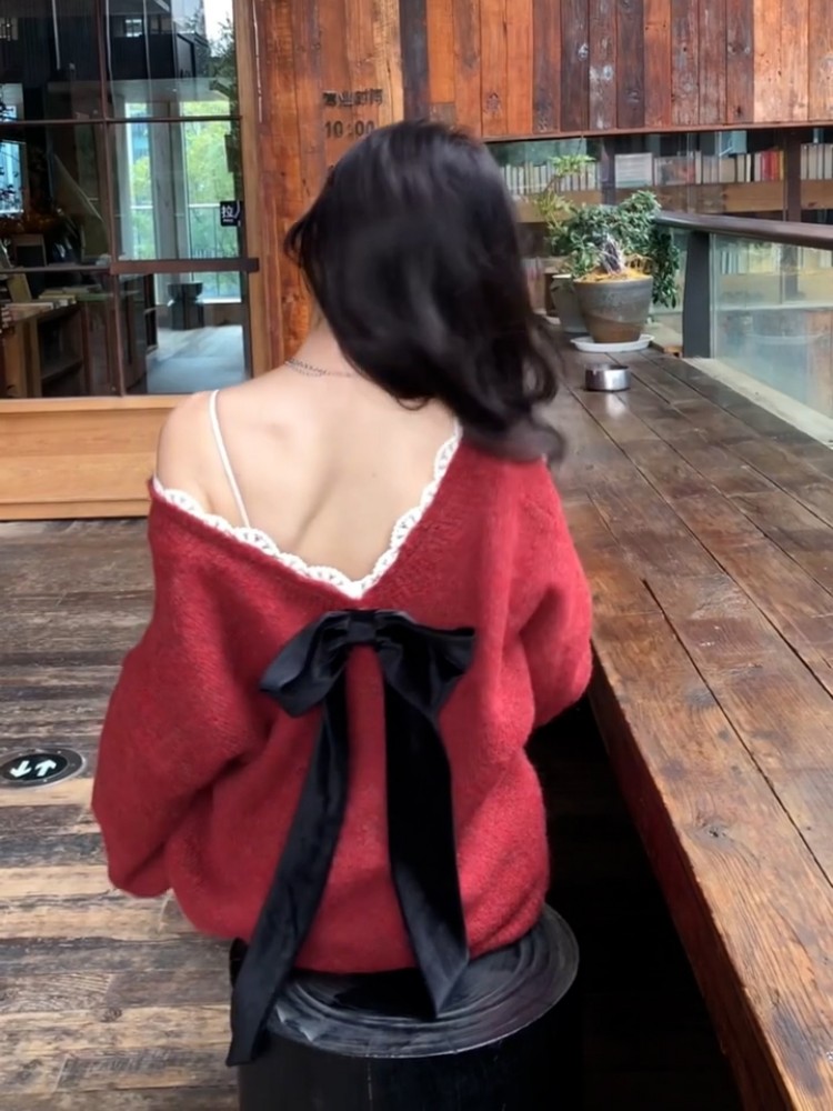 大碼胖MM紅色聖誕蝴蝶結露背v領毛衣女秋冬慵懶風高級感針織上衣