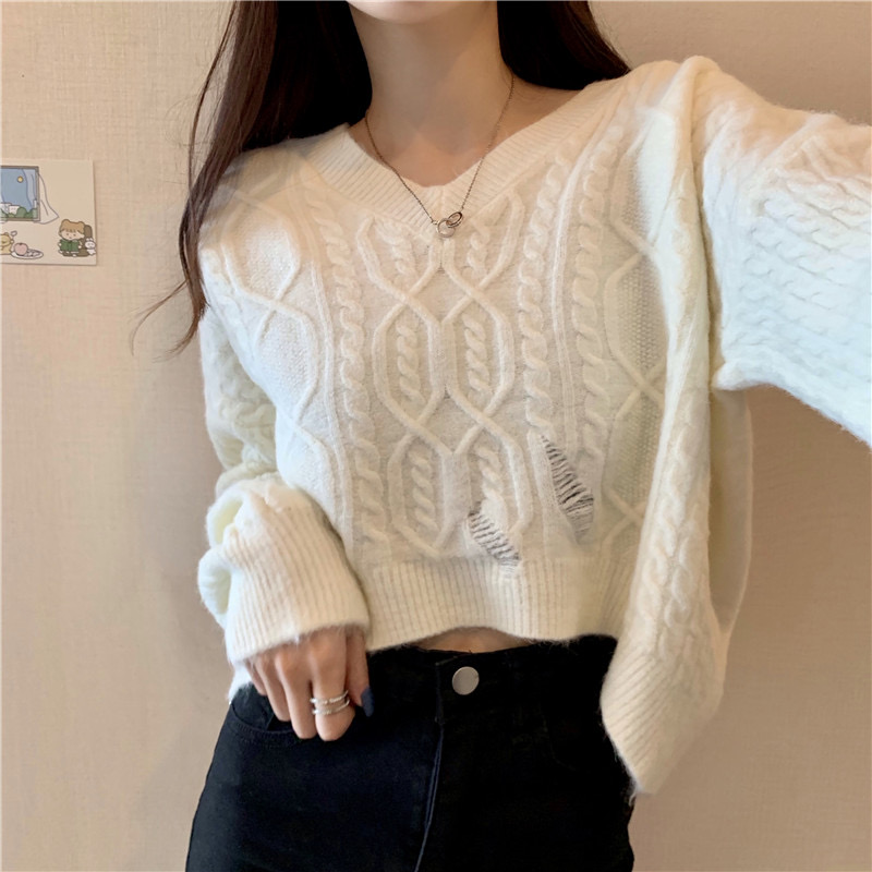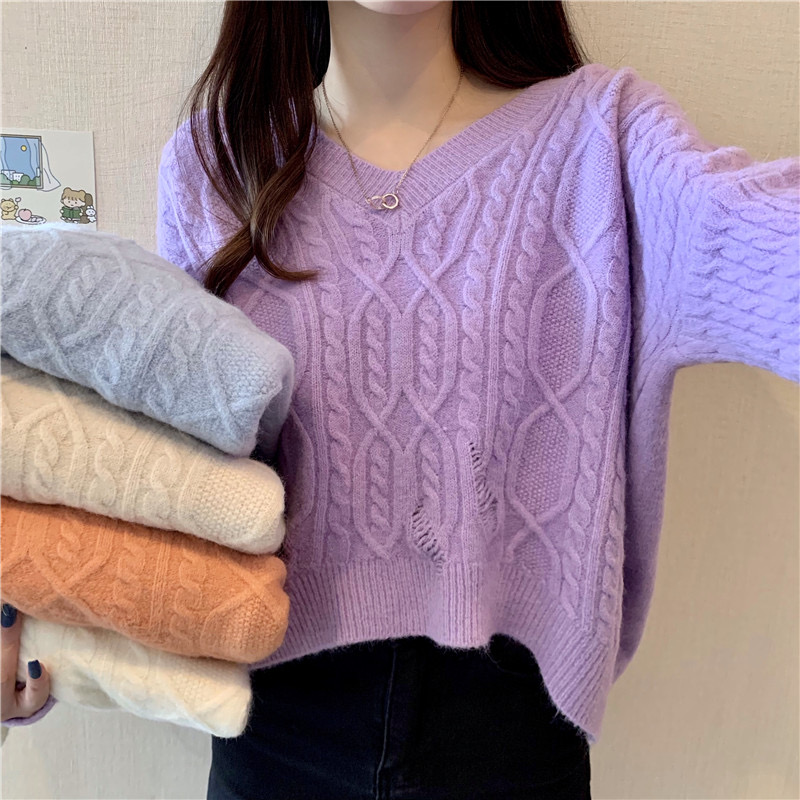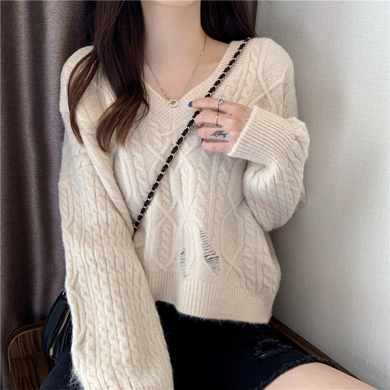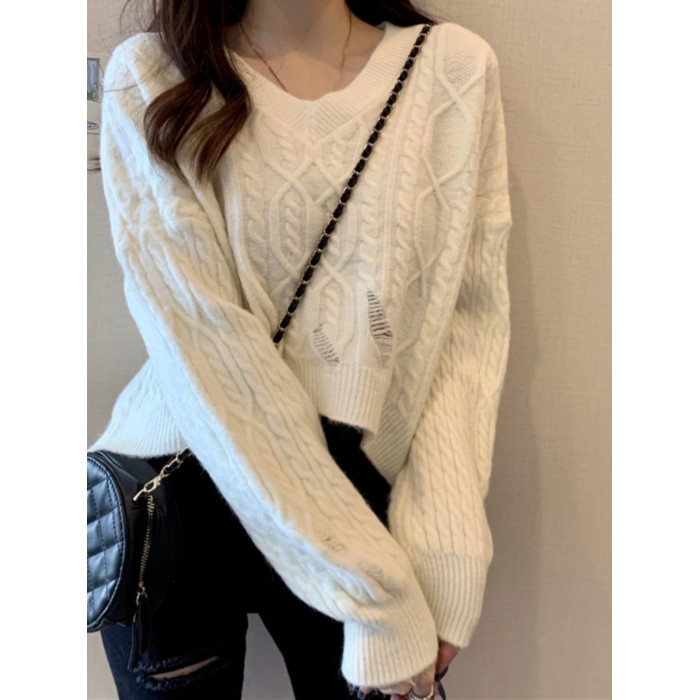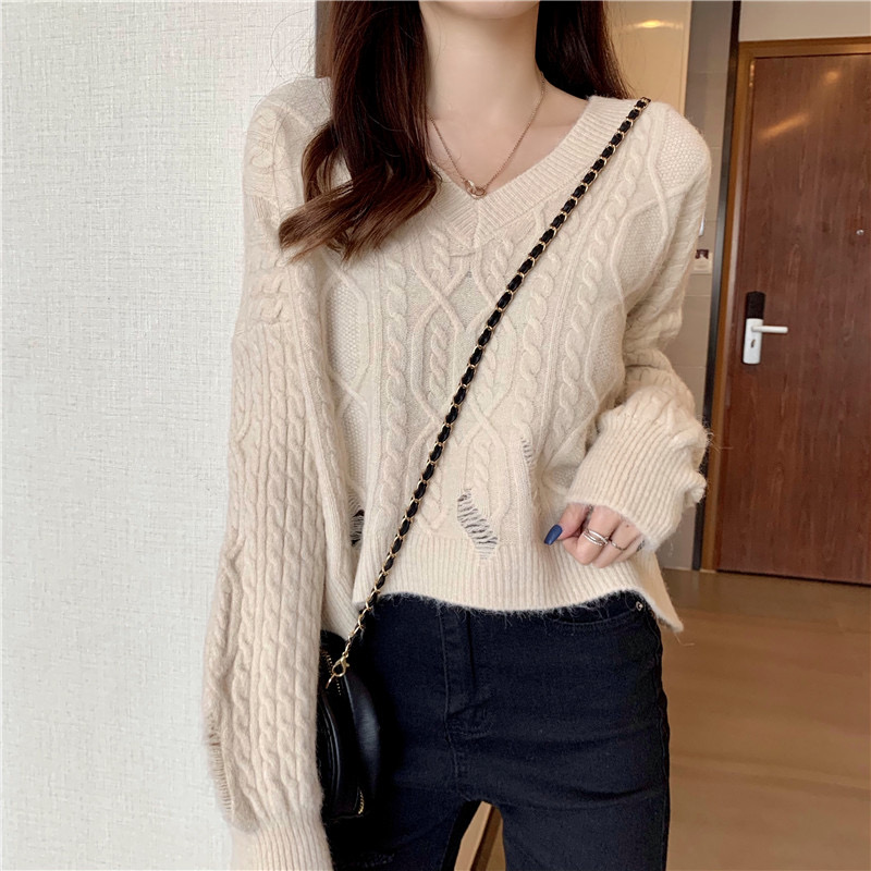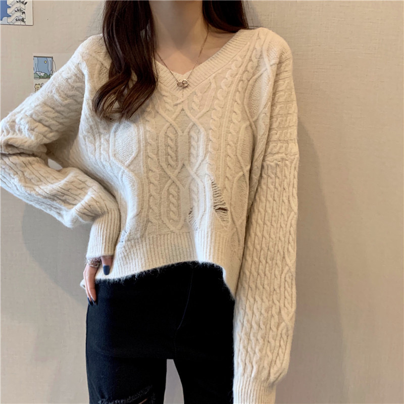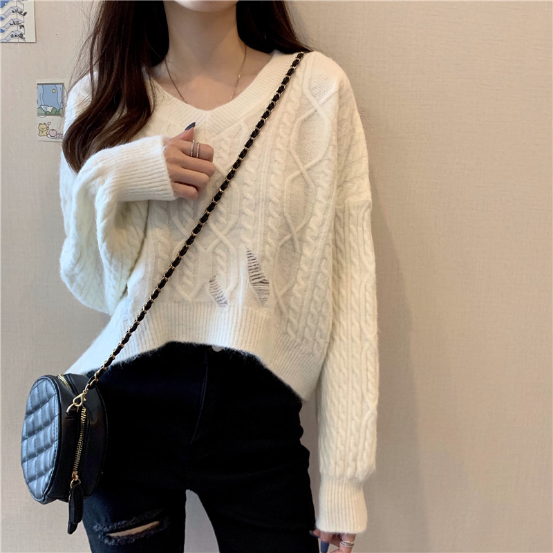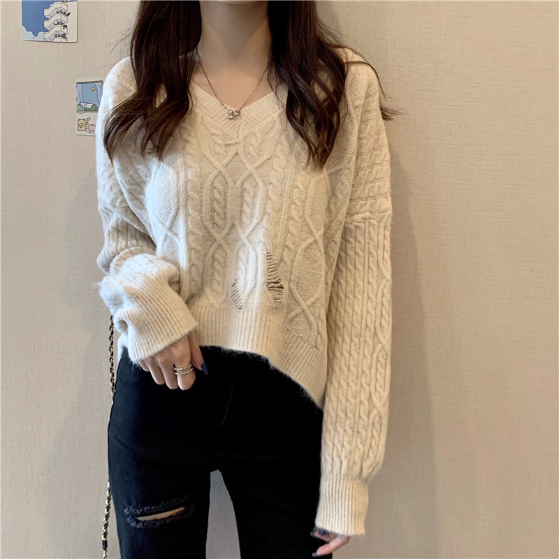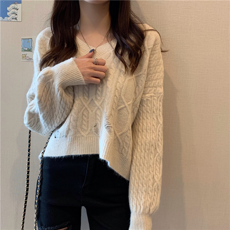 破洞麻花毛衣女針織衫套頭V領寬松慵懶秋冬短款打底百搭上衣學院