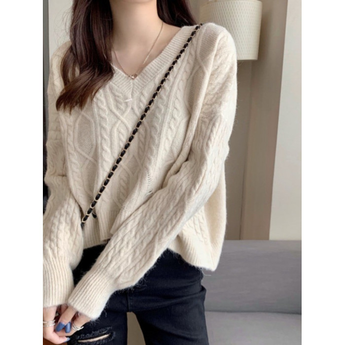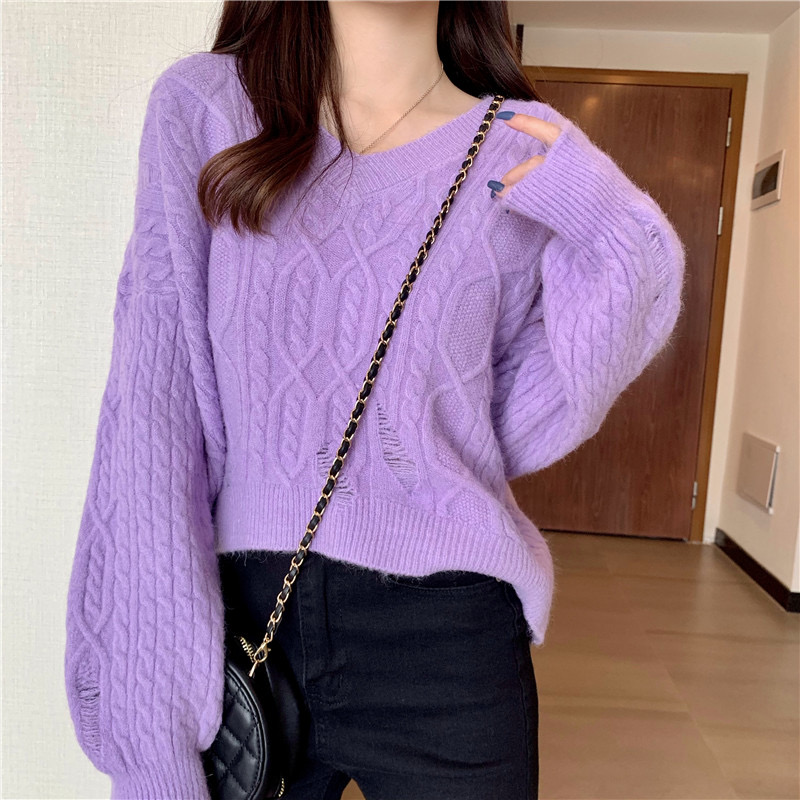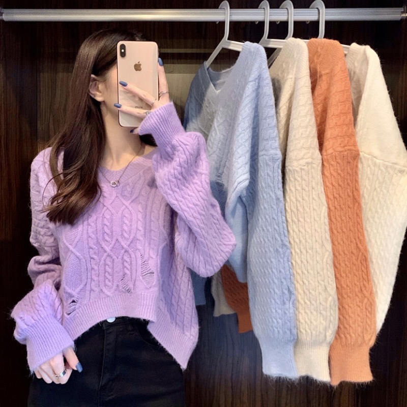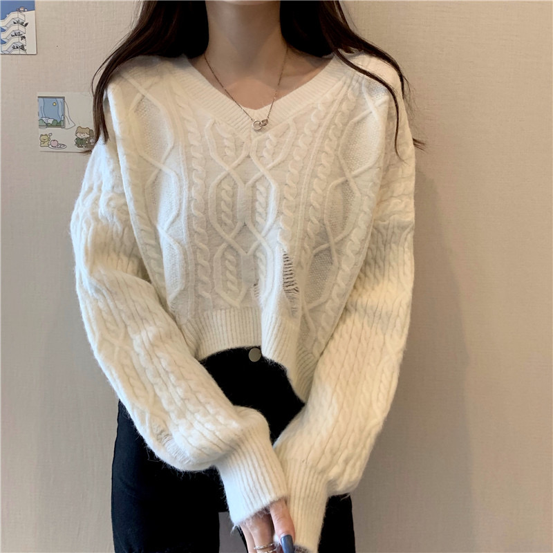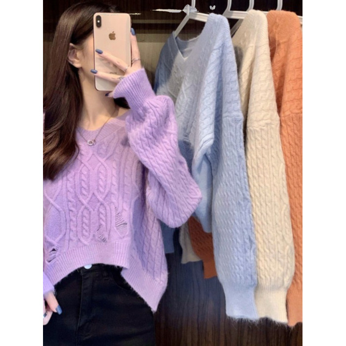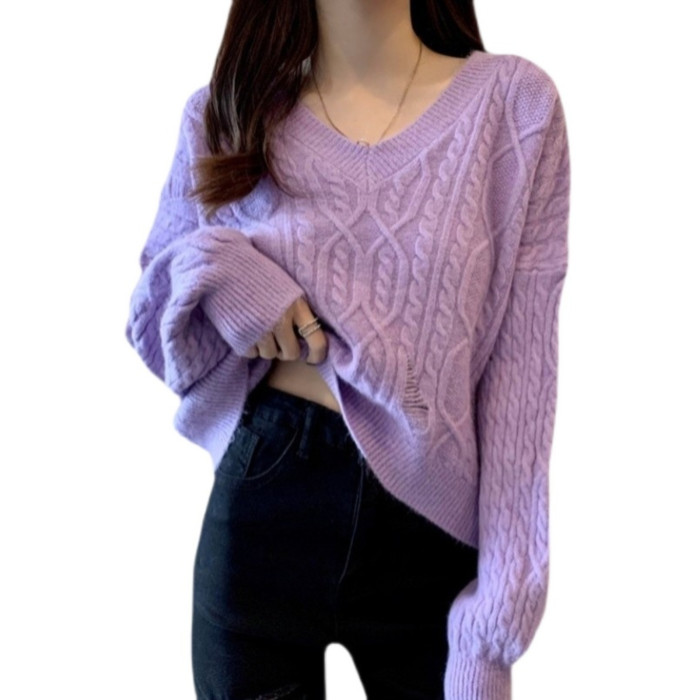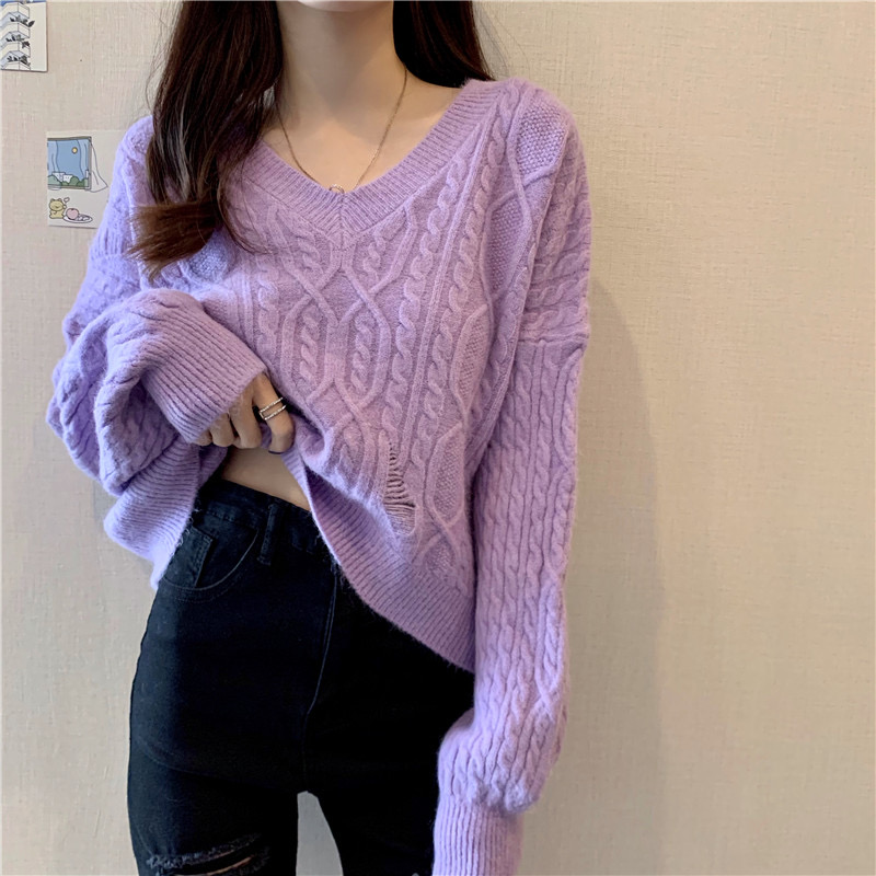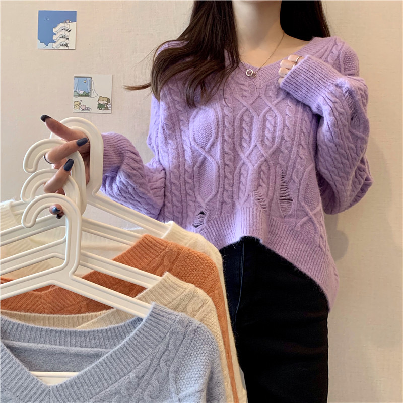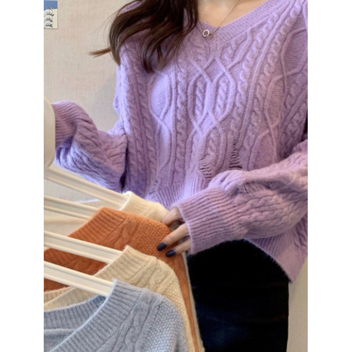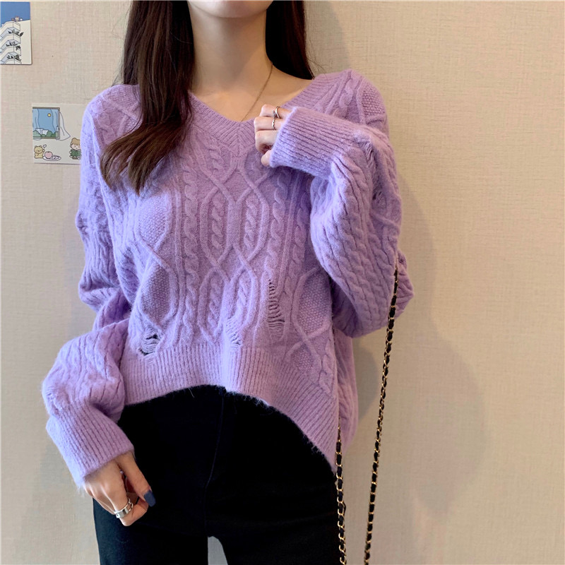 破洞麻花毛衣女針織衫套頭V領寬松慵懶秋冬短款打底百搭上衣學院