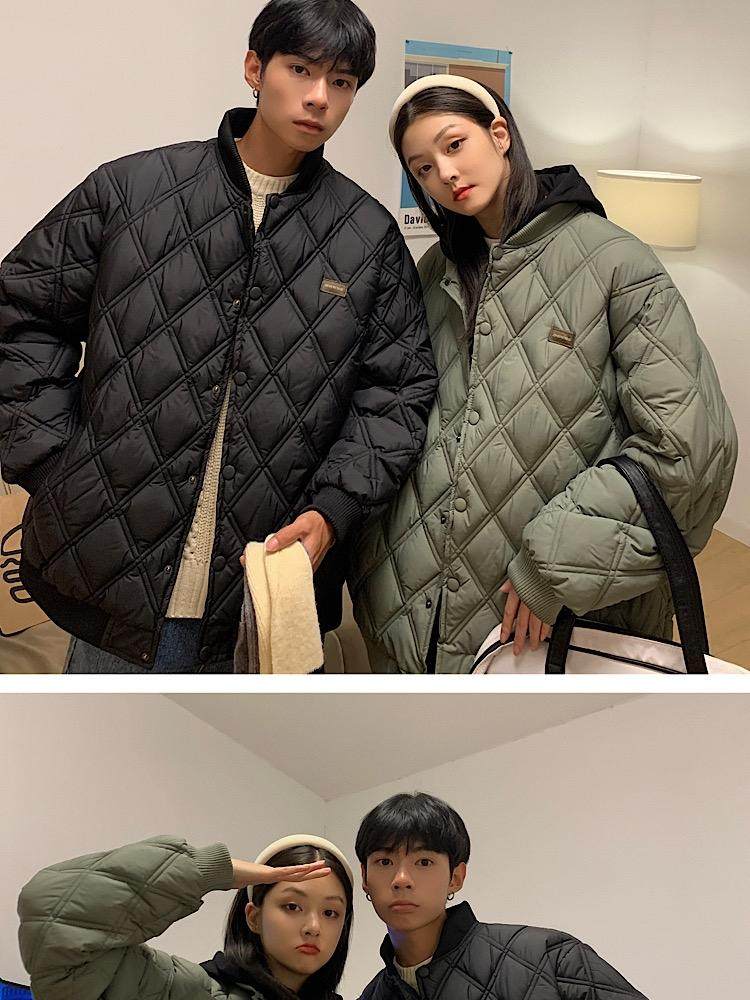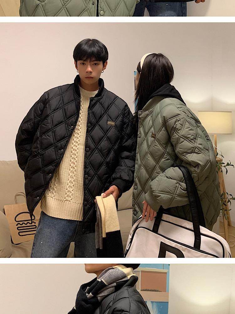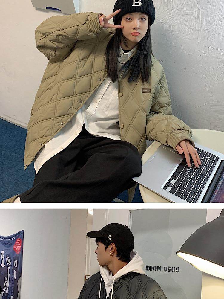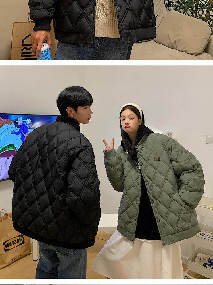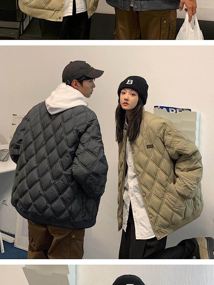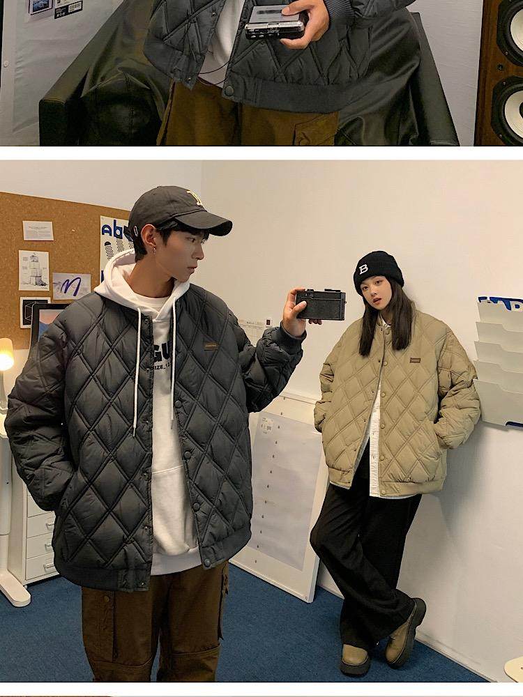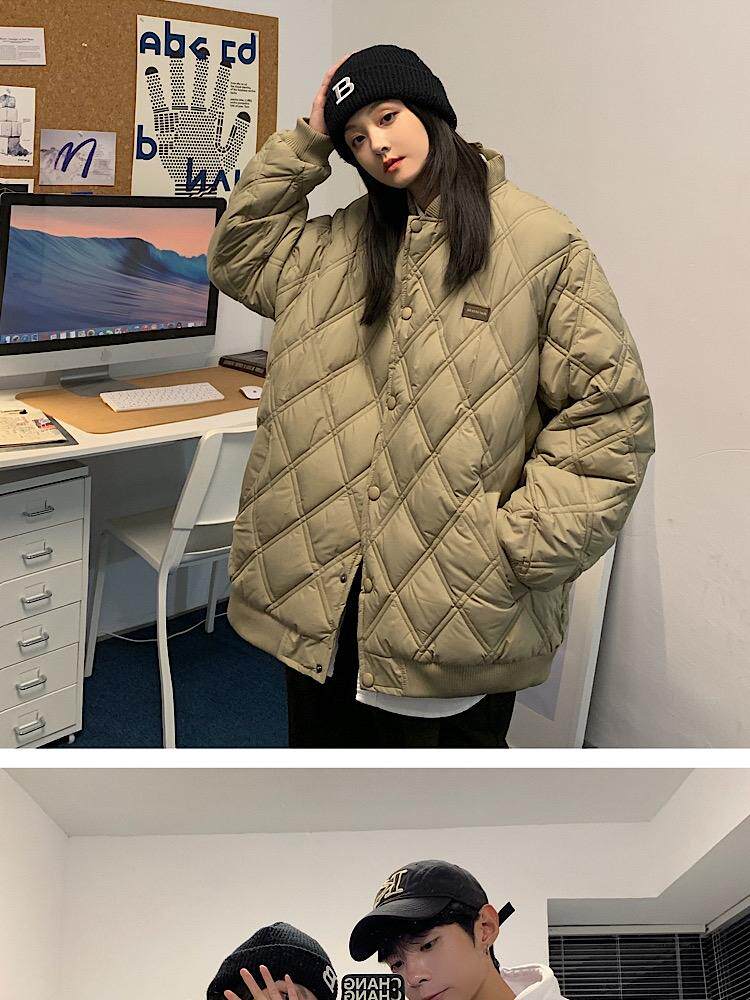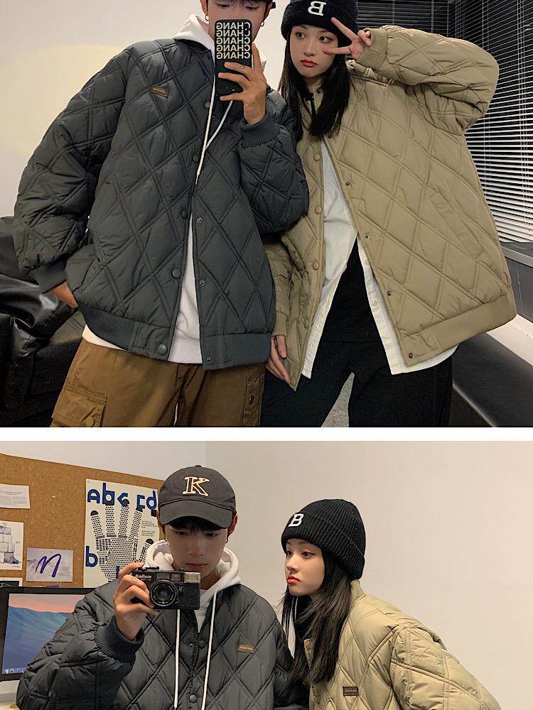 Kusen 美式潮牌菱形格棉衣夾克男潮流寬鬆情侶保暖學生棒球領棉服
