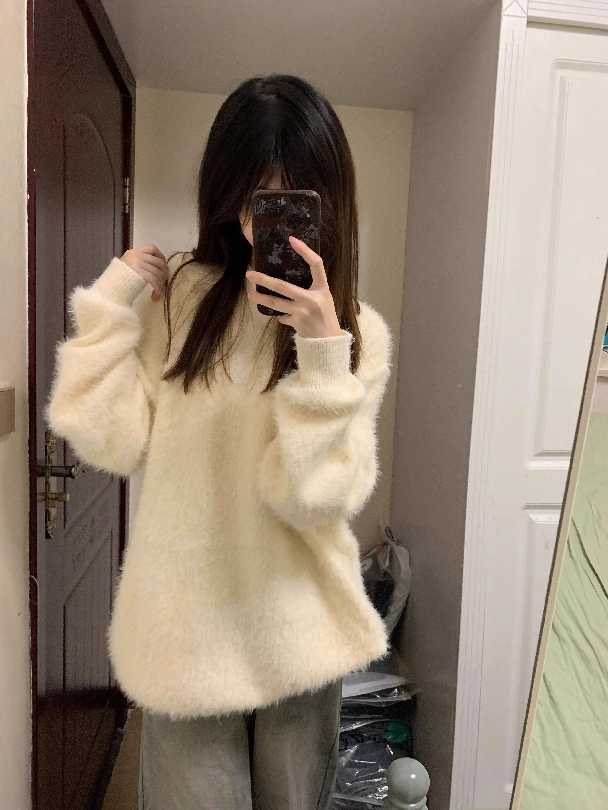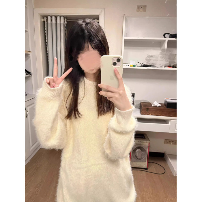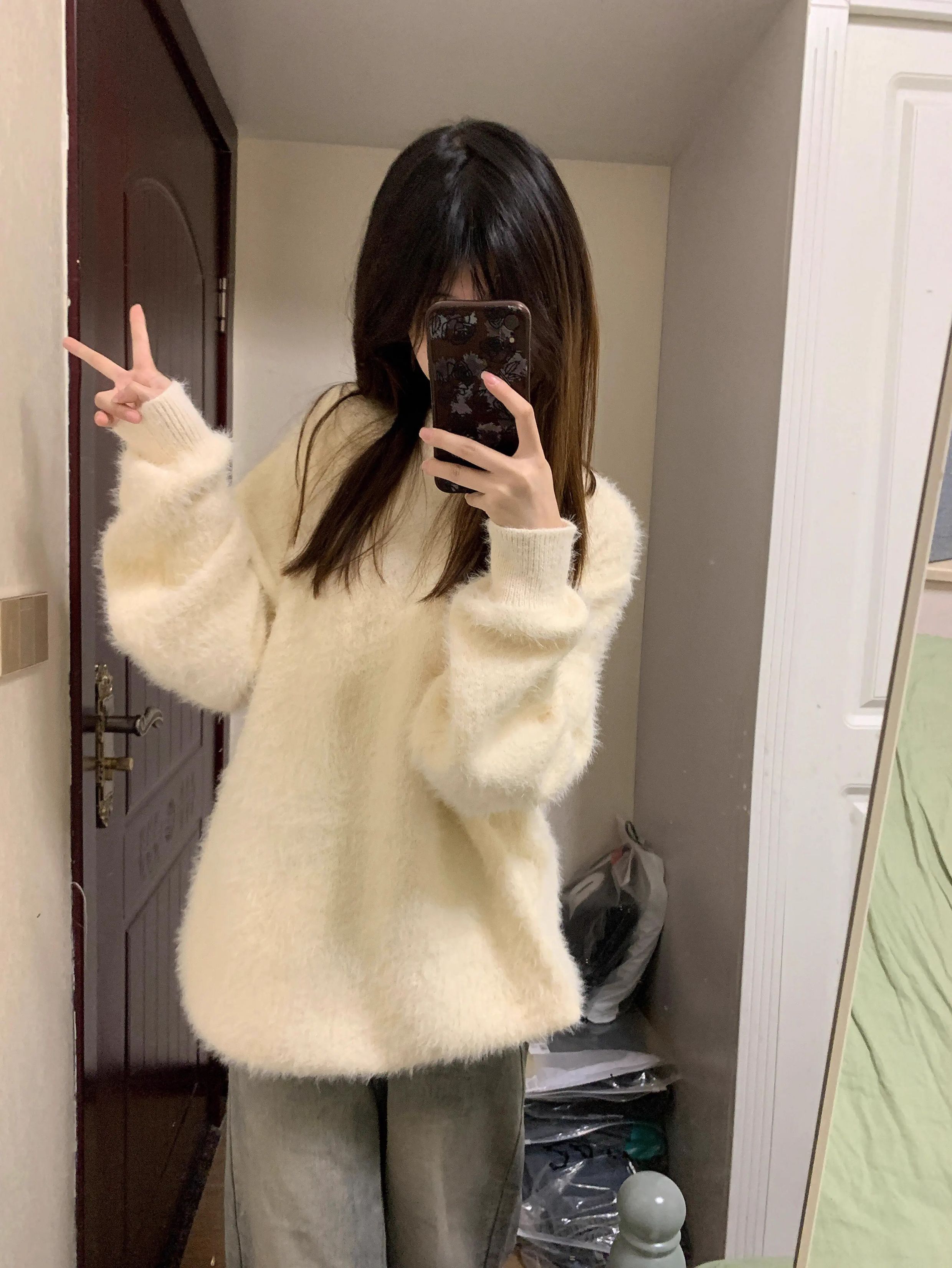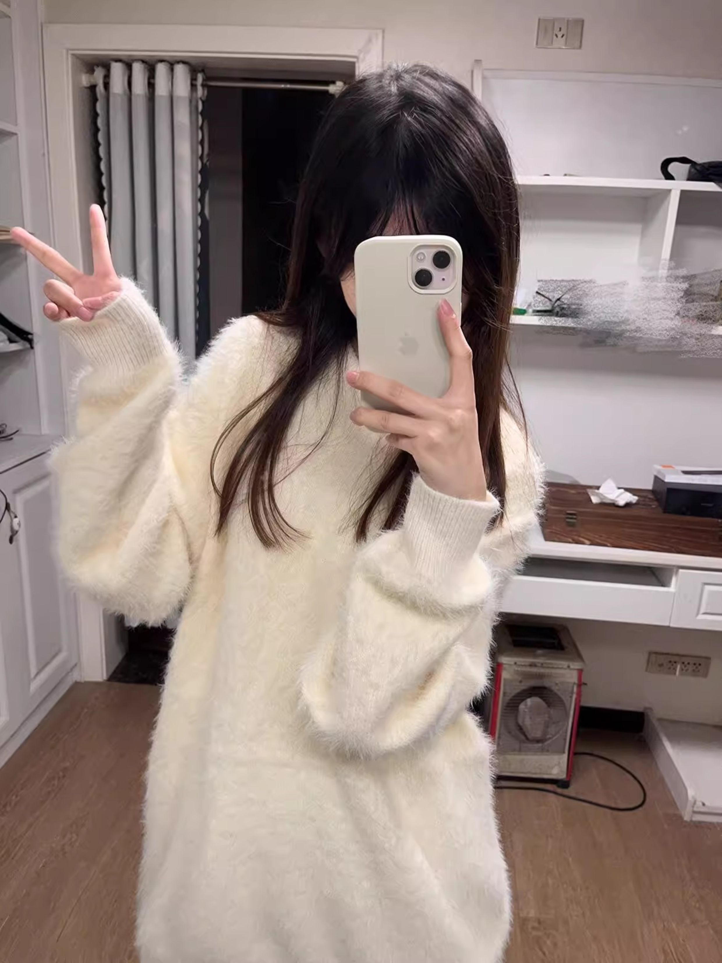 米白色海馬毛軟糯毛衣女高級感韓系慵懶風針織打底衫秋冬加厚上衣