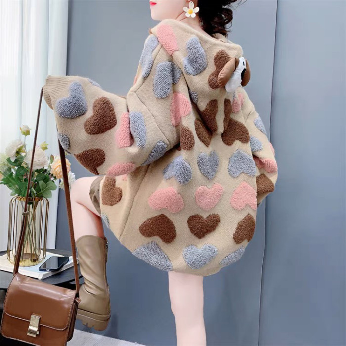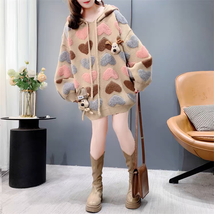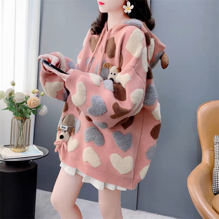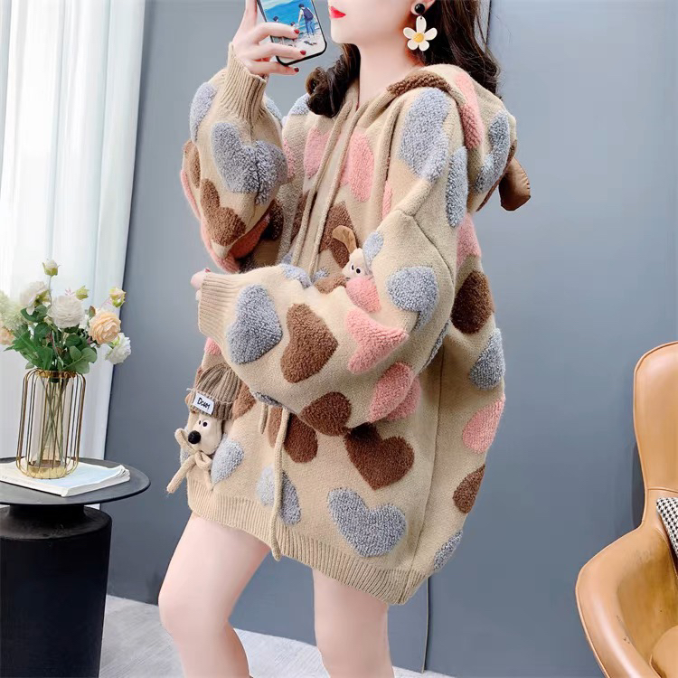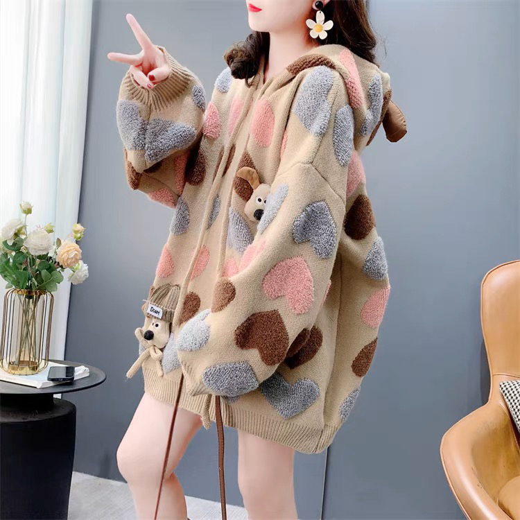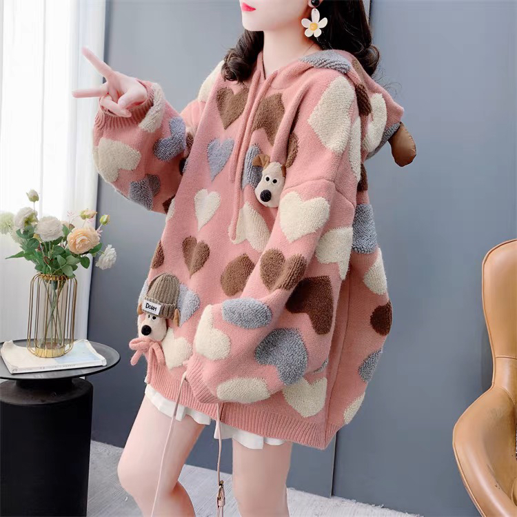 慵懶風可愛減齡愛心提花連帽毛衣女秋冬2024新款寬松加厚針織外套