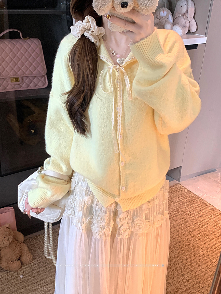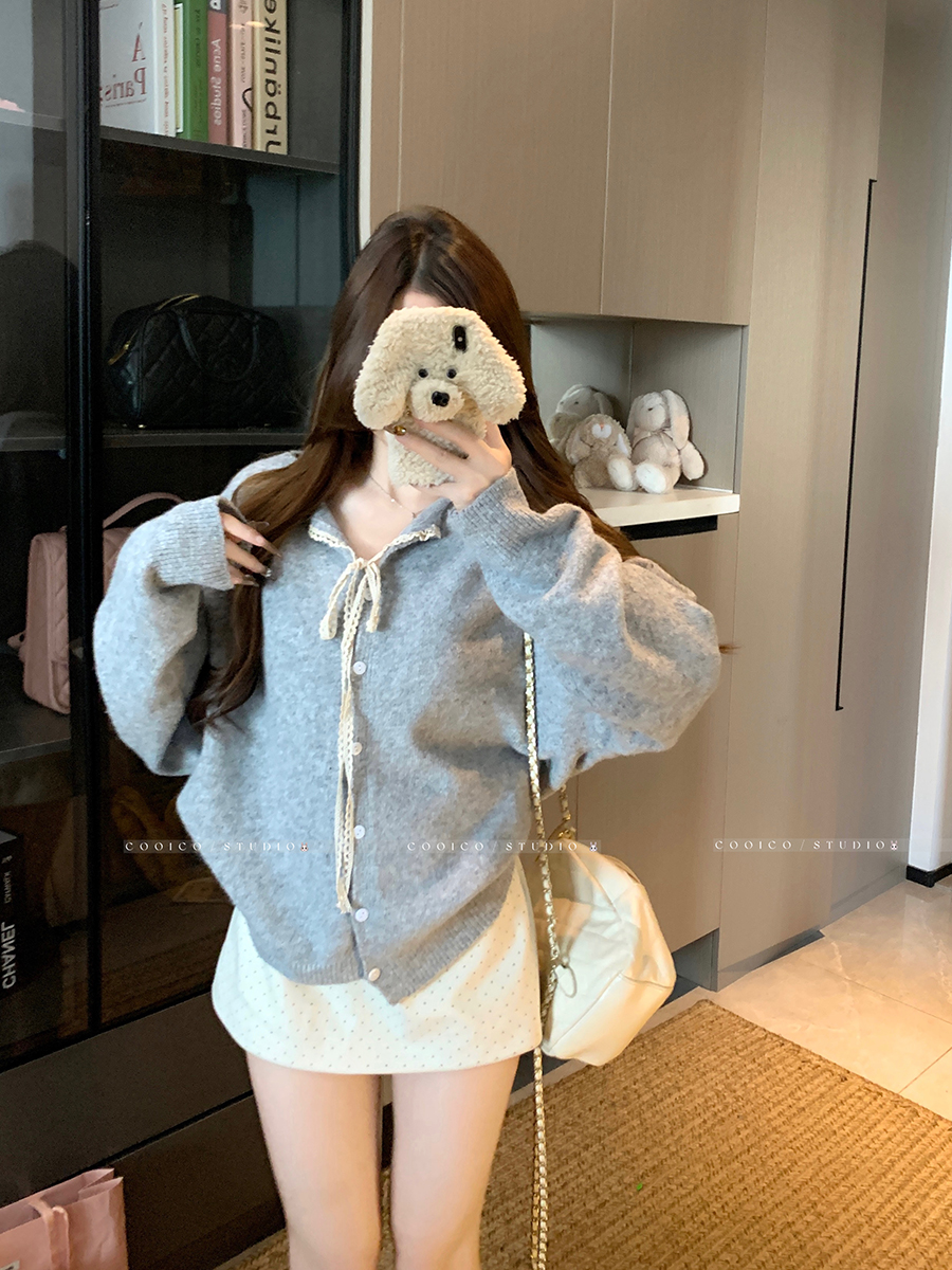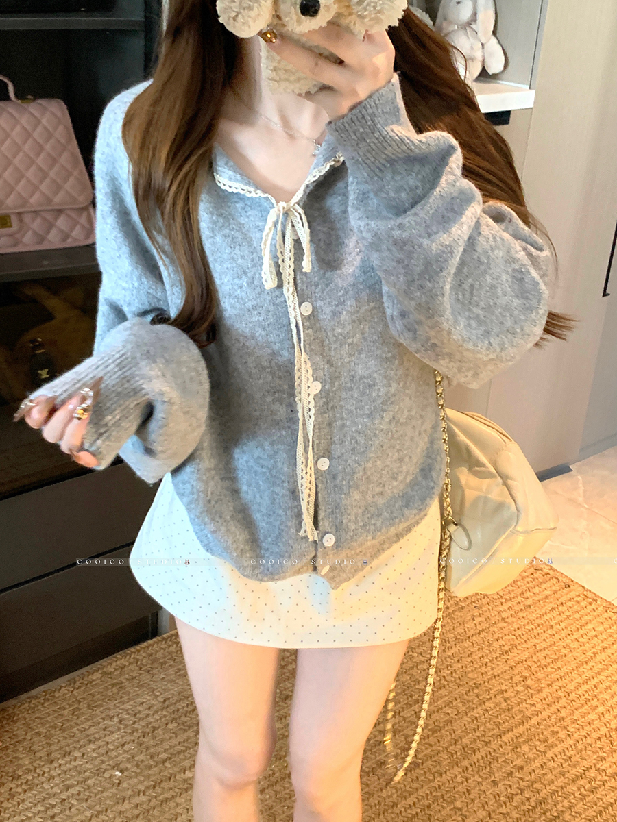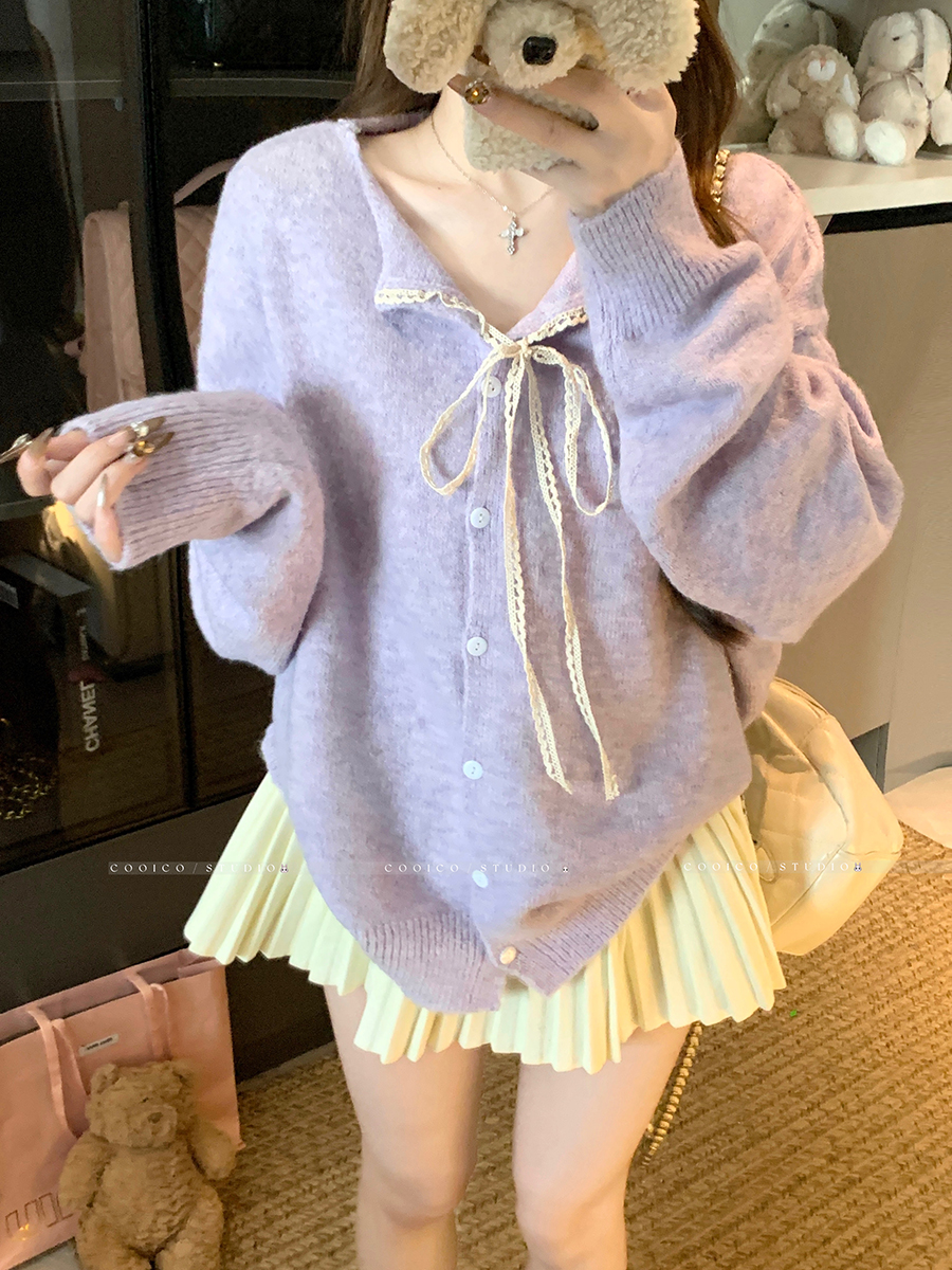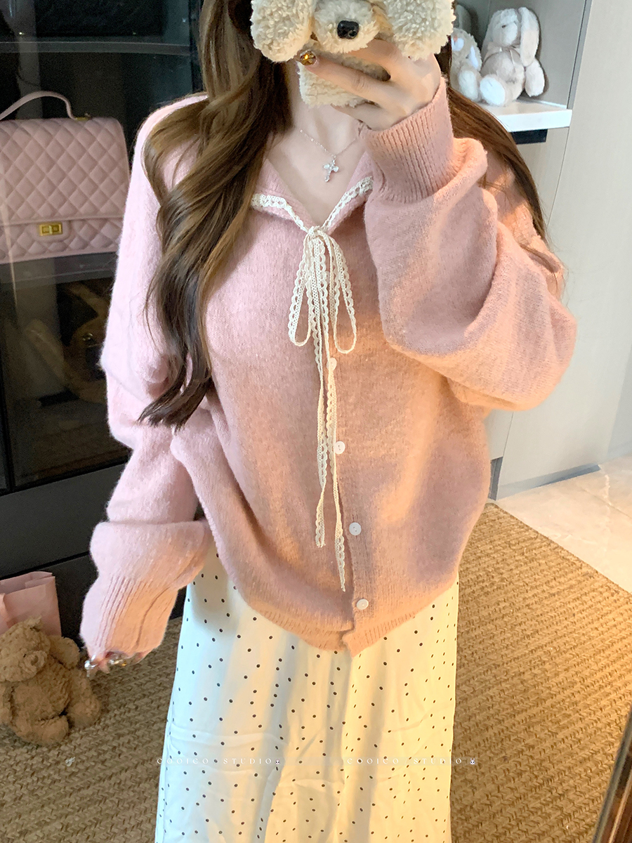 大碼微胖慵懶風蕾絲毛衣女2025新款秋季軟糯休閒長袖針織開衫上衣