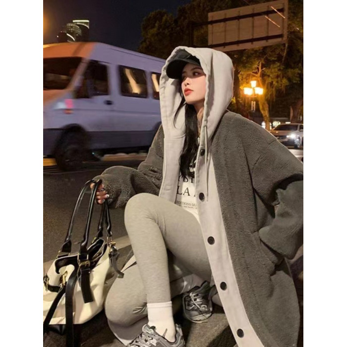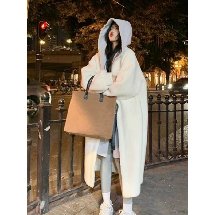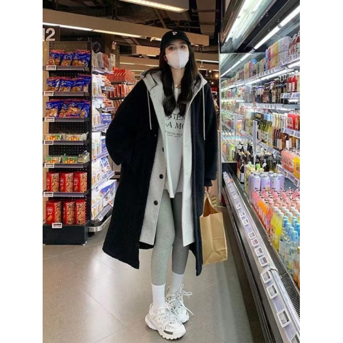 韓國chic秋冬新款長款連帽裙外套羊羔絨百搭寬松時尚外套ins潮