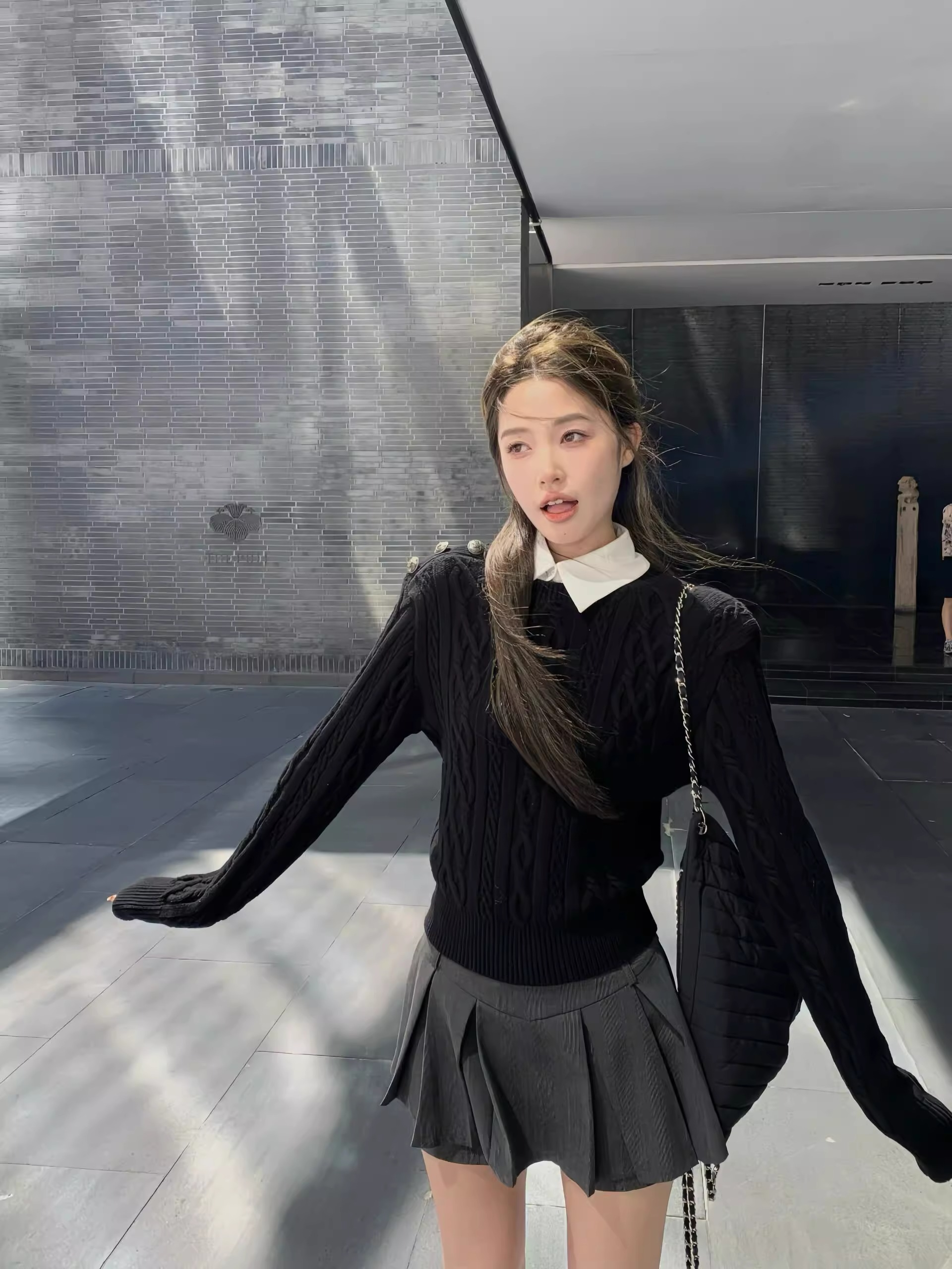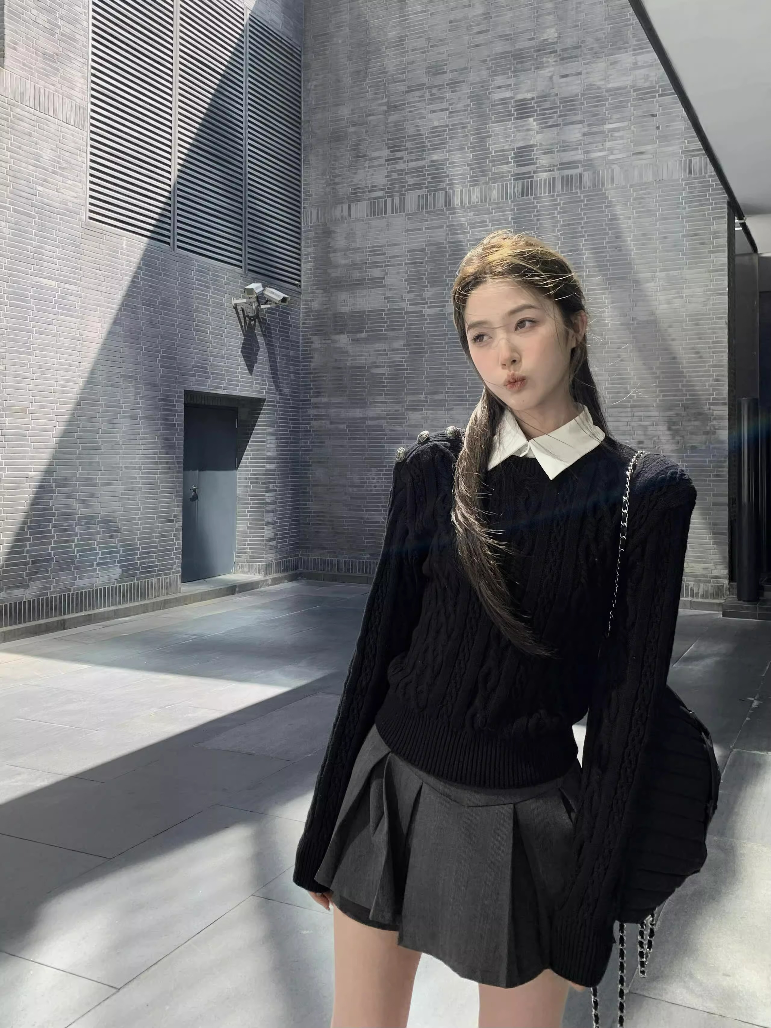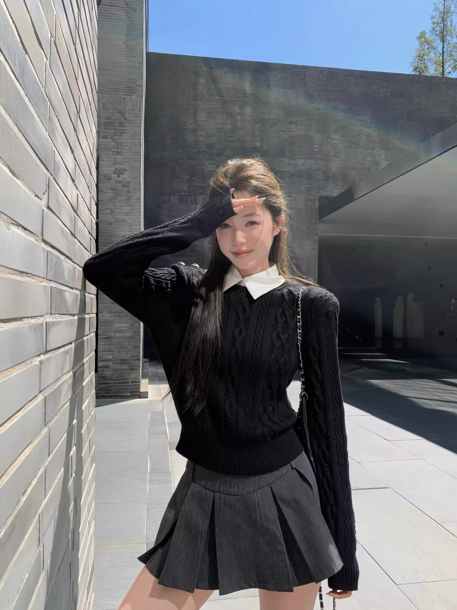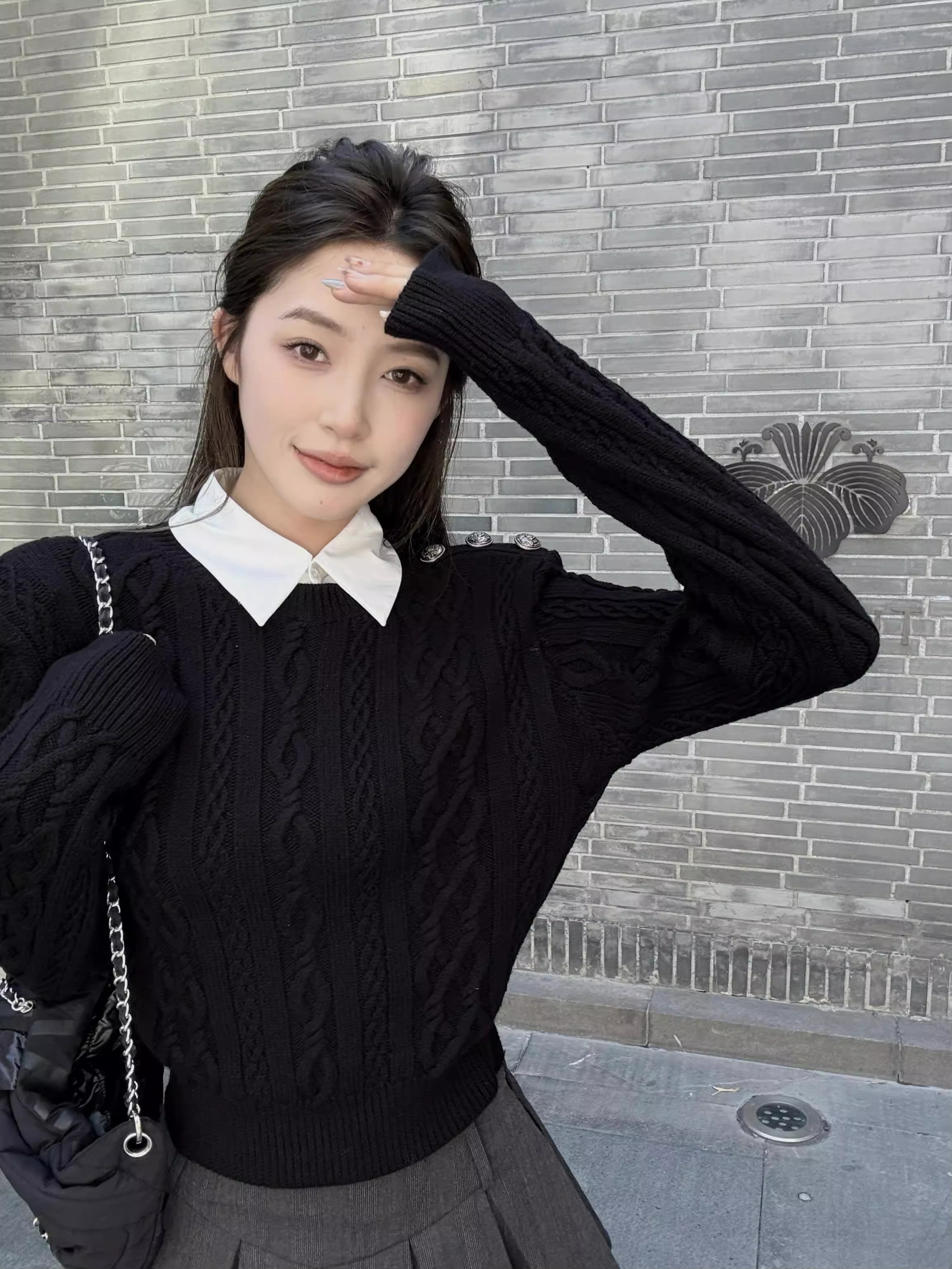 美式復古學院風假兩件絞花黑色毛衣女秋冬季高級感正肩針織衫上衣