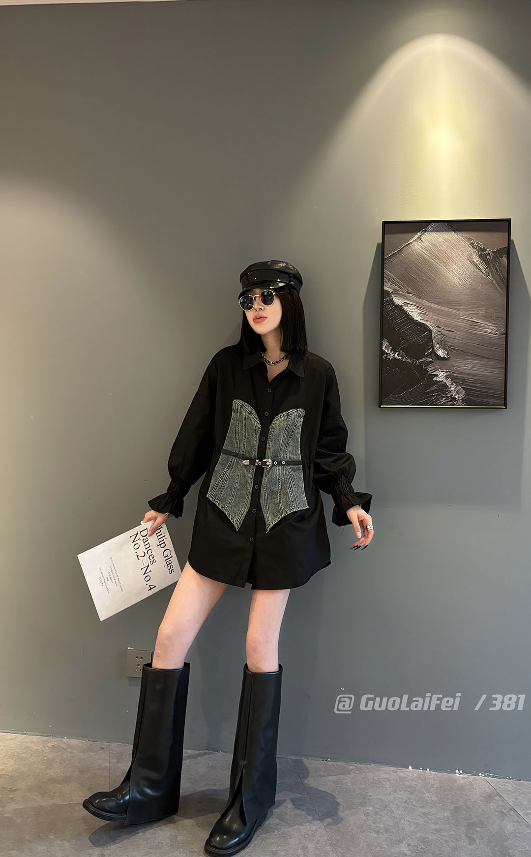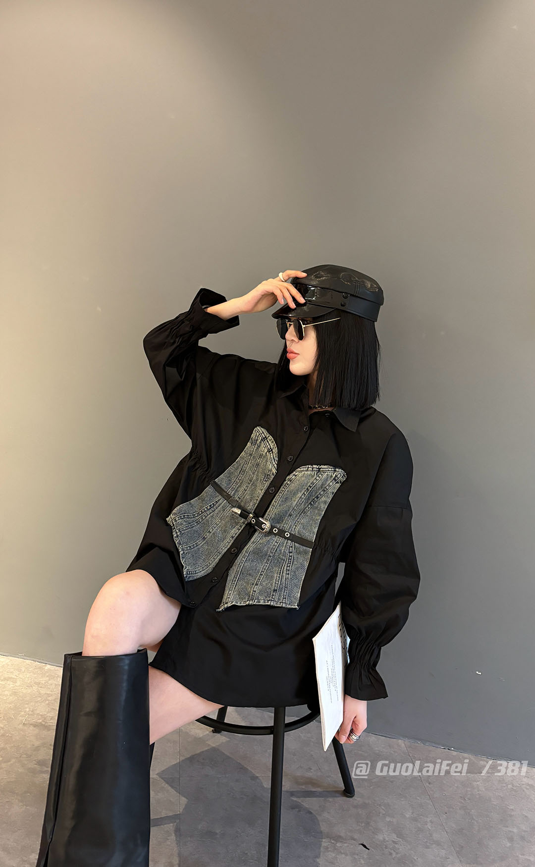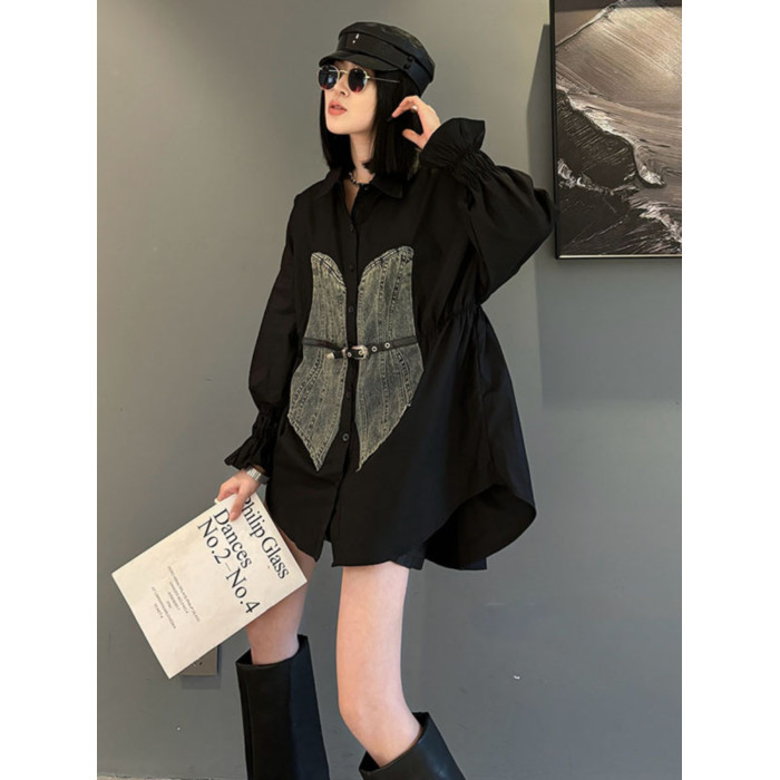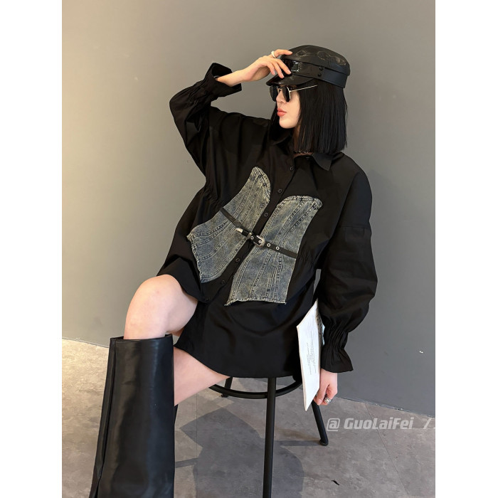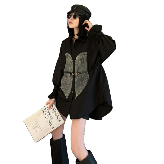 休閒2025秋冬季新款寬松長袖拼牛仔襯衫外套POLO領大碼女裝打底衫