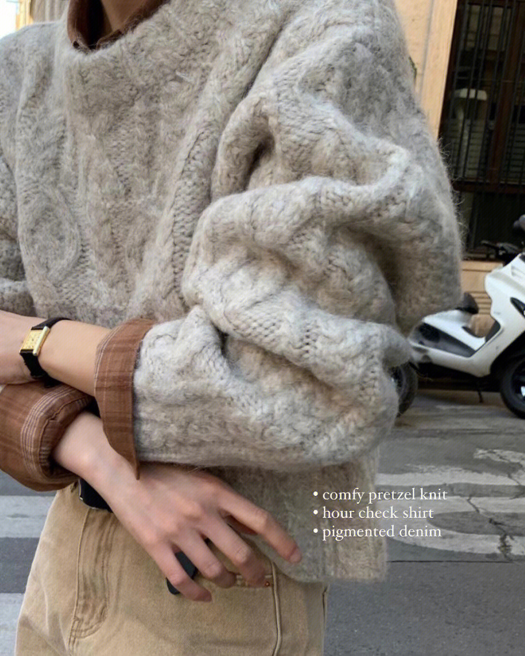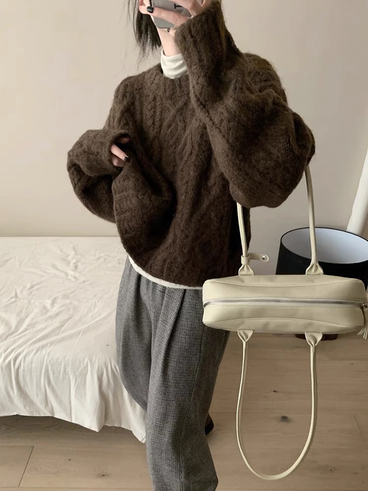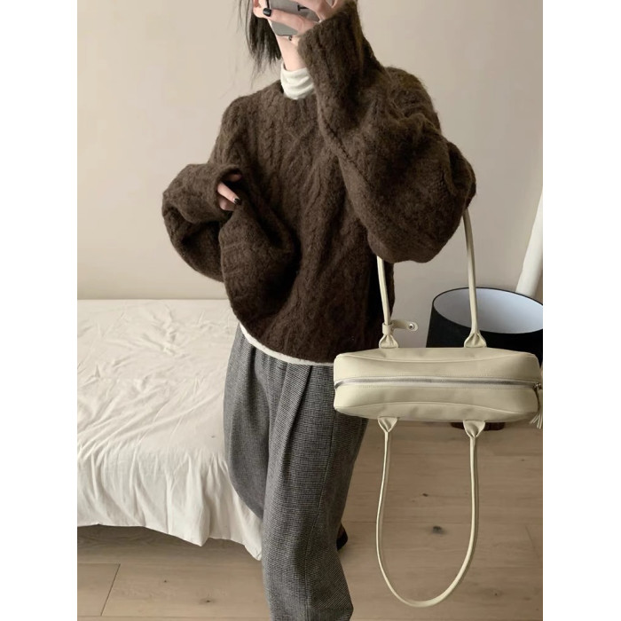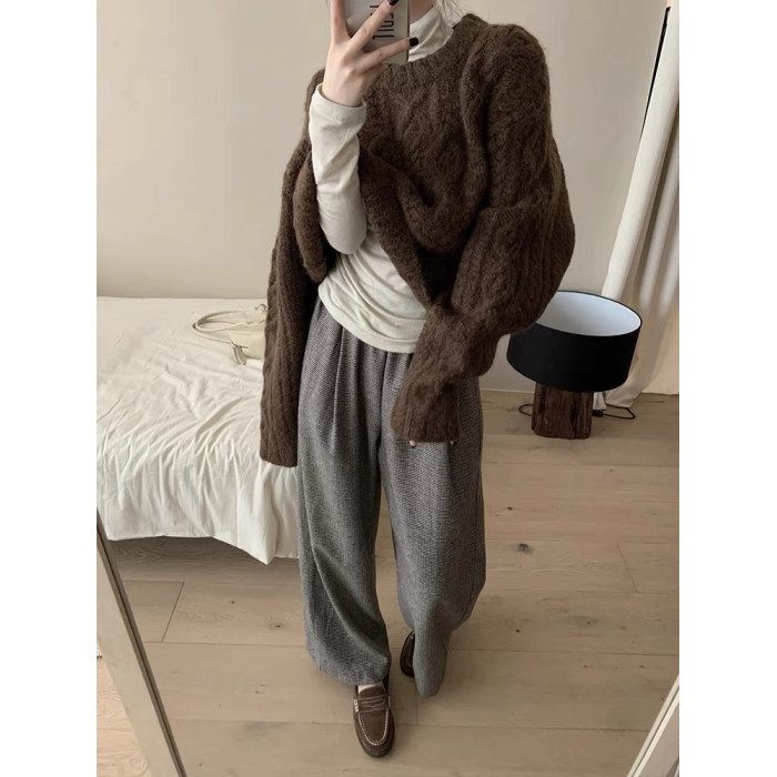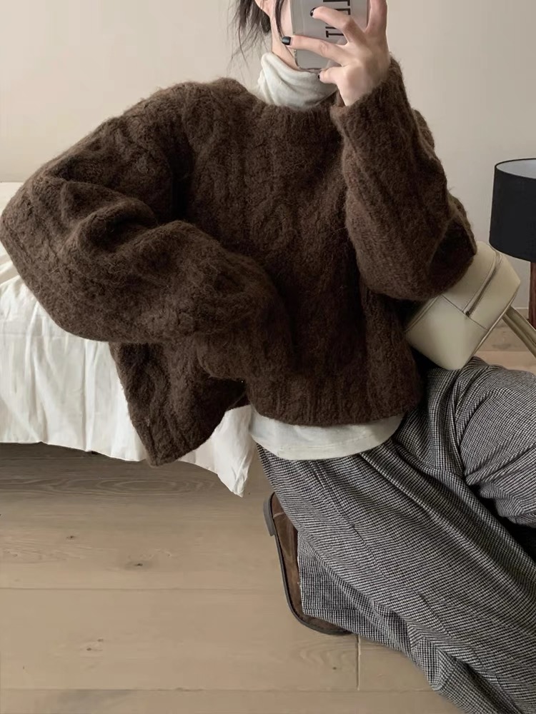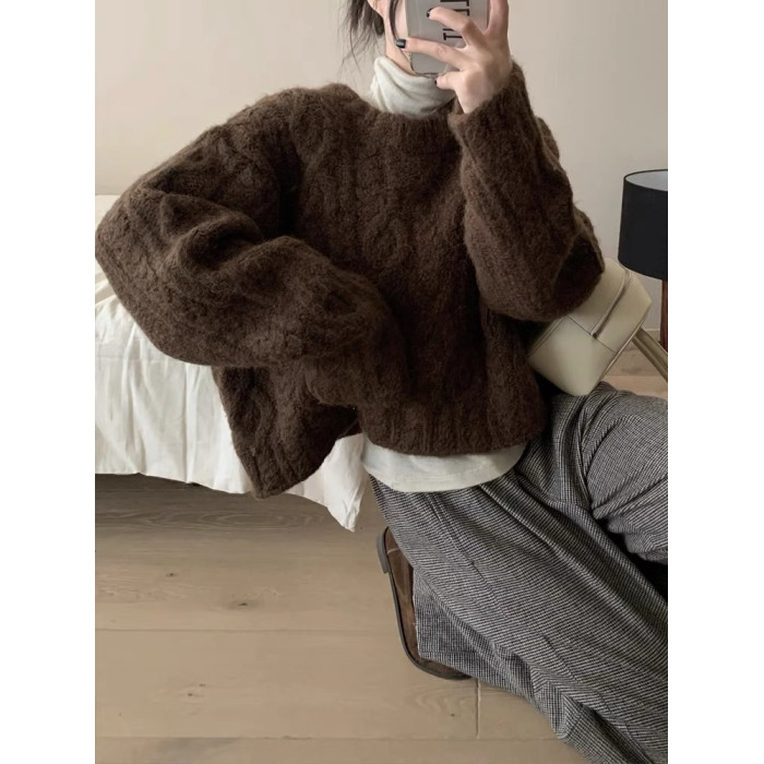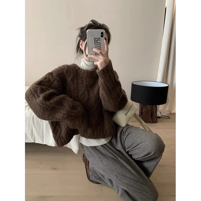 高級感咖色短款麻花毛衣女秋冬加厚圓領外穿慵懶風軟糯針織衫上衣