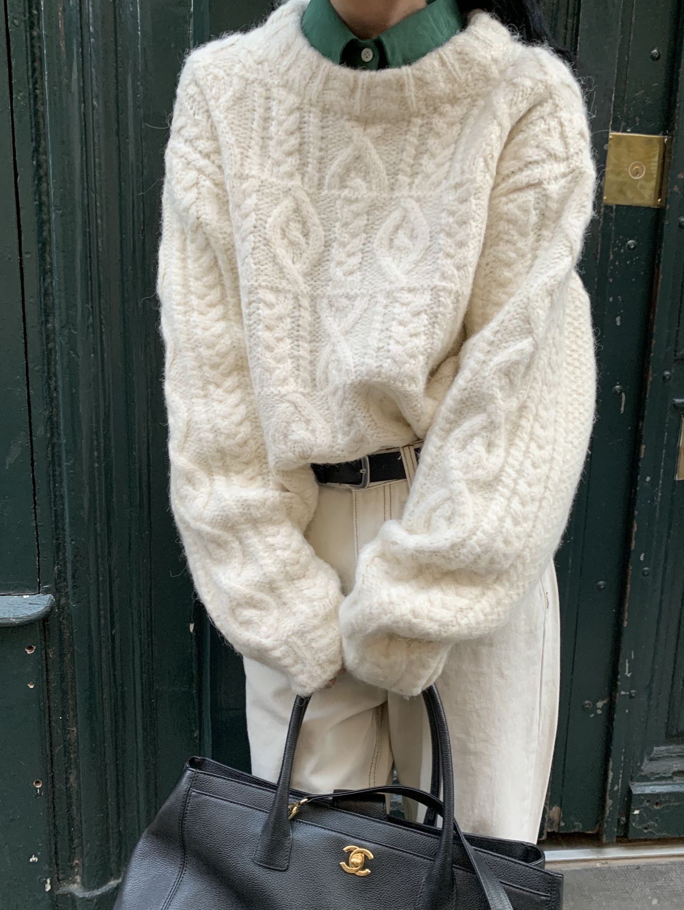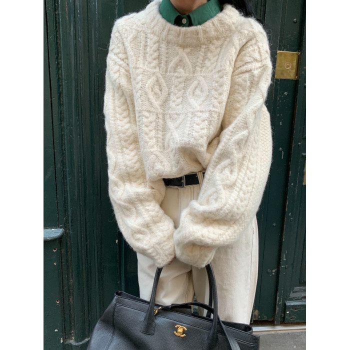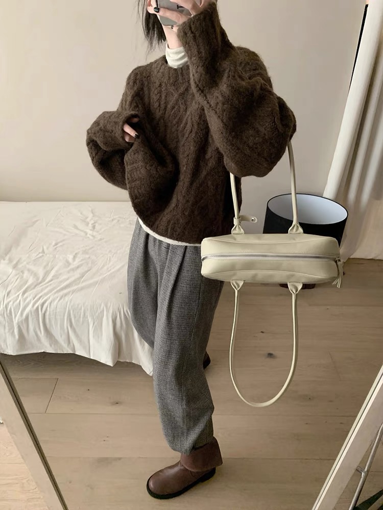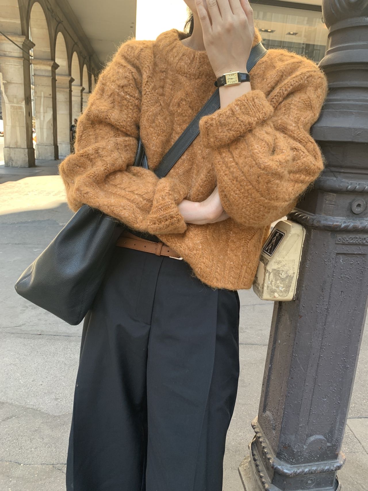 高級感咖色短款麻花毛衣女秋冬加厚圓領外穿慵懶風軟糯針織衫上衣