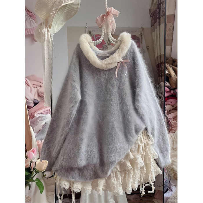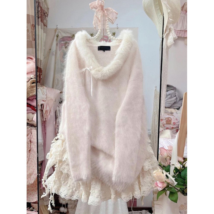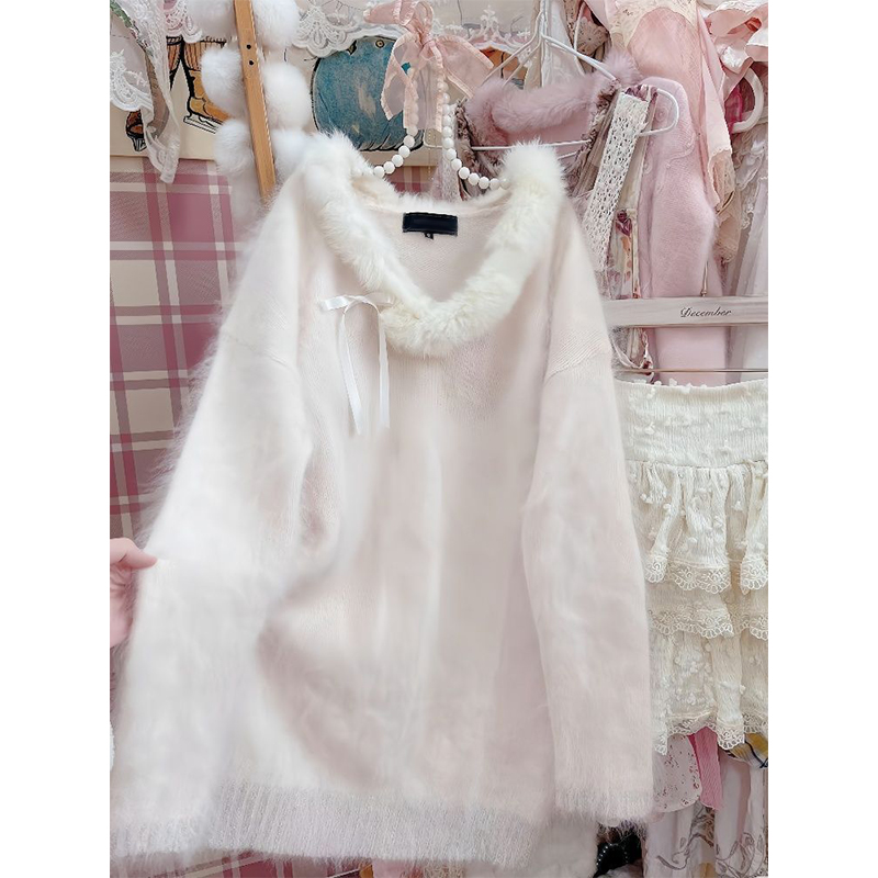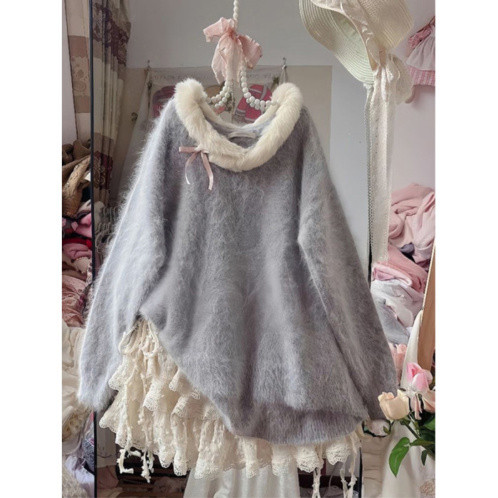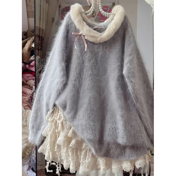 甜美溫柔蝴蝶結套頭毛衣女秋冬軟糯仿水貂絨針織衫慵懶毛毛領上衣