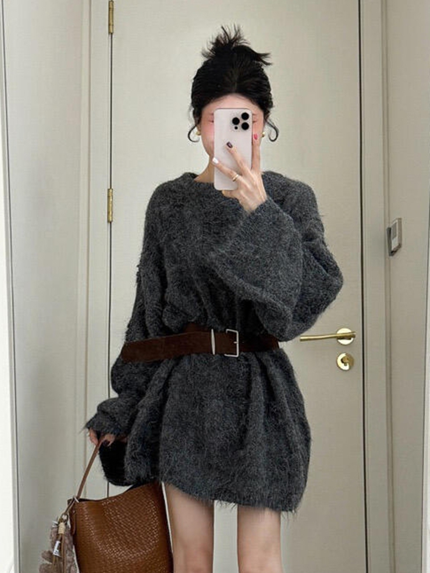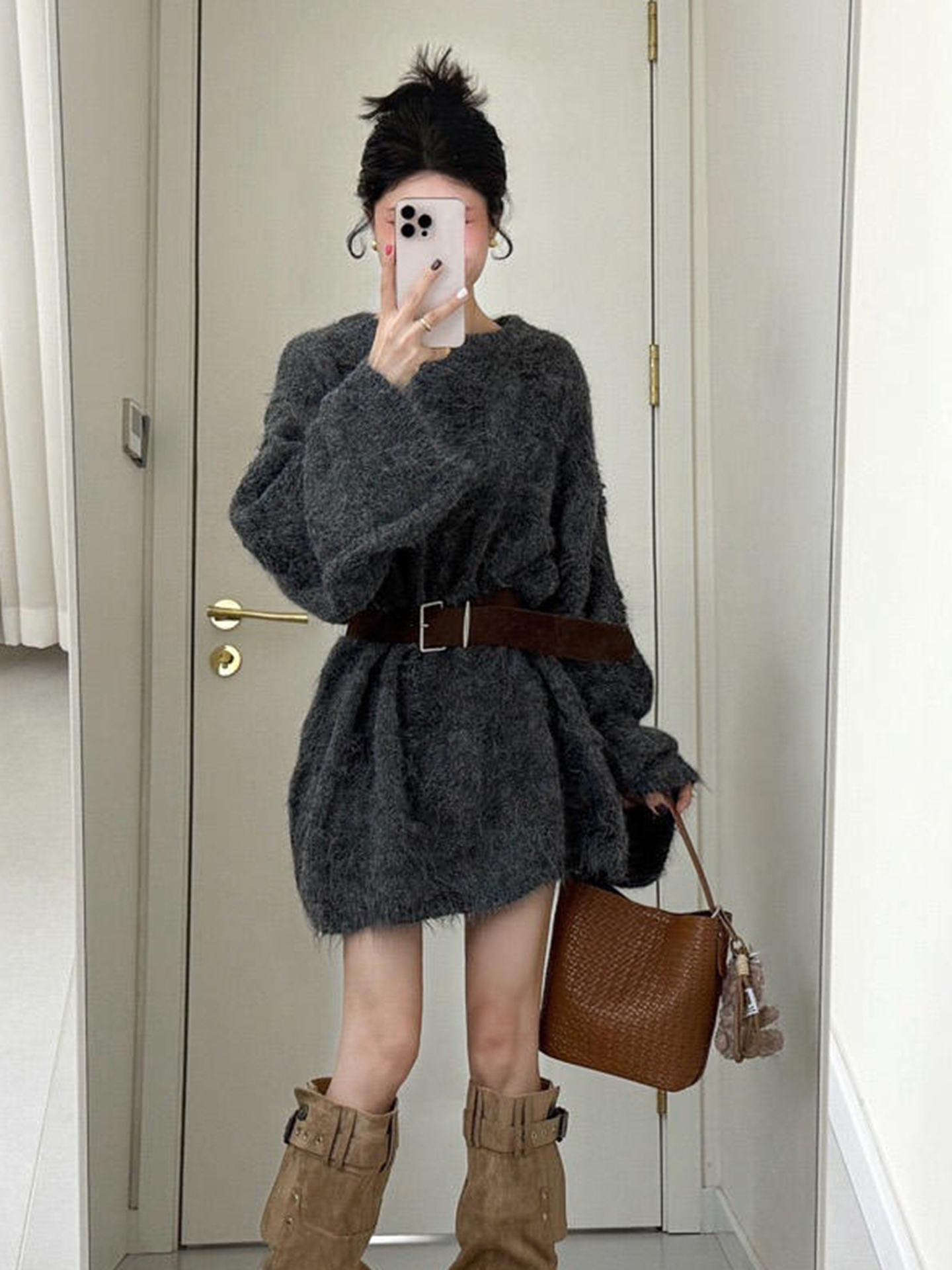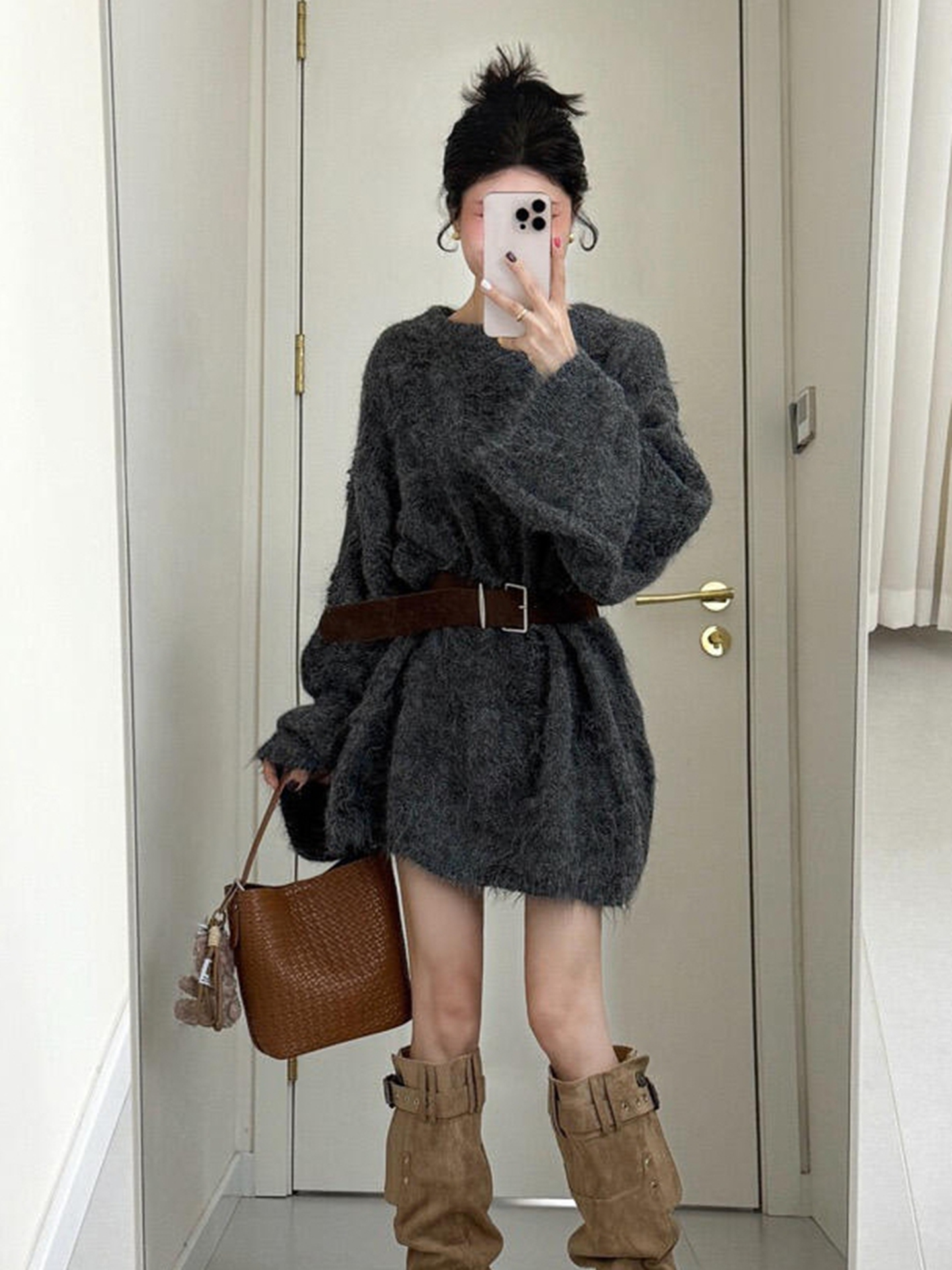 慵懶老錢風灰色軟糯中長款毛衣女秋冬季高級感加厚寬松針織衫上衣