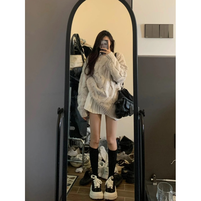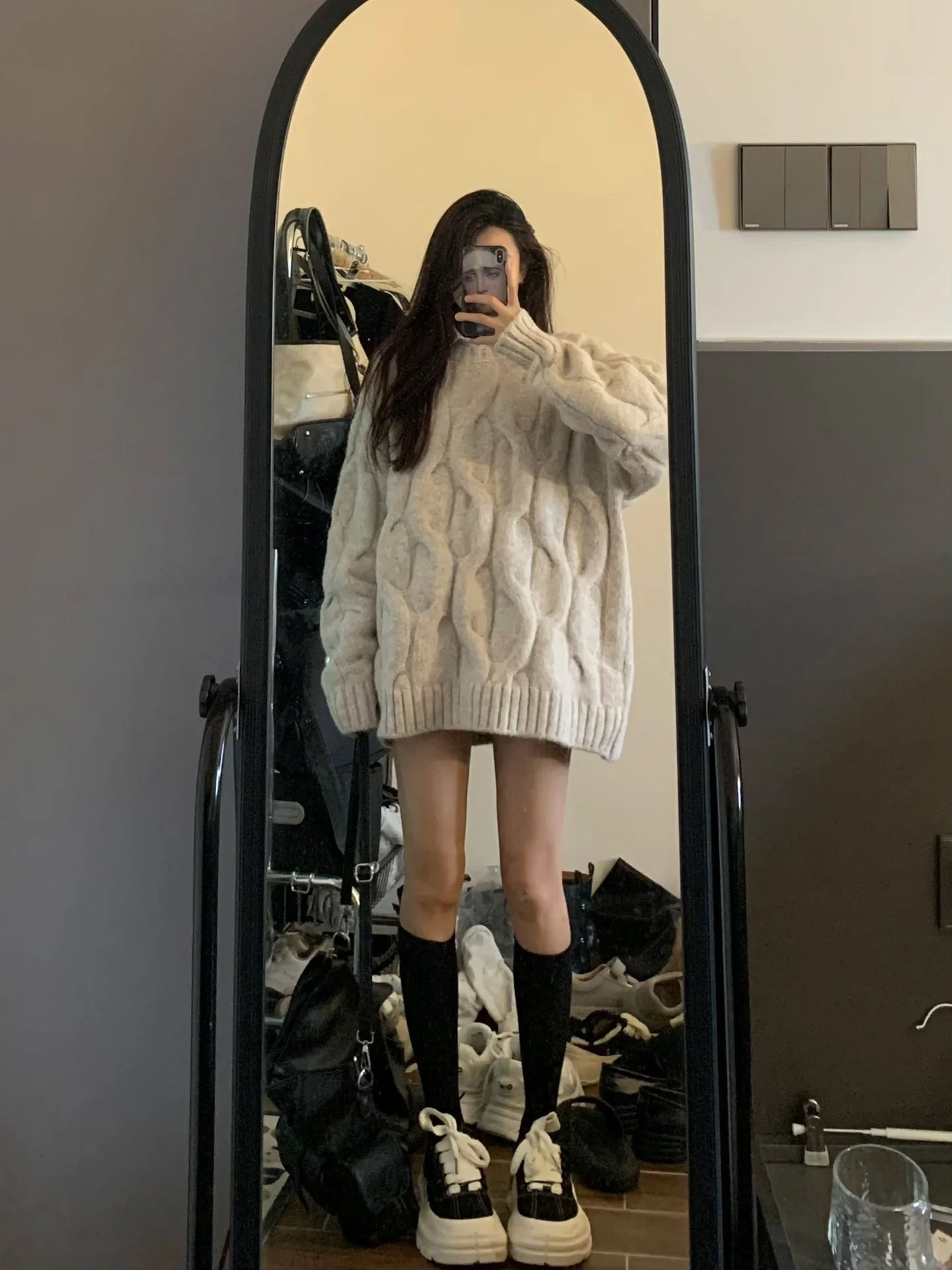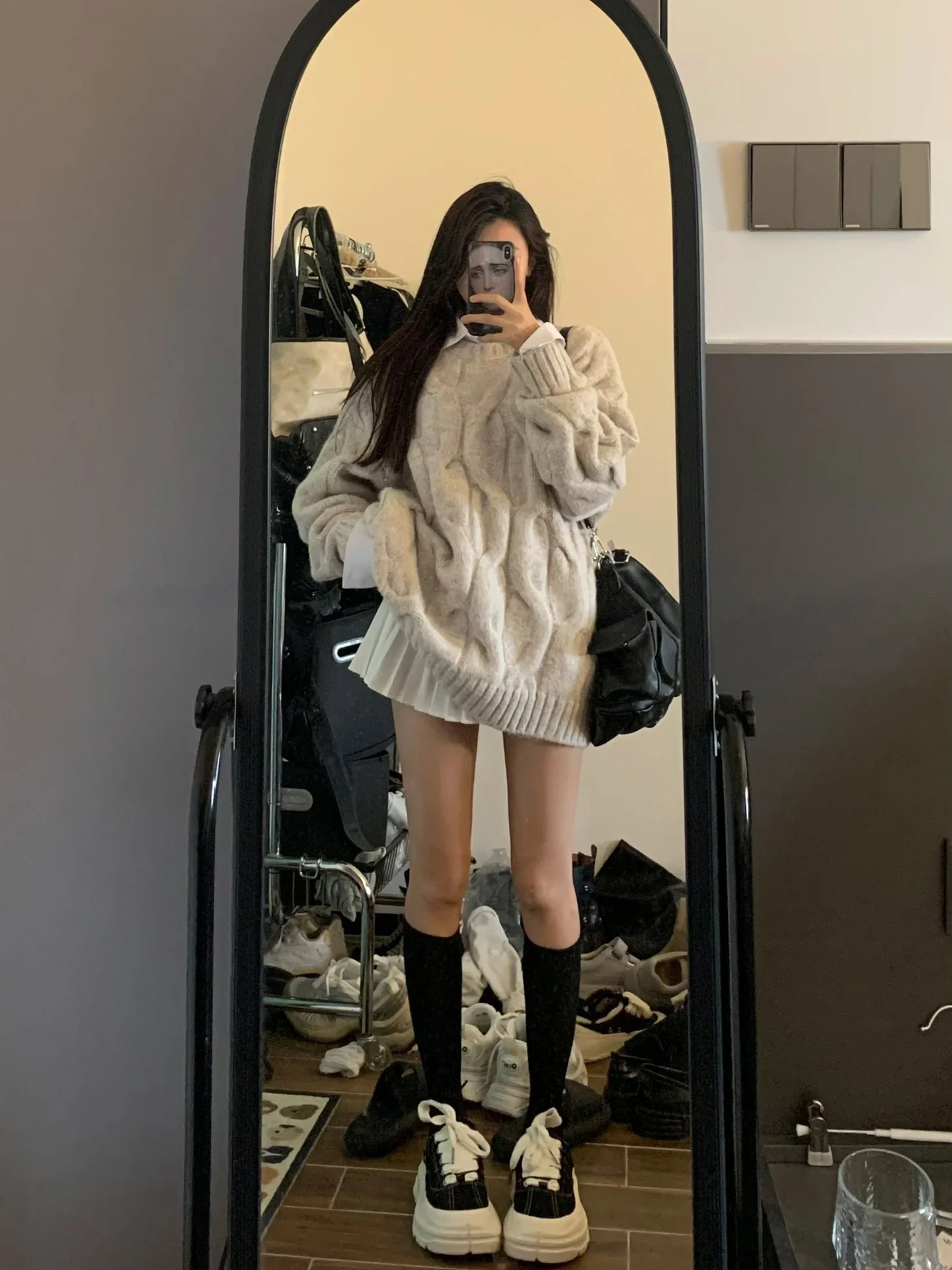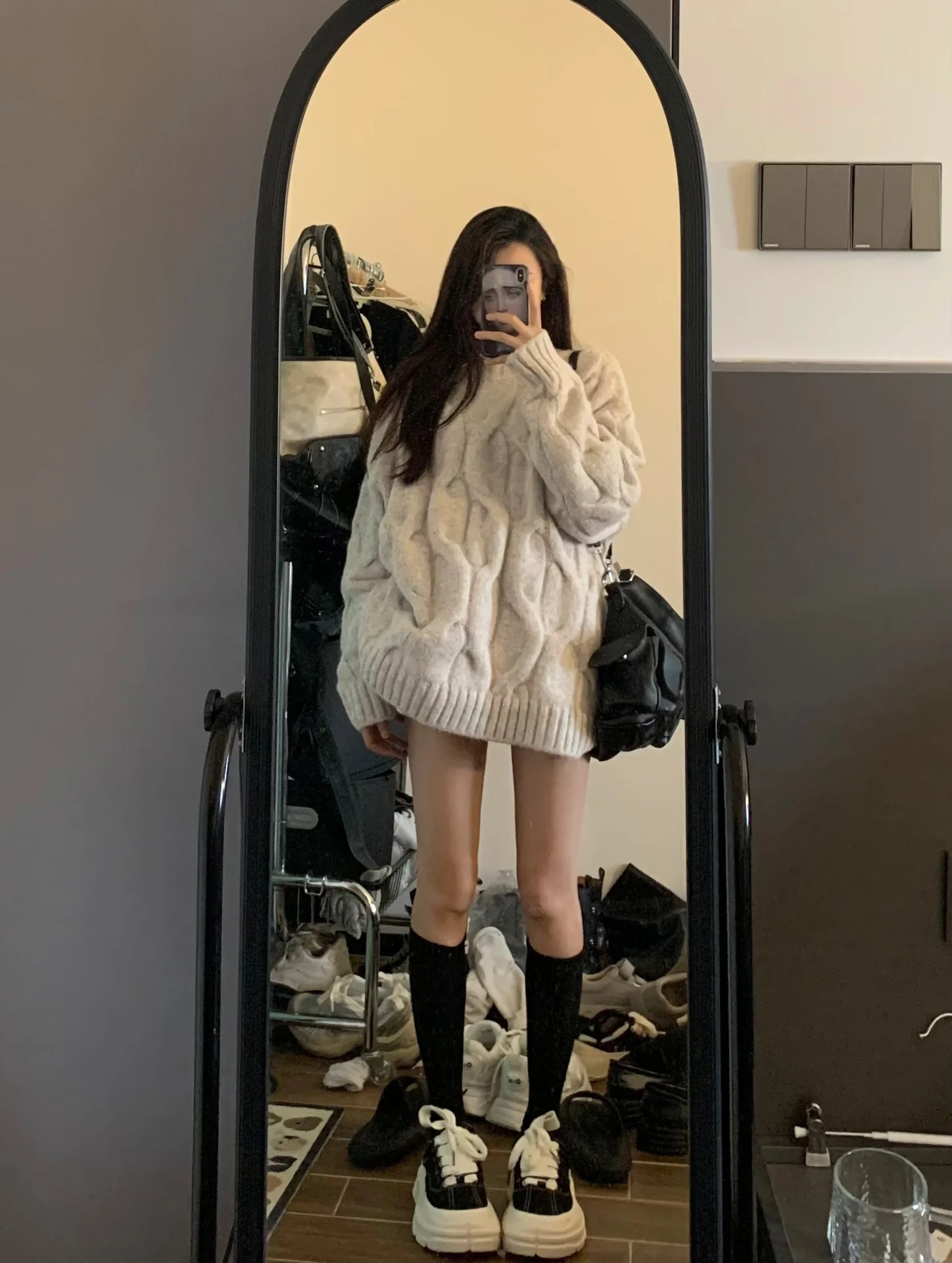 日系奶fufu麻花圓領毛衣女秋冬寬松慵懶風bf軟糯加厚針織衫外套潮