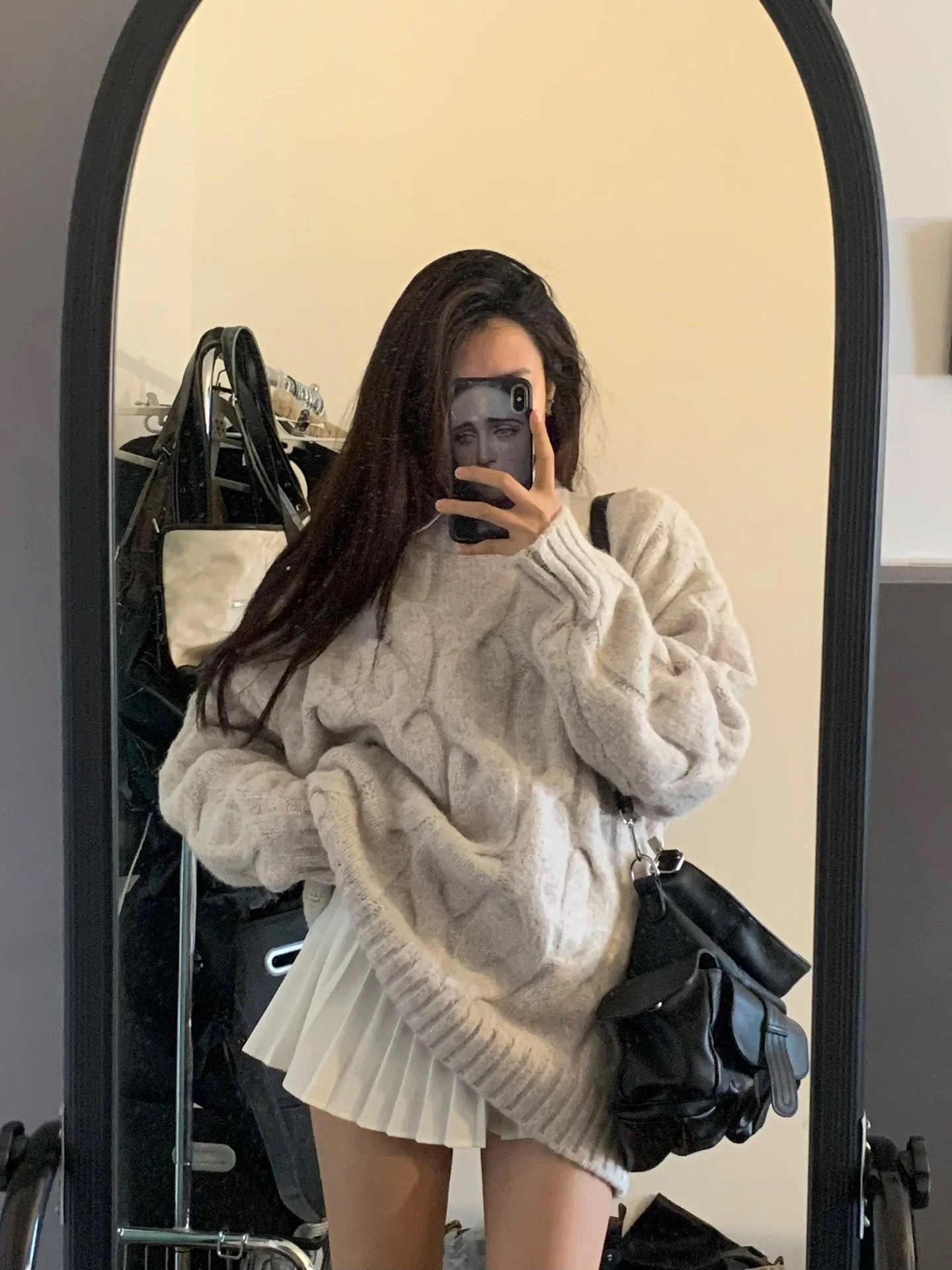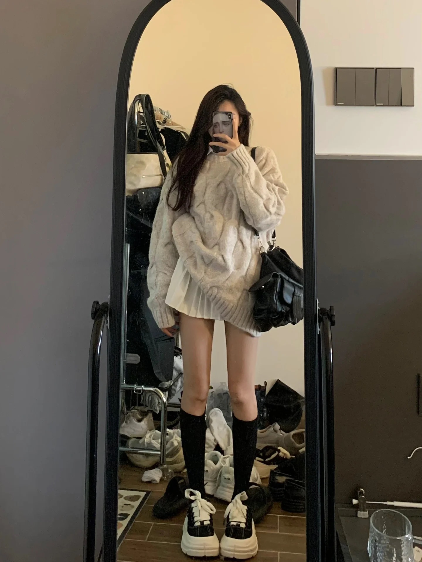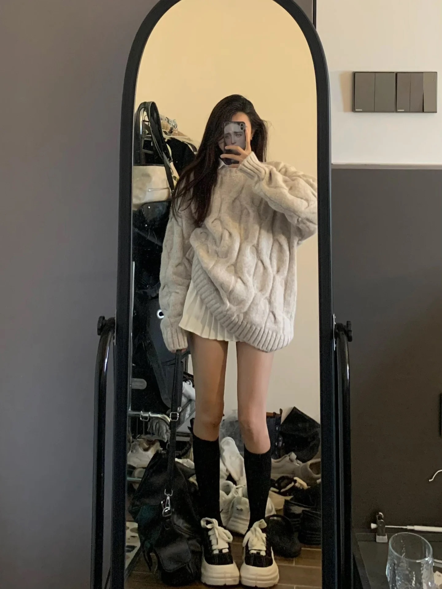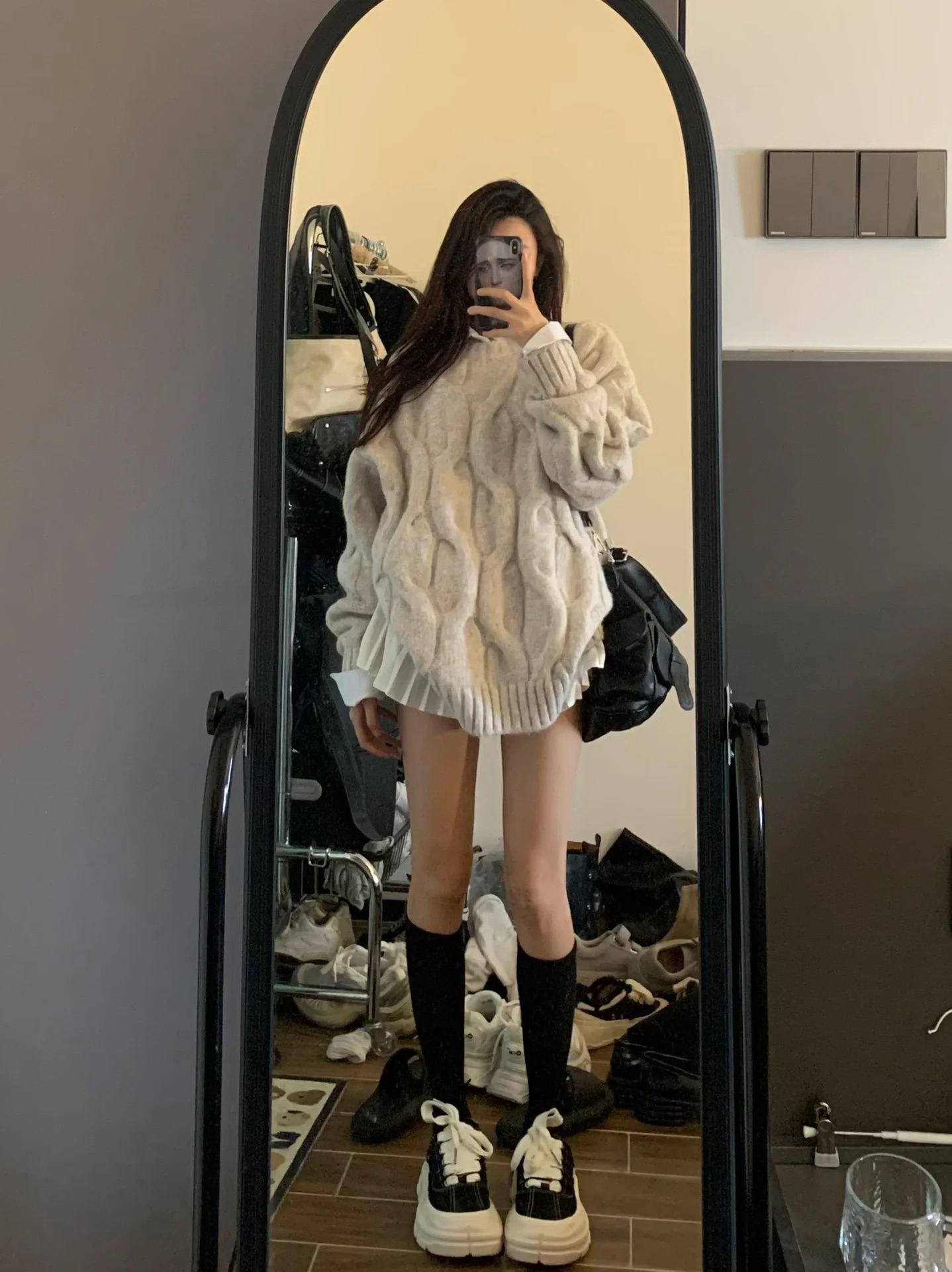 日系奶fufu麻花圓領毛衣女秋冬寬松慵懶風bf軟糯加厚針織衫外套潮