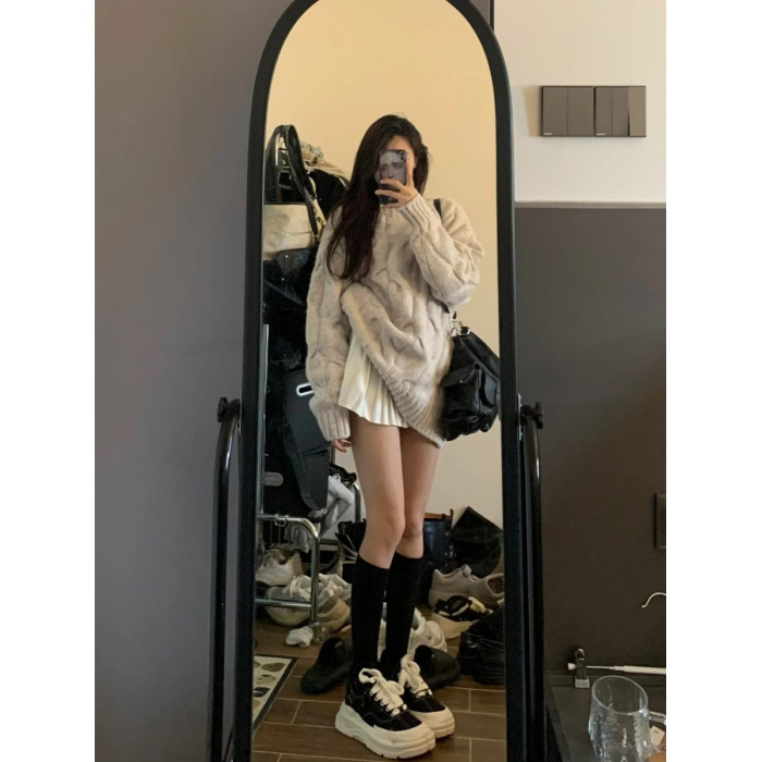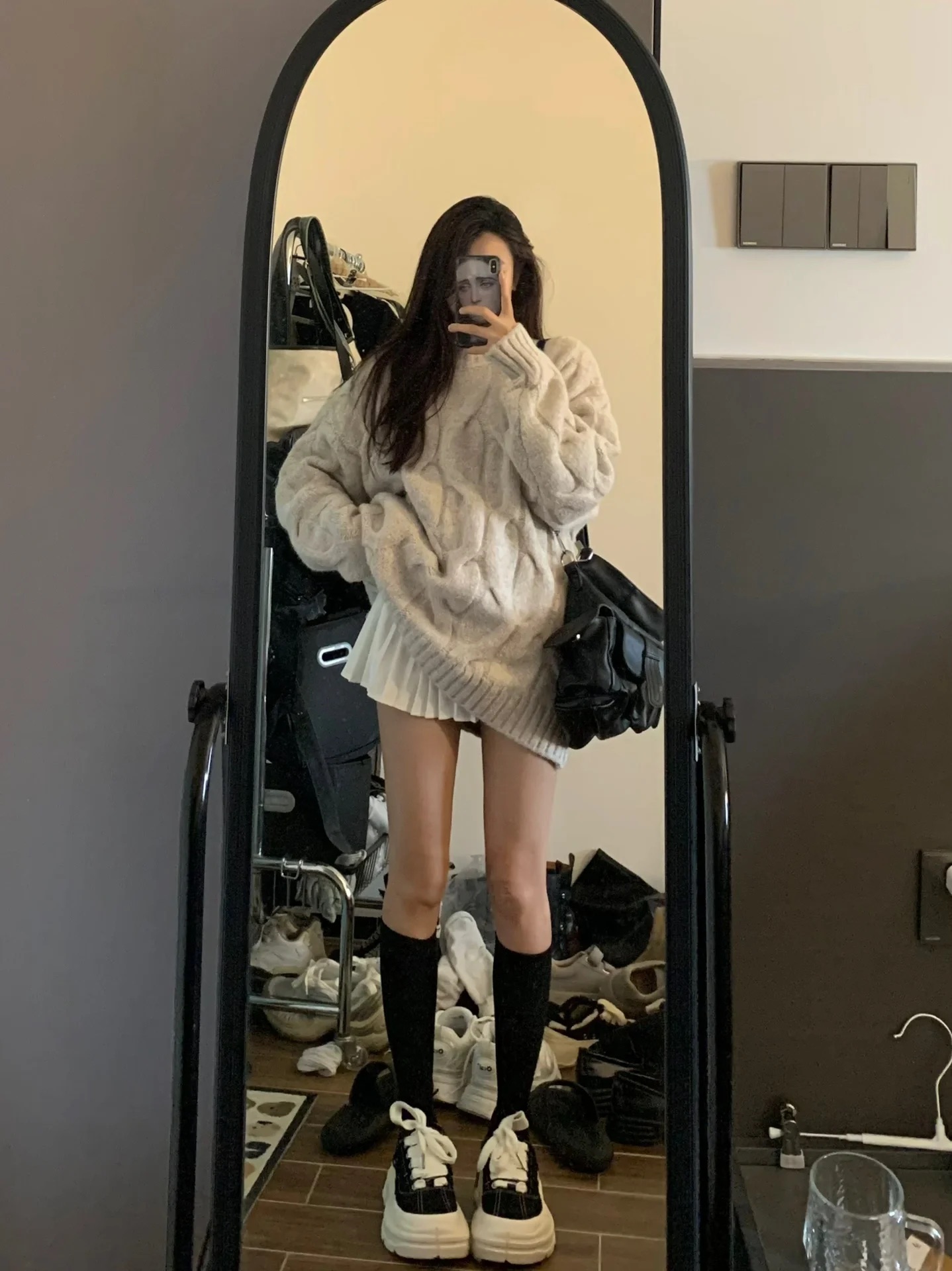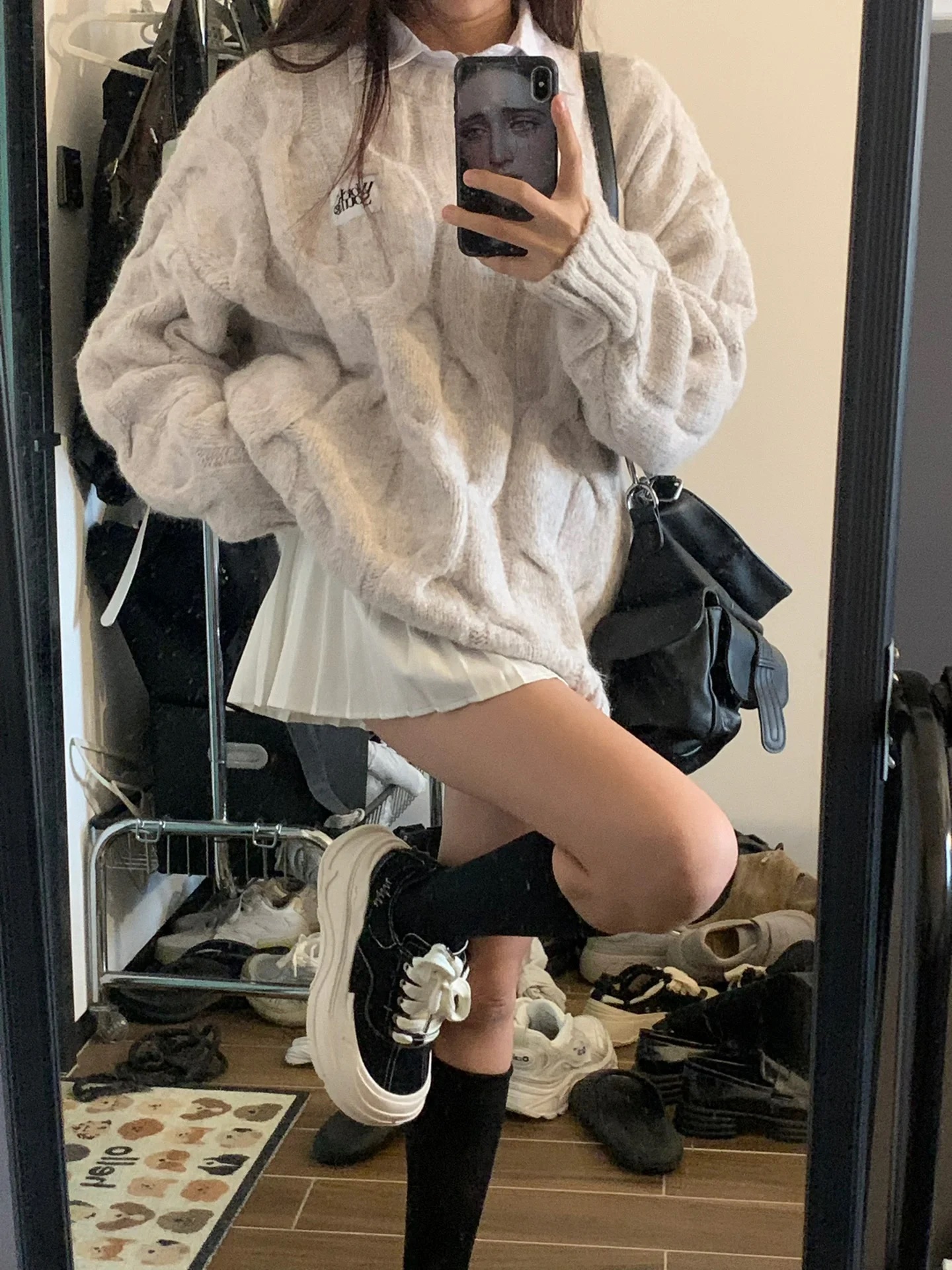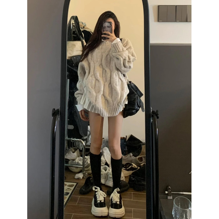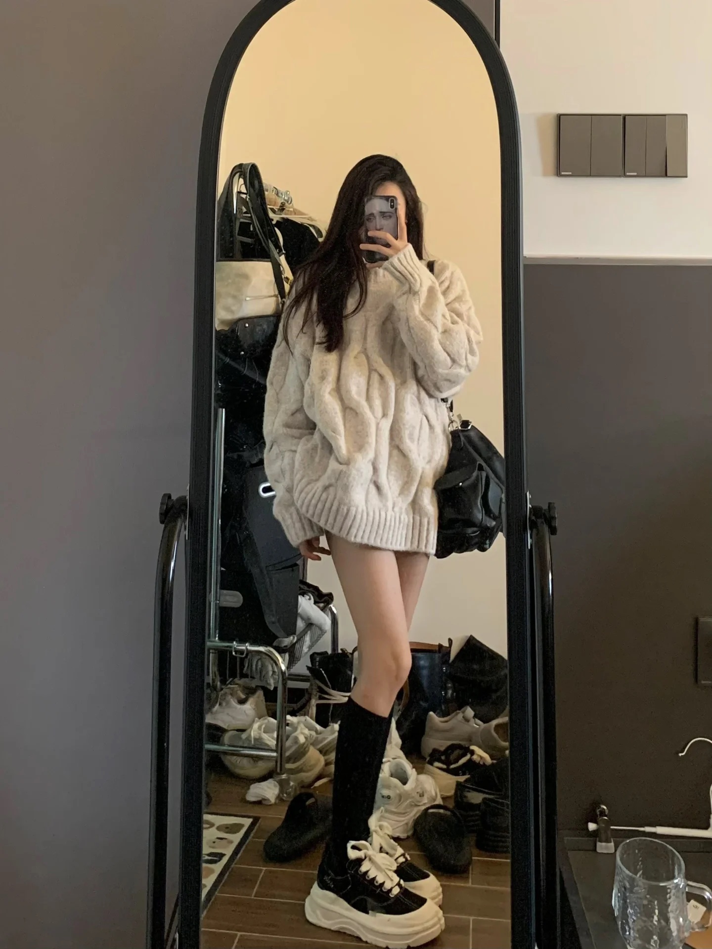 日系奶fufu麻花圓領毛衣女秋冬寬松慵懶風bf軟糯加厚針織衫外套潮