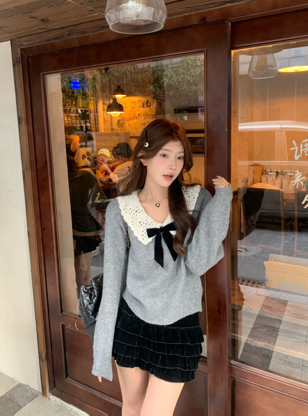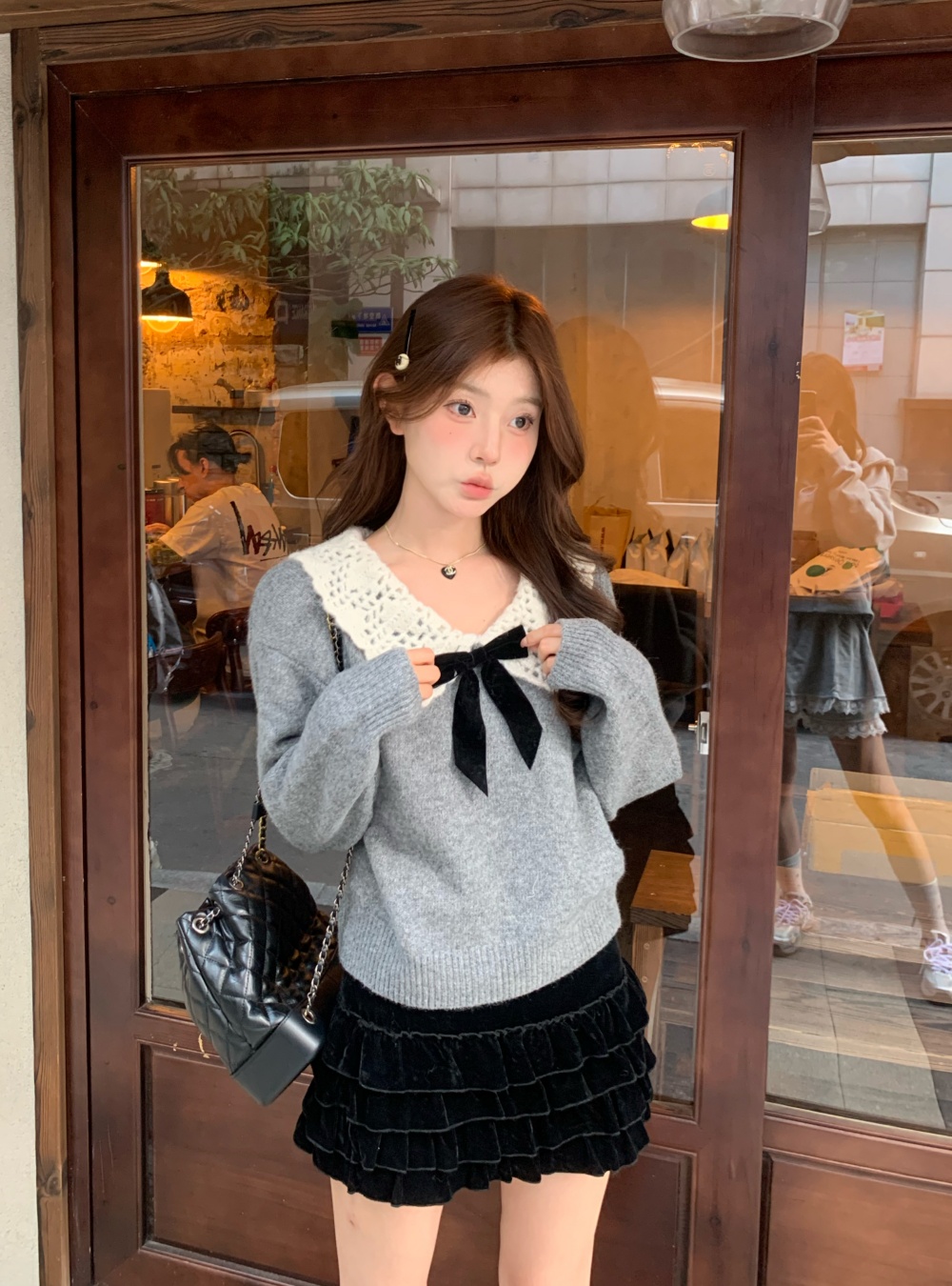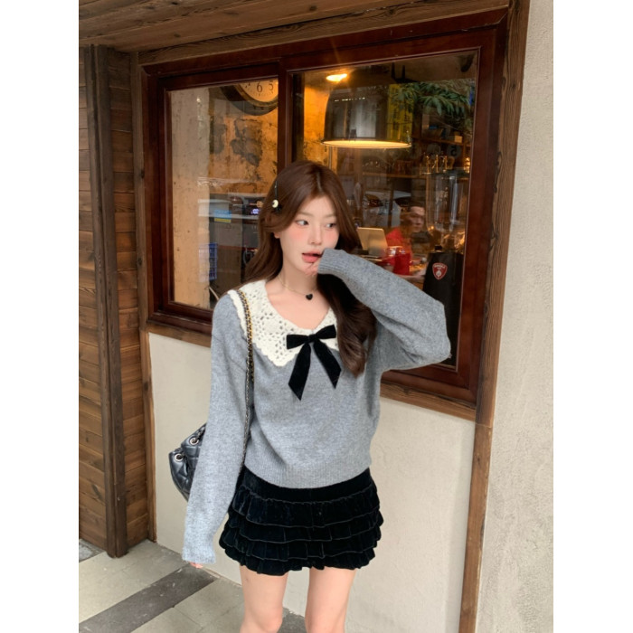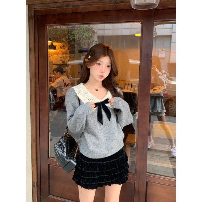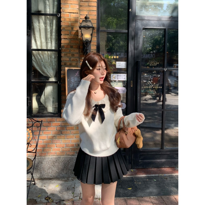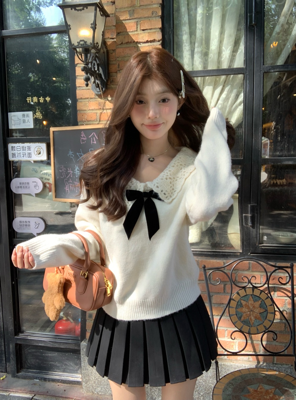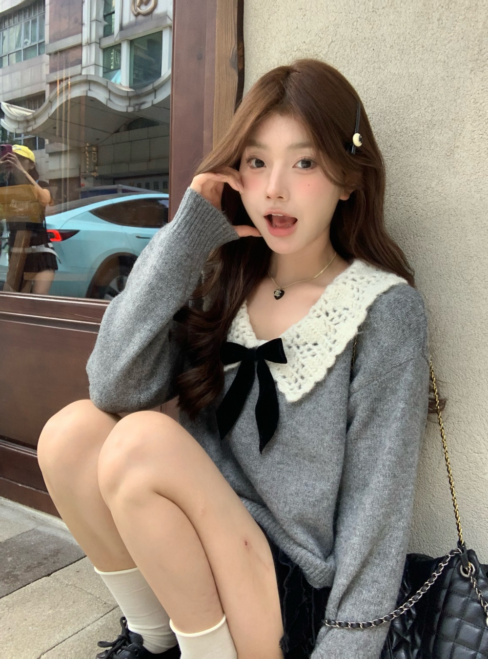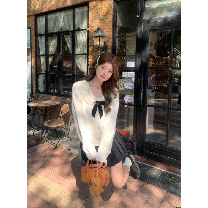 PPHOME溫柔蝴蝶結鏤空娃娃領針織衫女秋季軟糯寬松白色毛衣打底衫