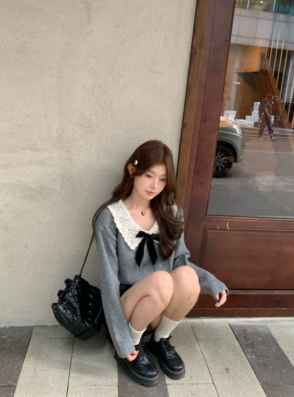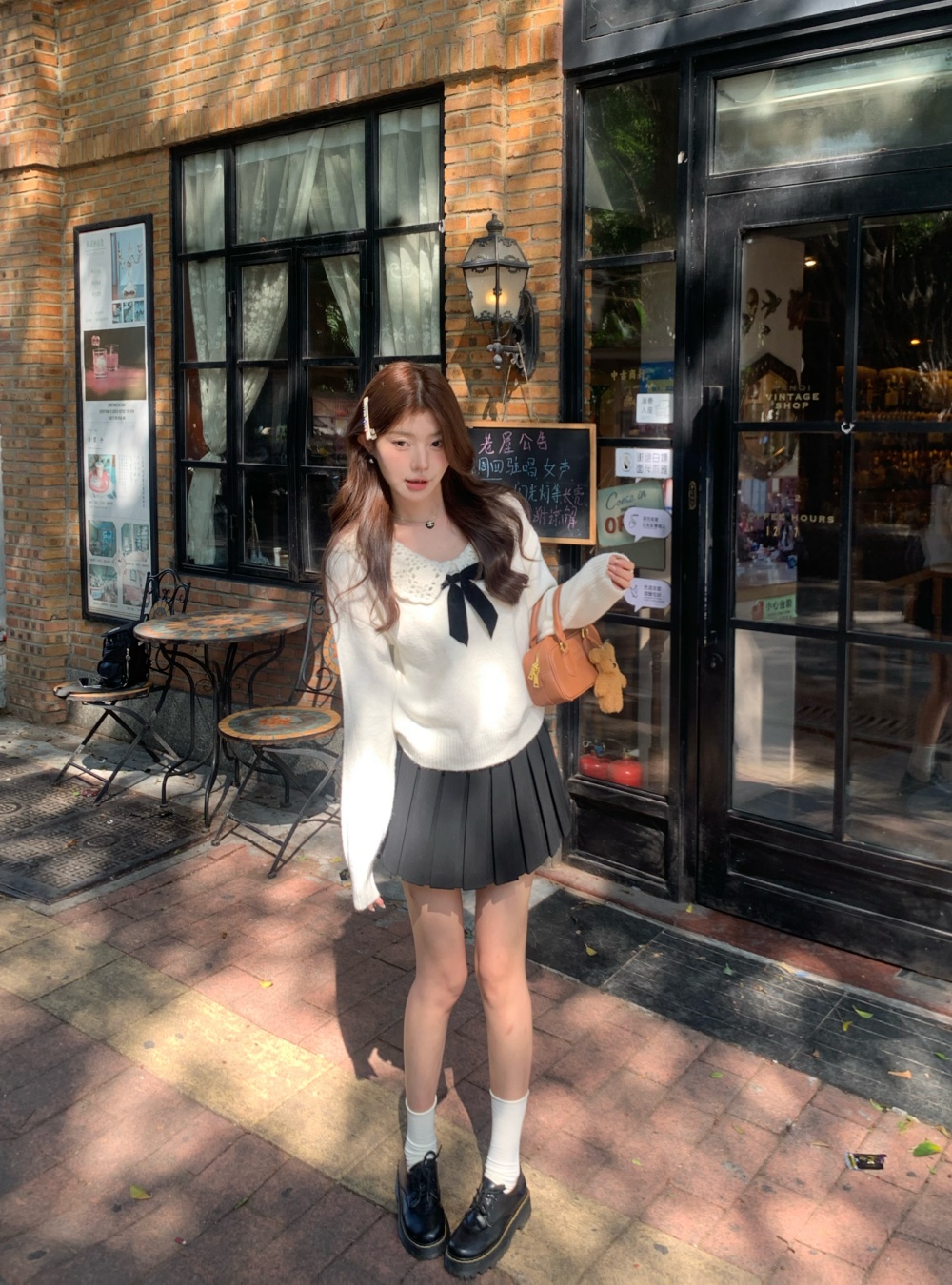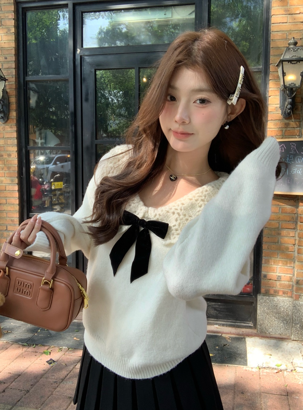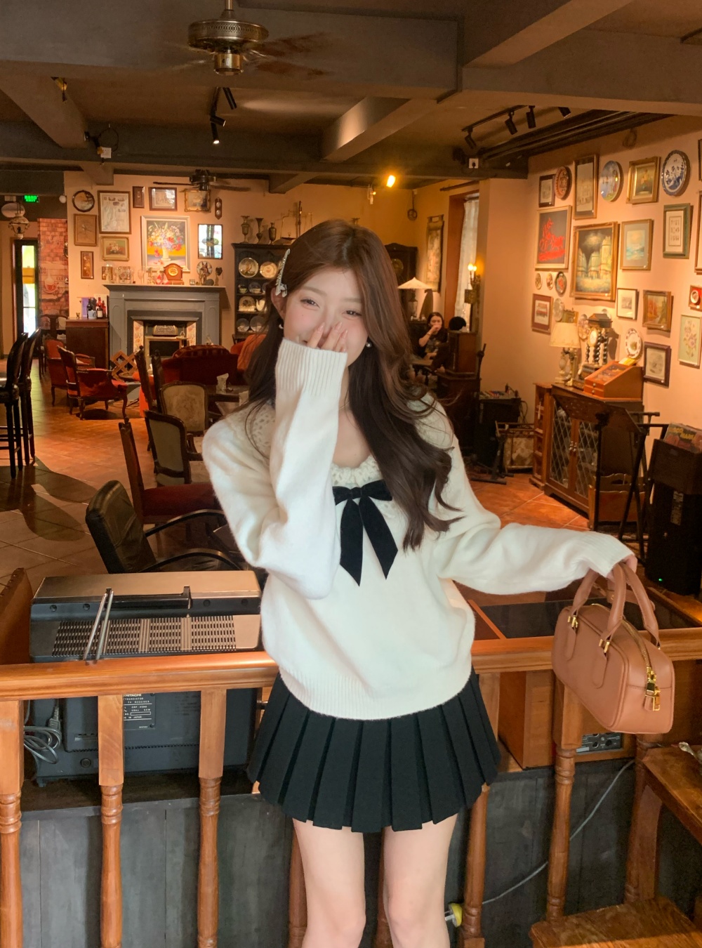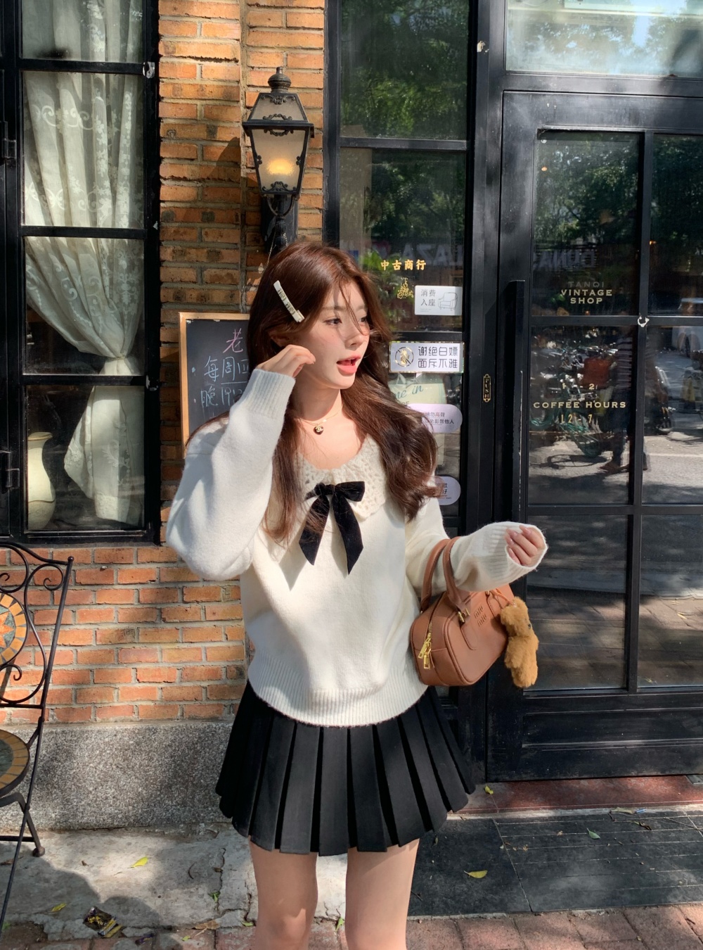 PPHOME溫柔蝴蝶結鏤空娃娃領針織衫女秋季軟糯寬松白色毛衣打底衫