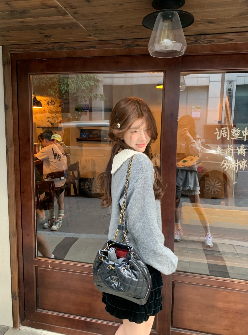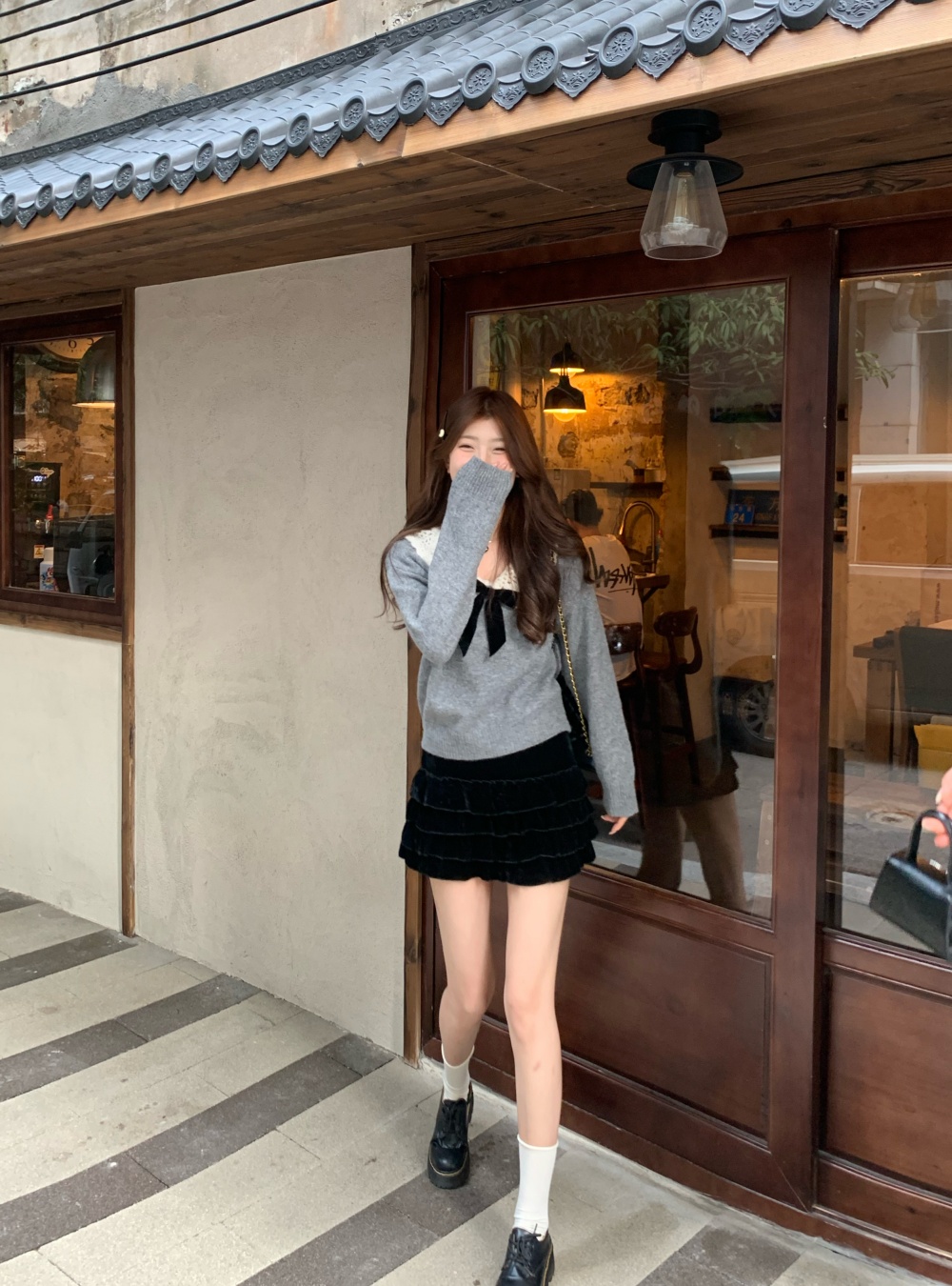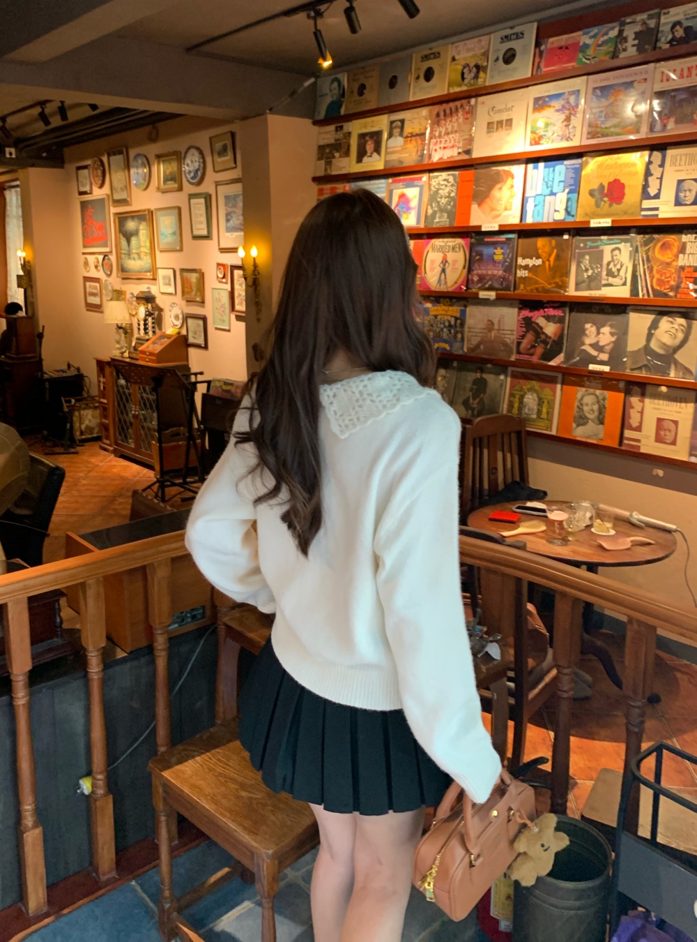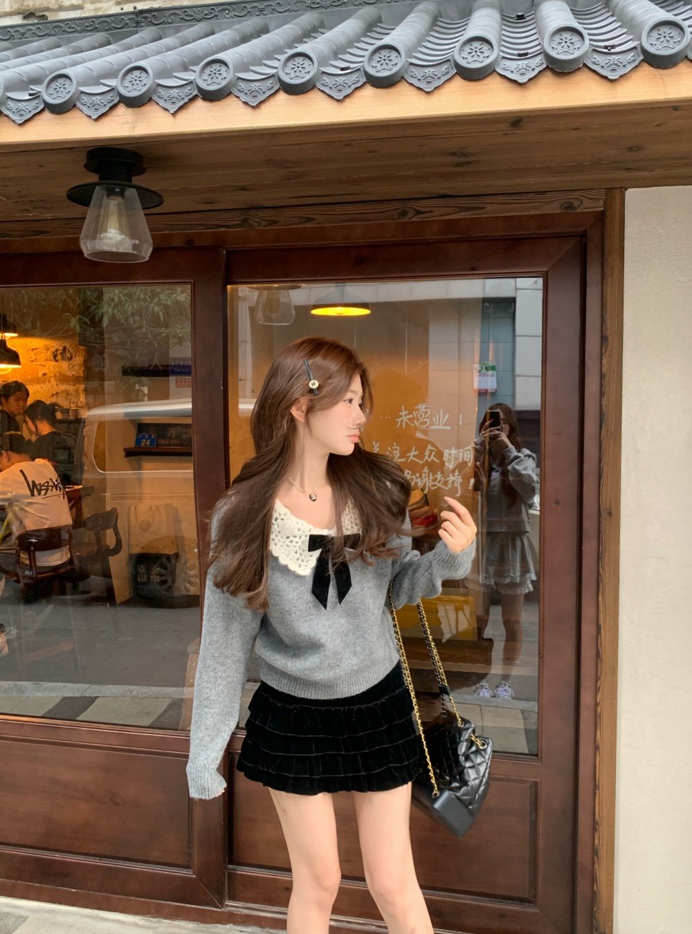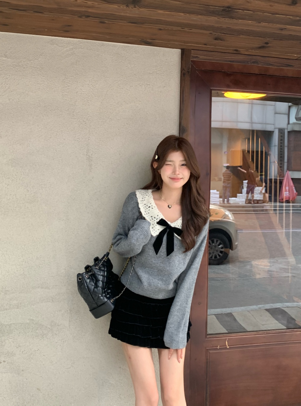 PPHOME溫柔蝴蝶結鏤空娃娃領針織衫女秋季軟糯寬松白色毛衣打底衫