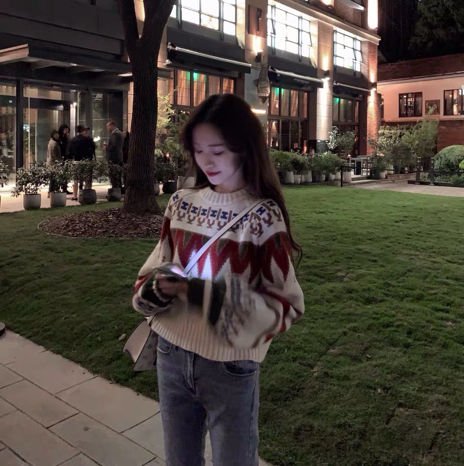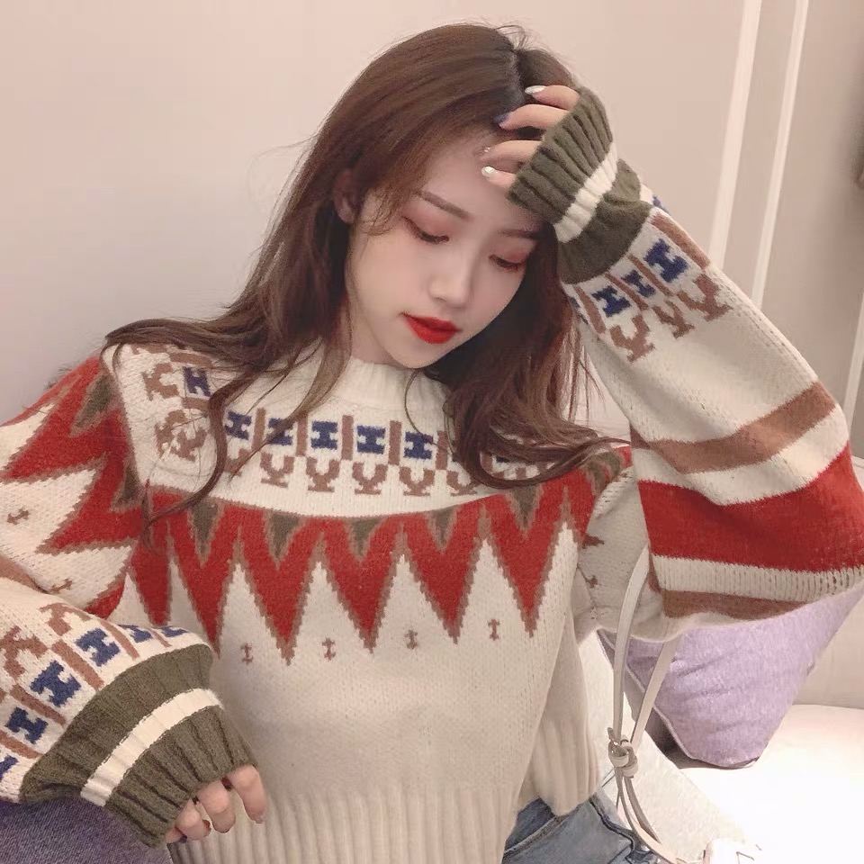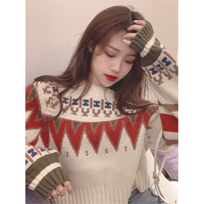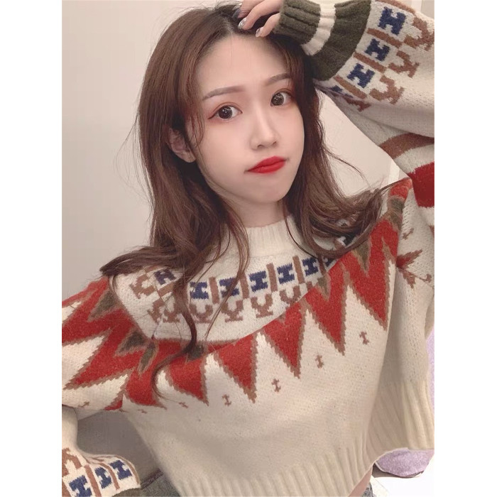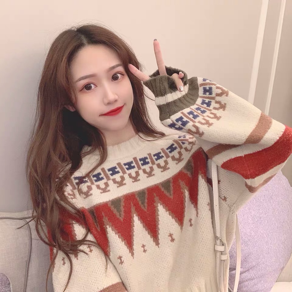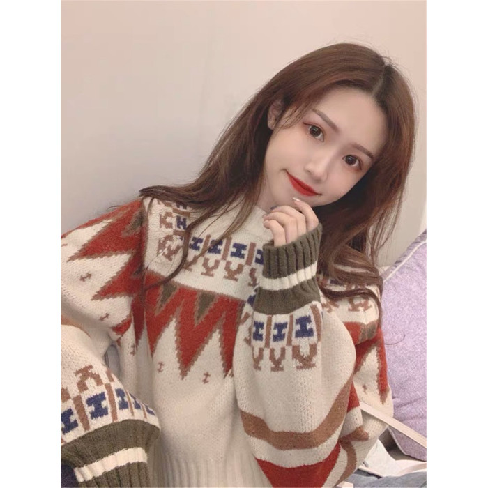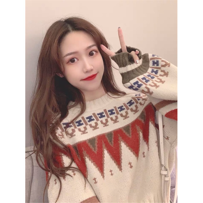 秋冬外穿韓版森系慵懶風撞色拼接寬松長袖針織提花圓領套頭毛衣女