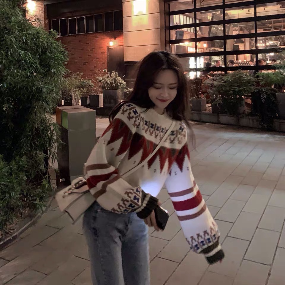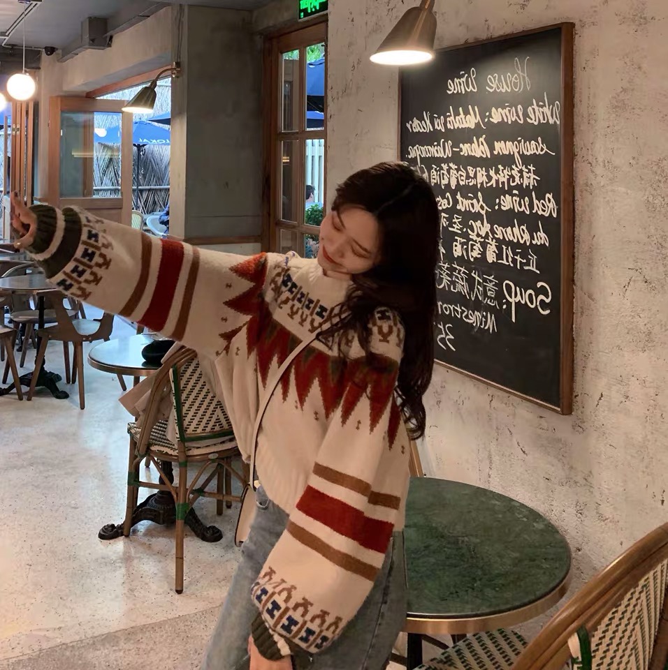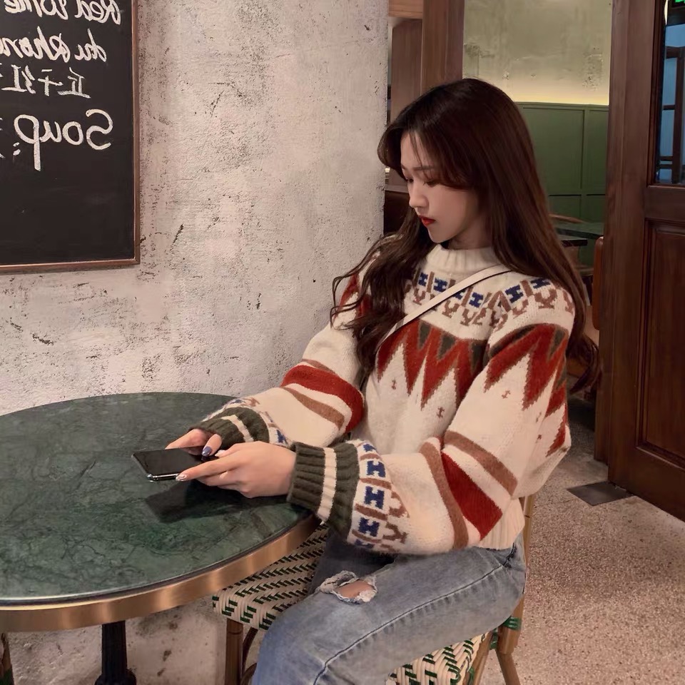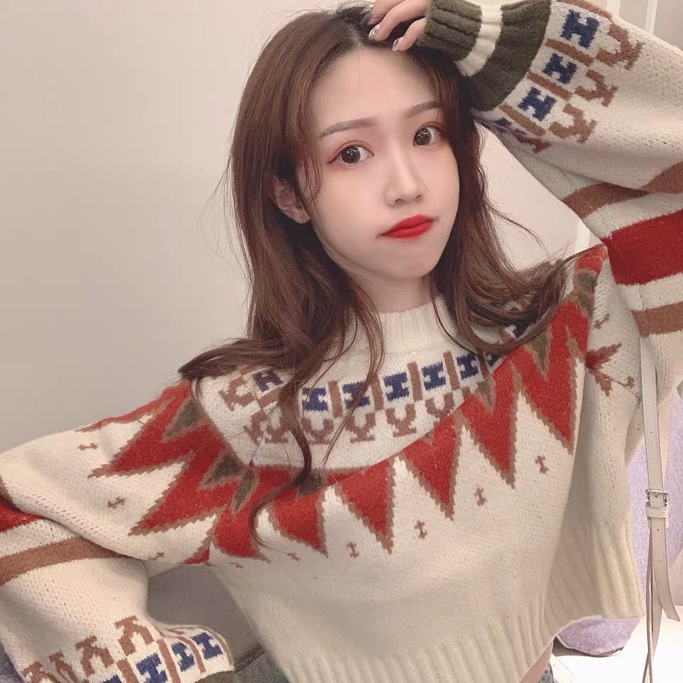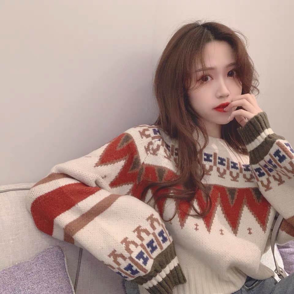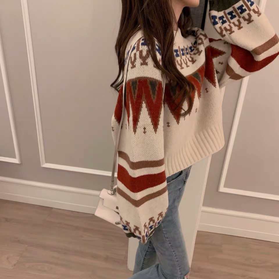 秋冬外穿韓版森系慵懶風撞色拼接寬松長袖針織提花圓領套頭毛衣女