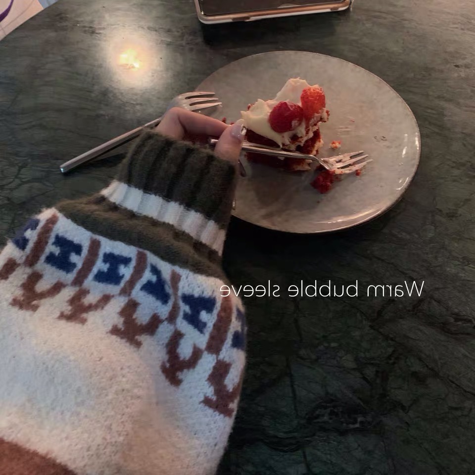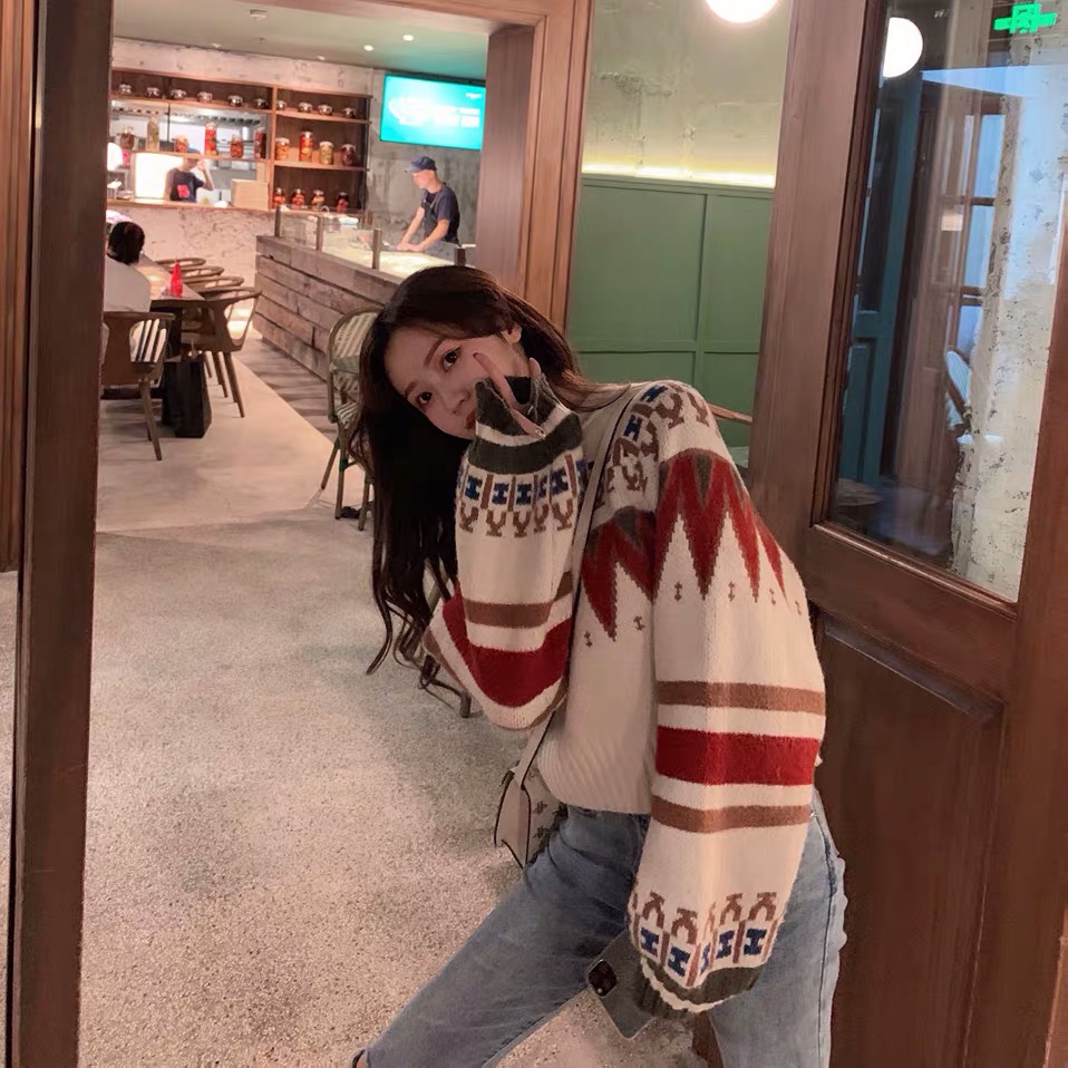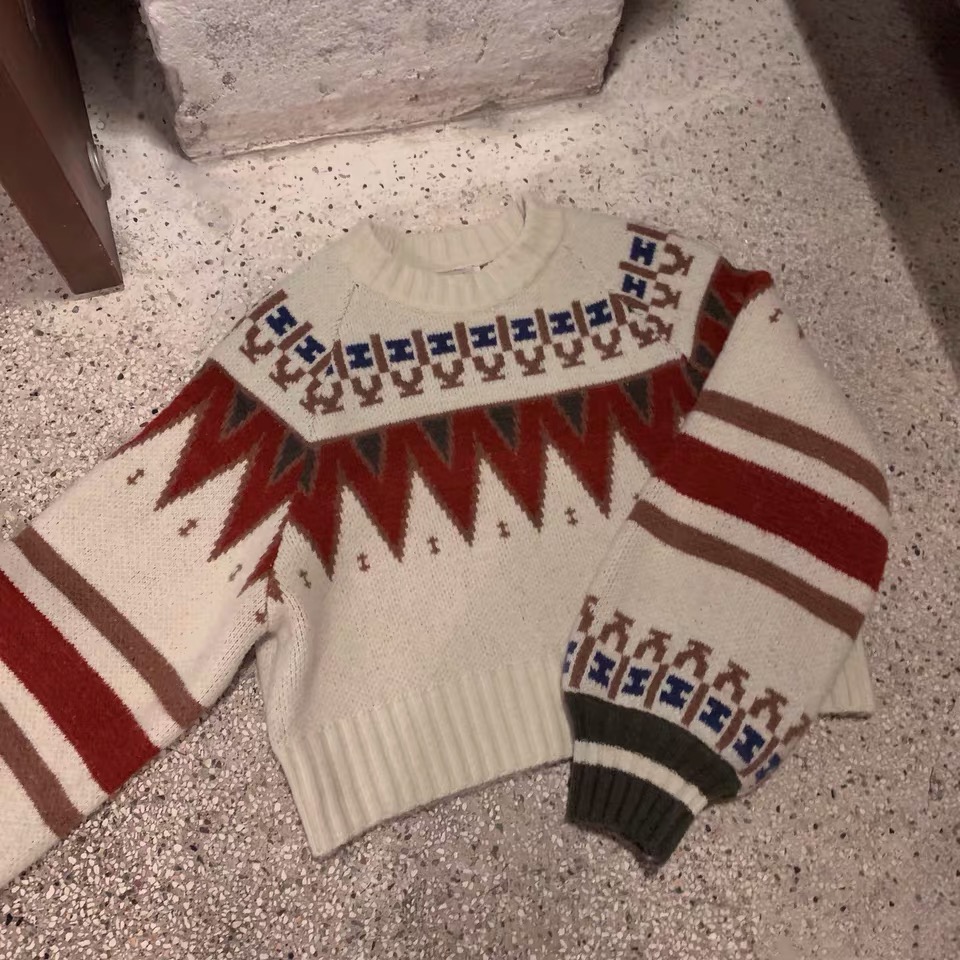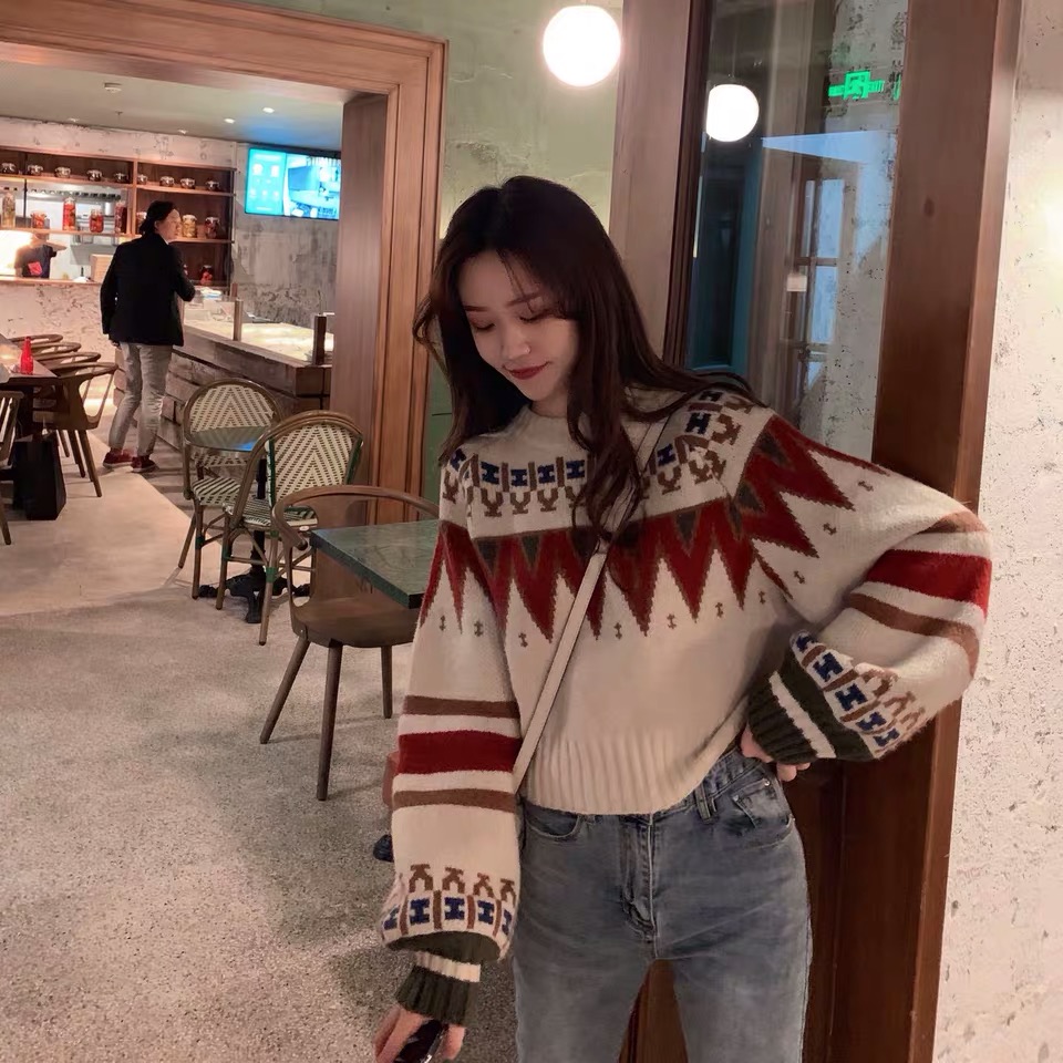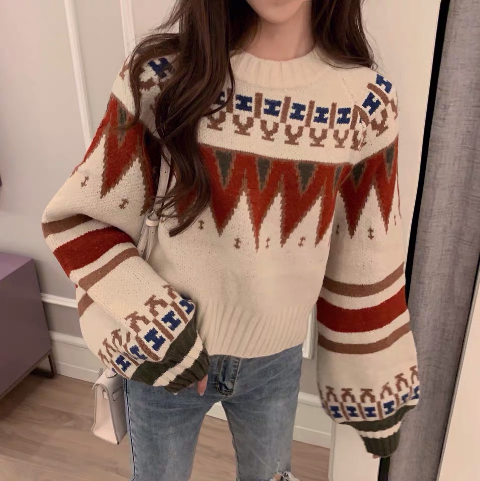 秋冬外穿韓版森系慵懶風撞色拼接寬松長袖針織提花圓領套頭毛衣女