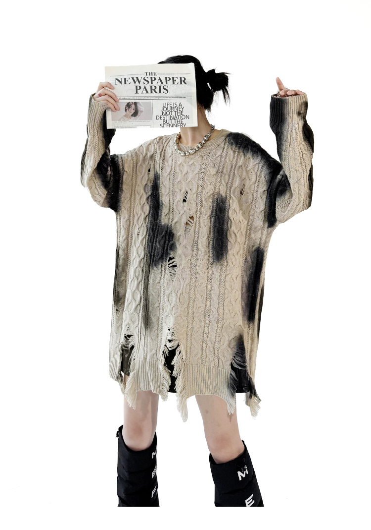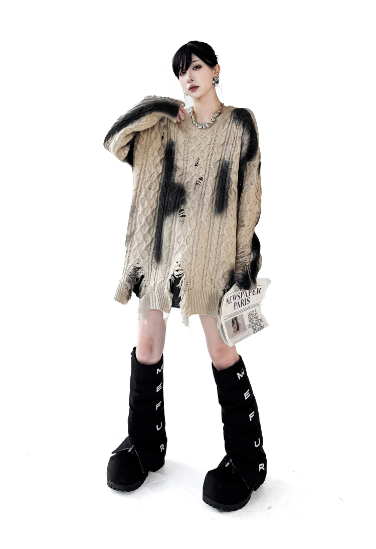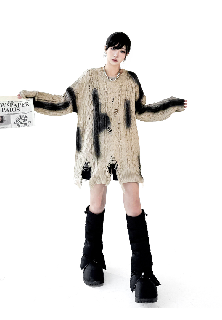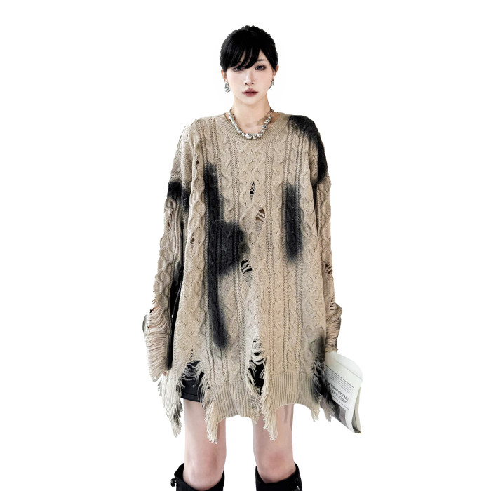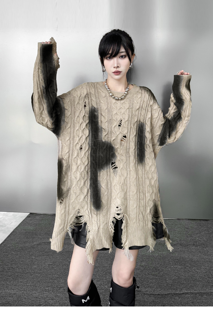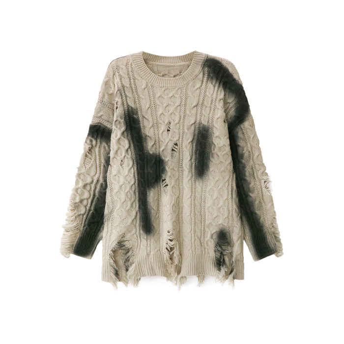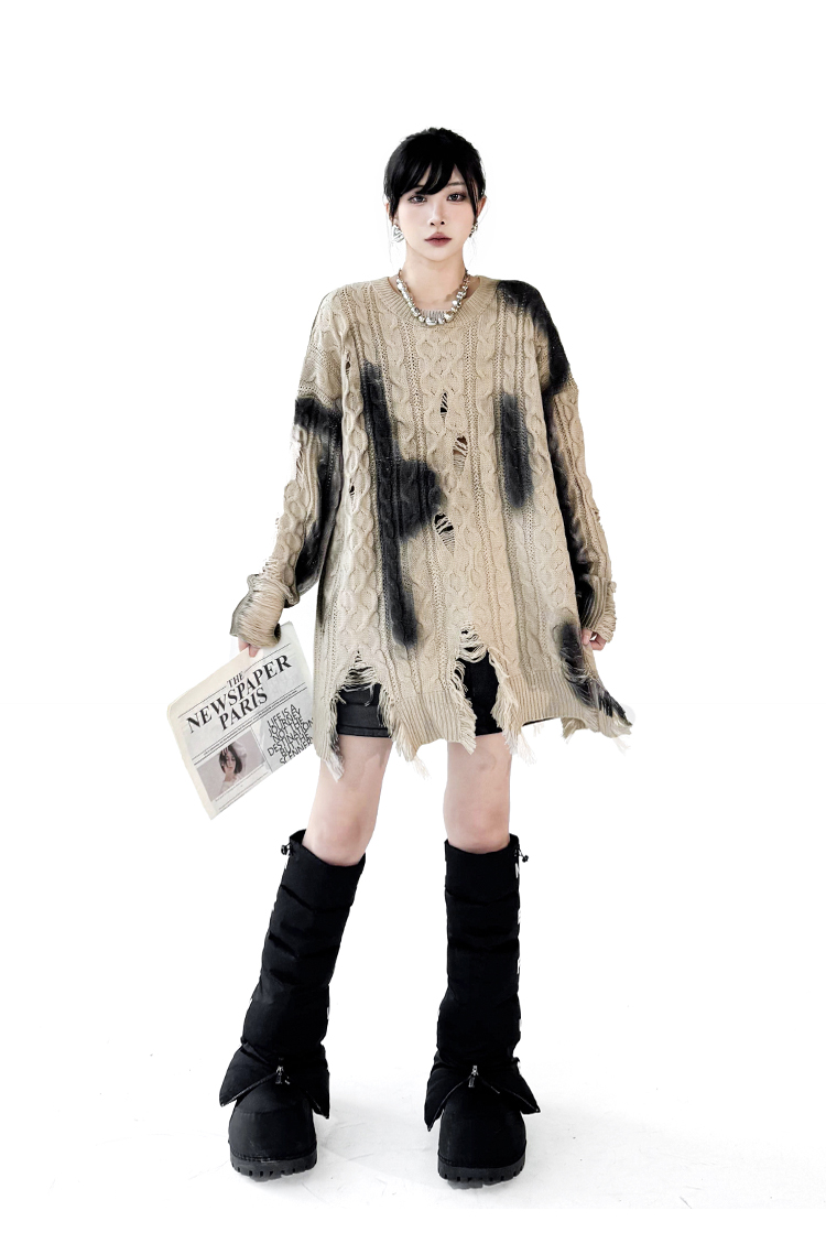 歐洲站小衆設計感時尚噴墨印花破洞毛衣2025秋冬款寬松針織衫上衣