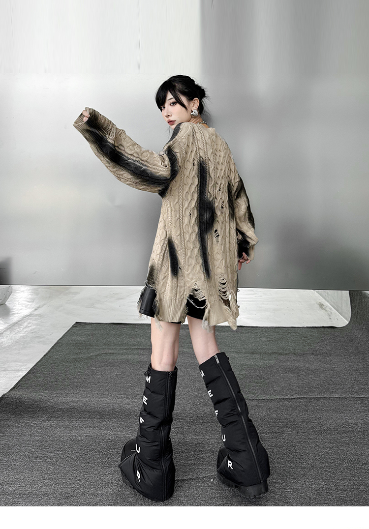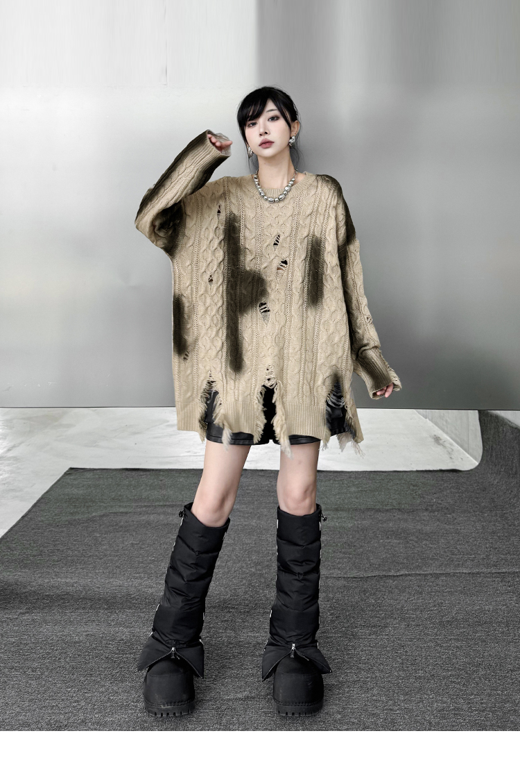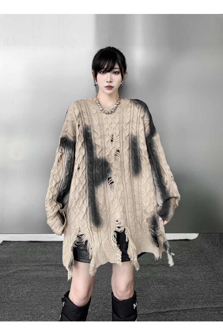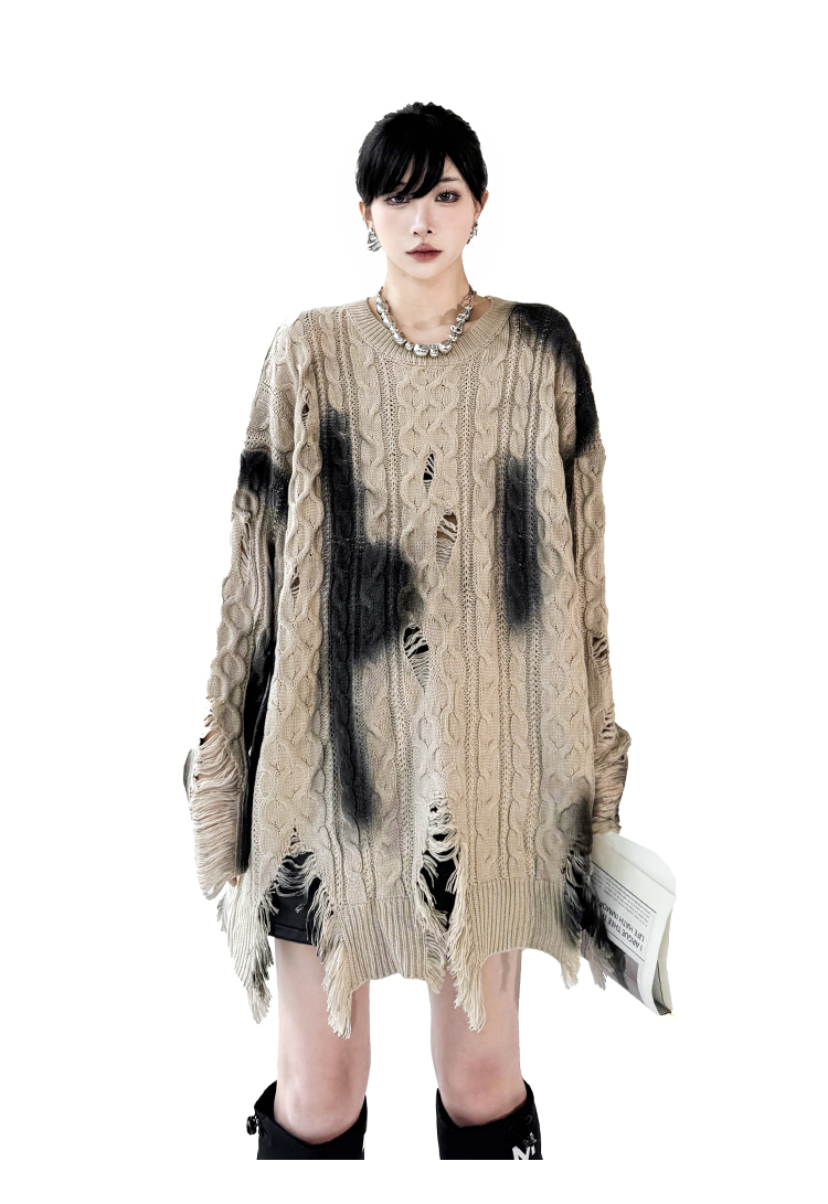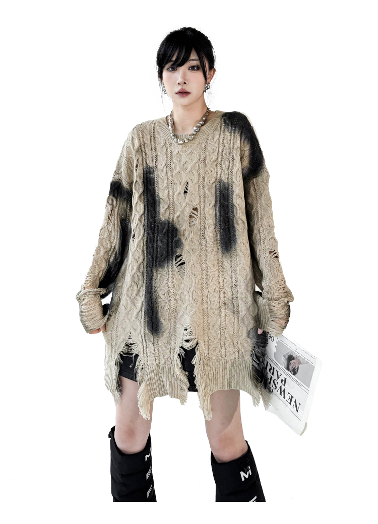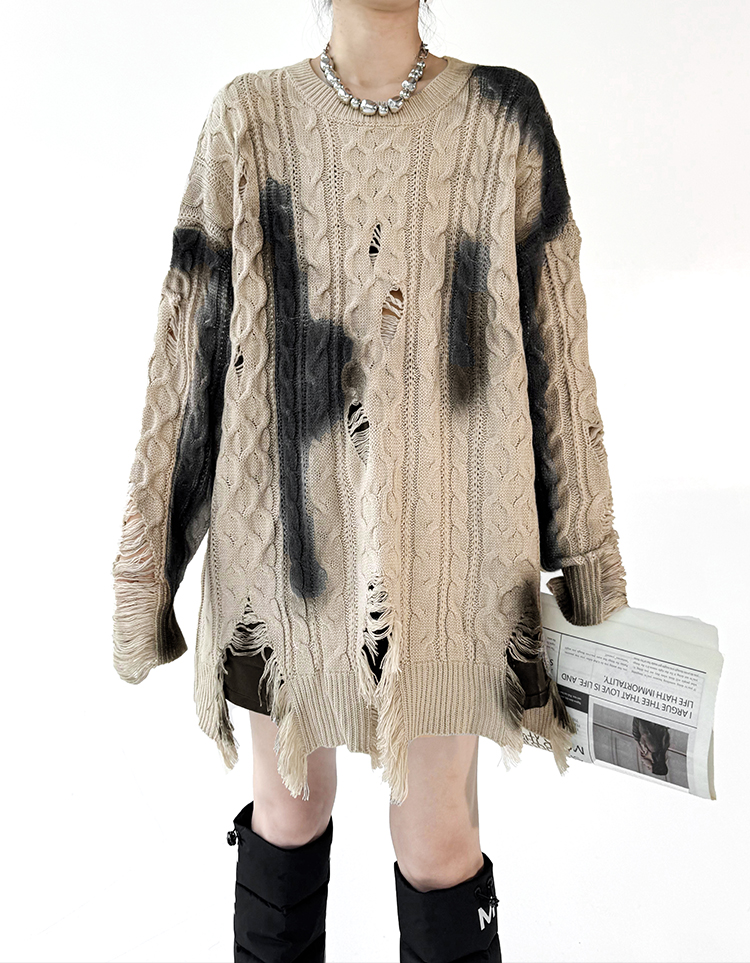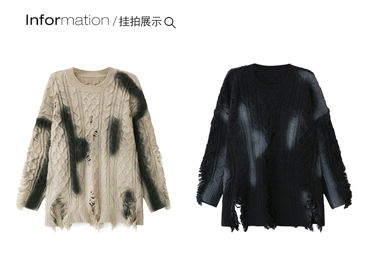 歐洲站小衆設計感時尚噴墨印花破洞毛衣2025秋冬款寬松針織衫上衣