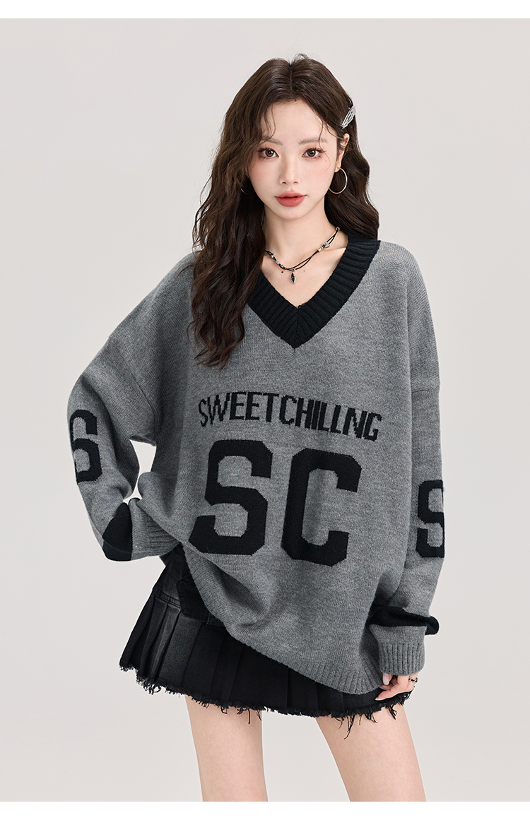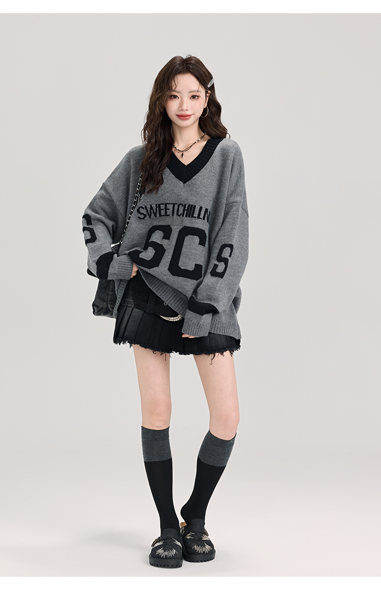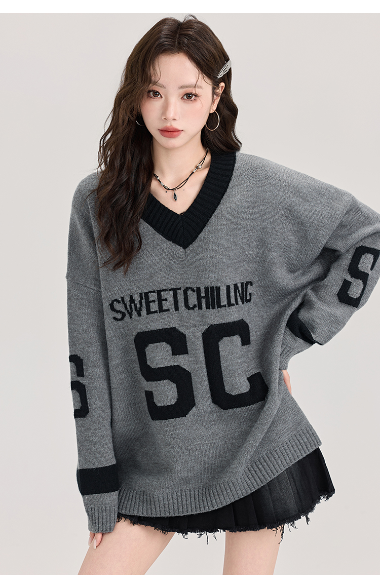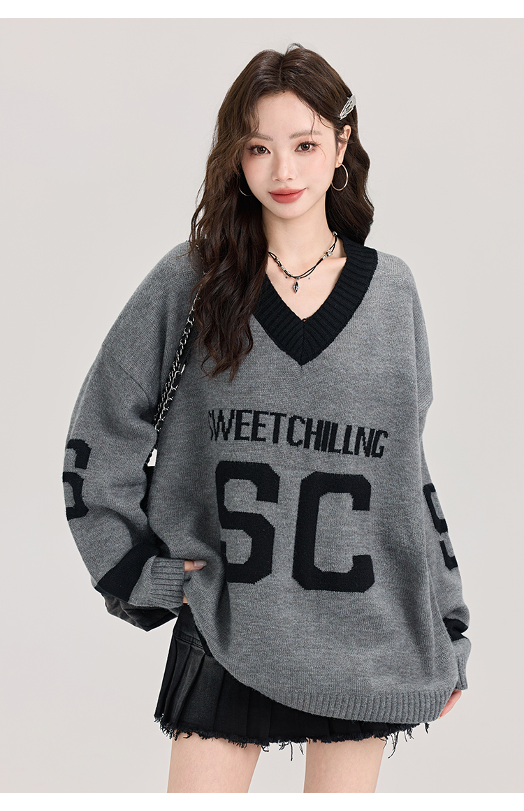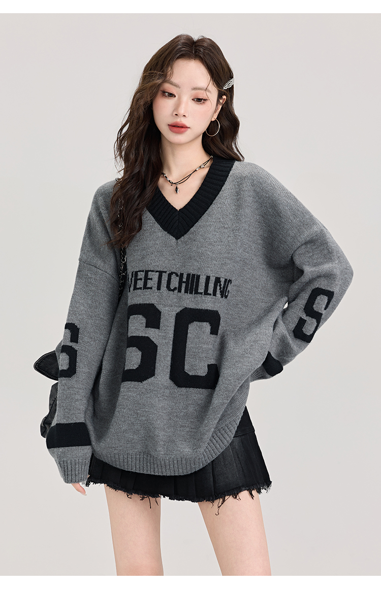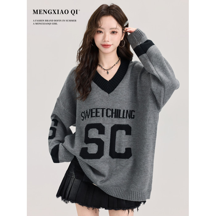 矇小柒慵懶風寬松灰色毛衣女秋冬季休閒字母V領針織上衣內搭打底
