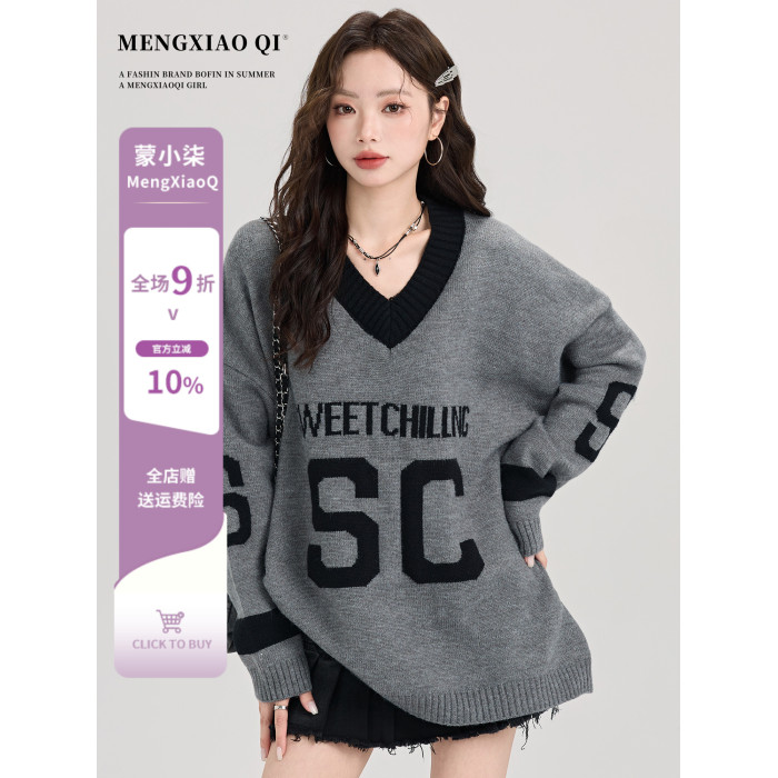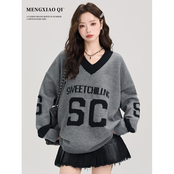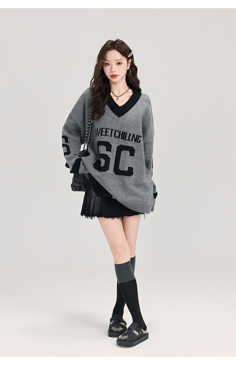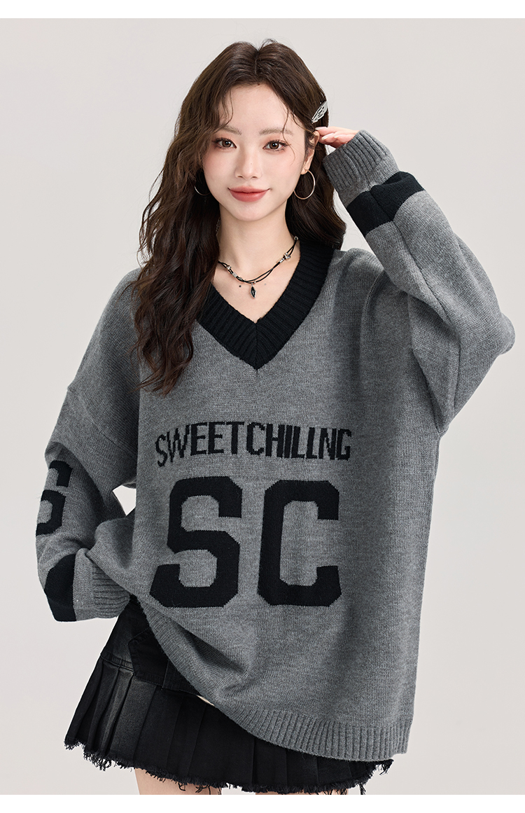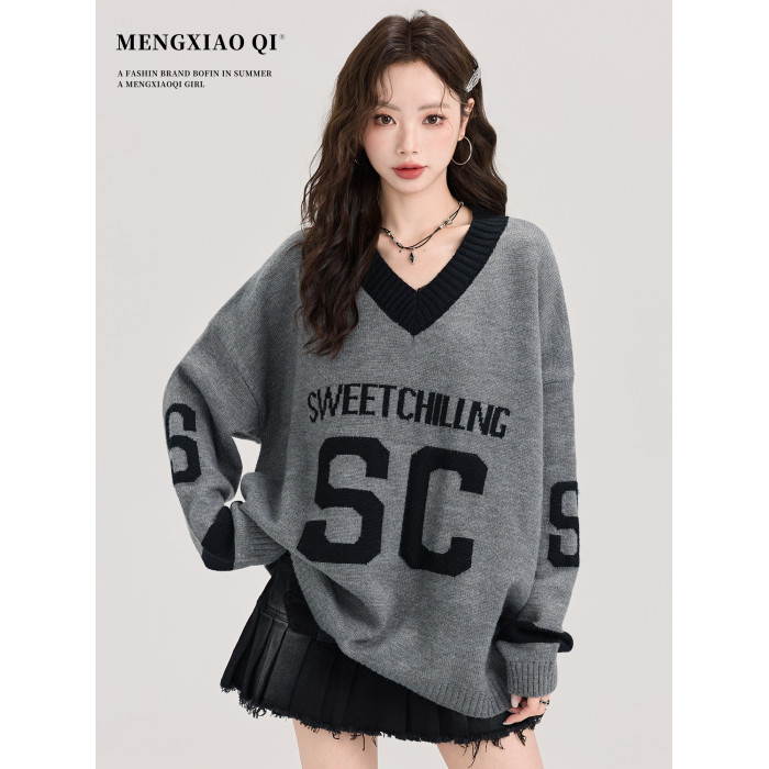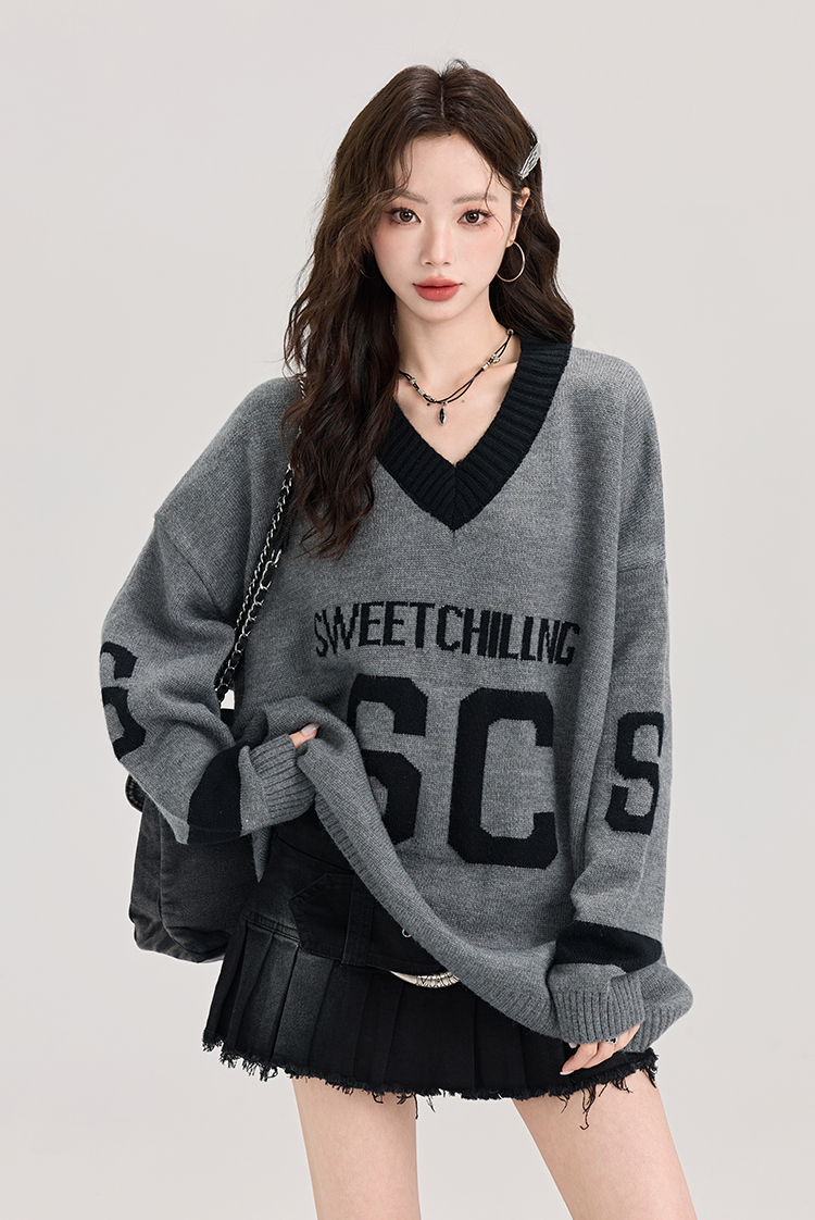 矇小柒慵懶風寬松灰色毛衣女秋冬季休閒字母V領針織上衣內搭打底