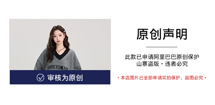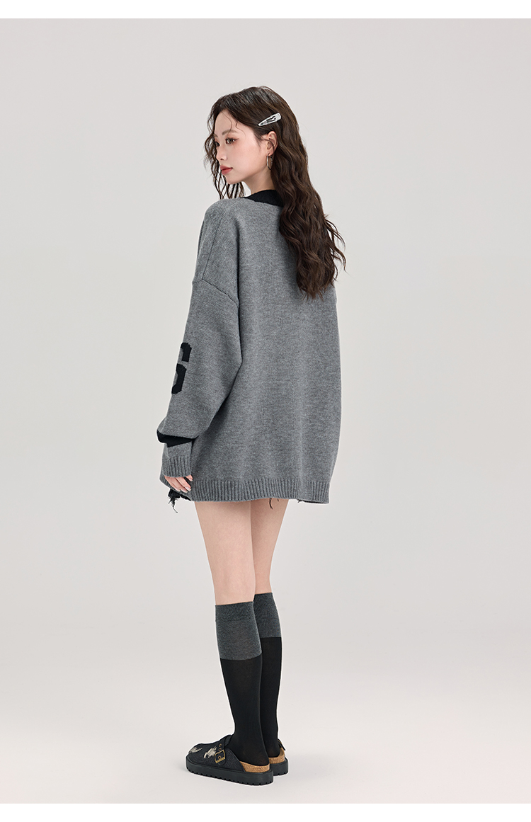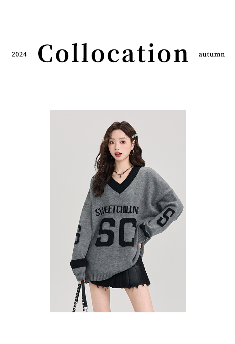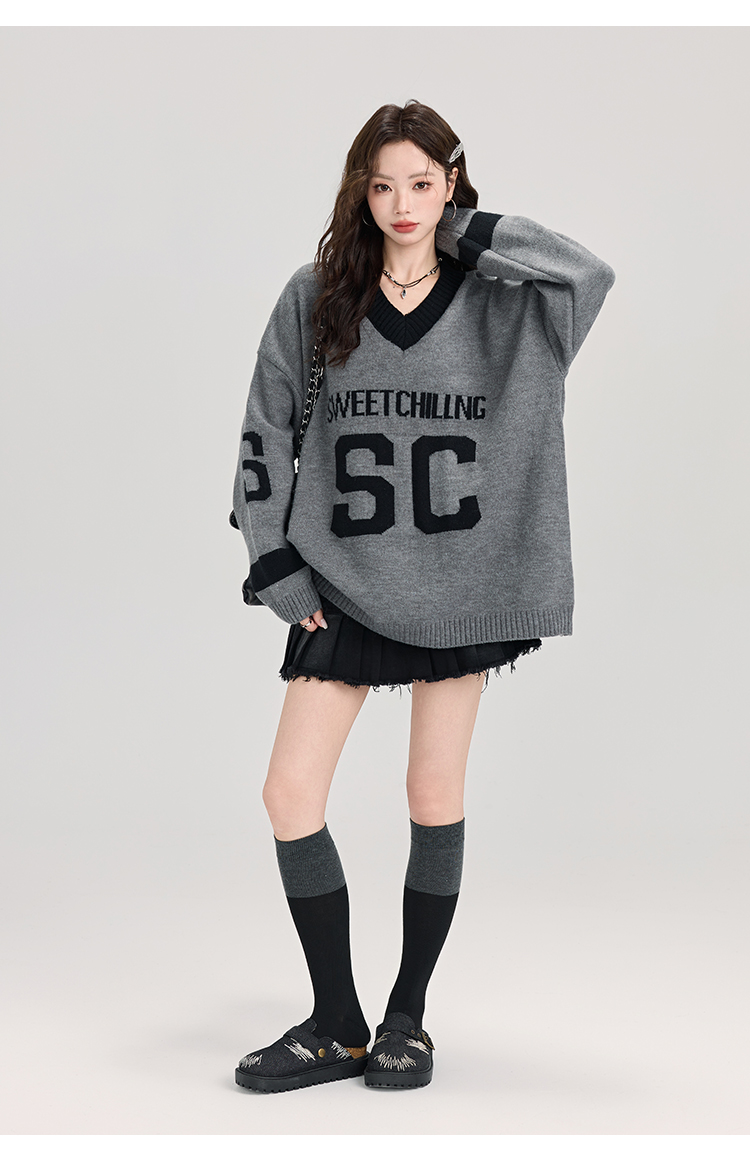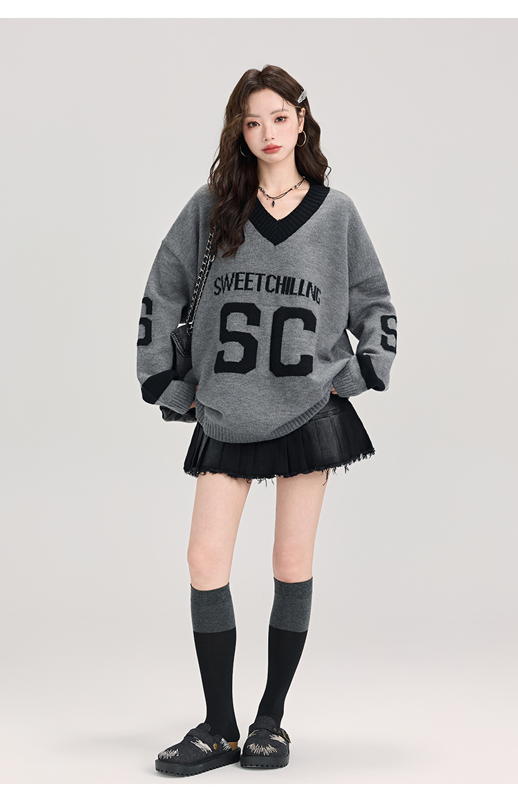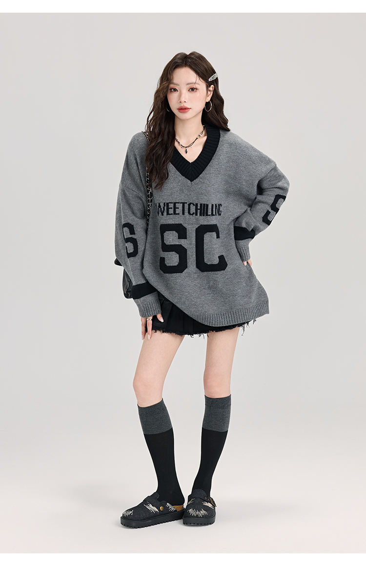 矇小柒慵懶風寬松灰色毛衣女秋冬季休閒字母V領針織上衣內搭打底